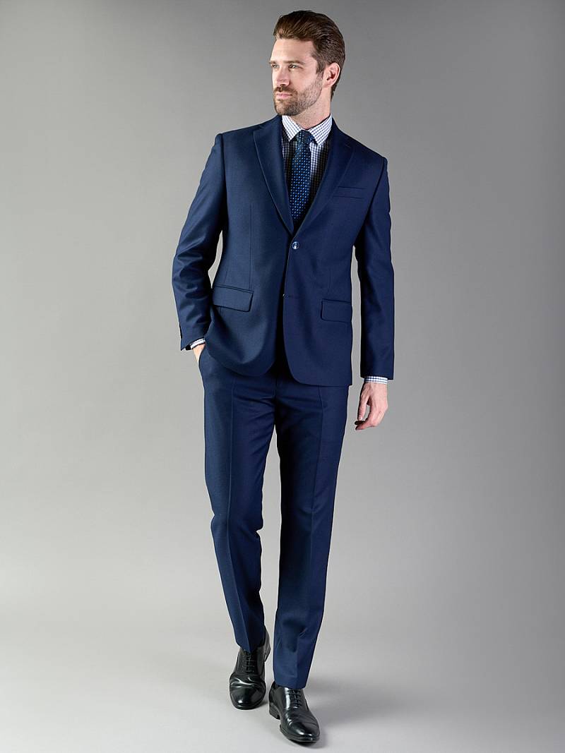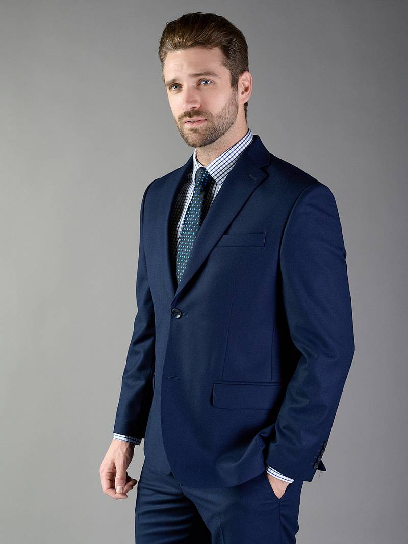 Классический костюм двойка Classic fit. Пиджак на две пуговицы, с боковыми и нагрудным карманами, по спинке две шлицы. Брюки без защипов с боковыми и одним задним карманом.