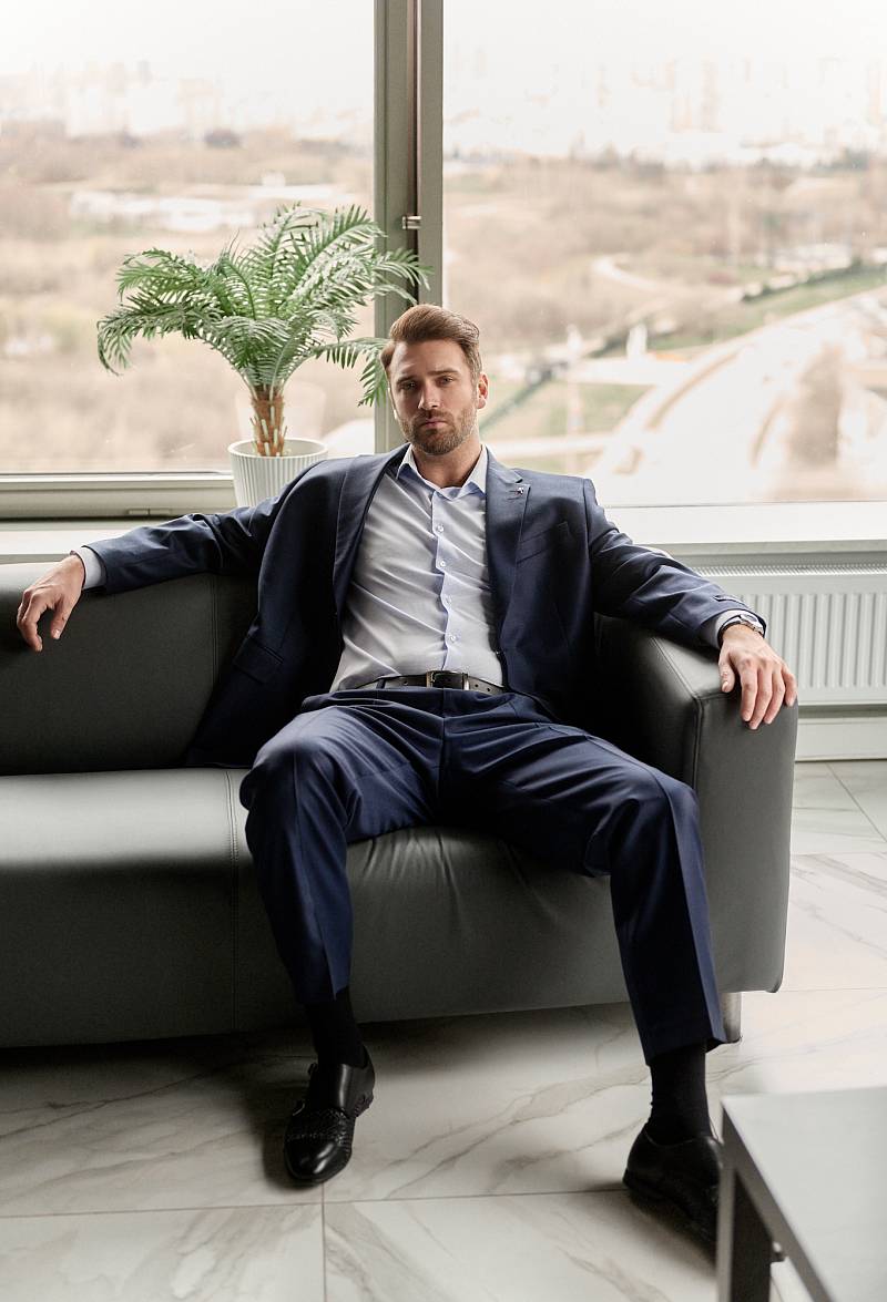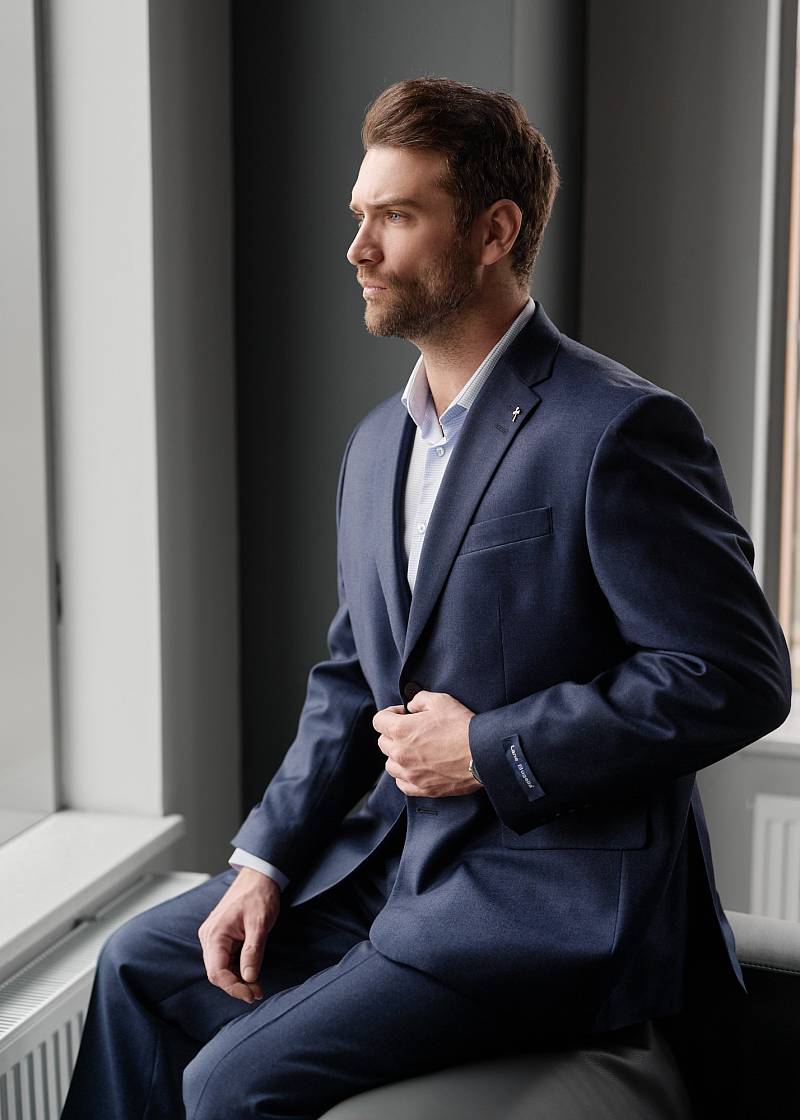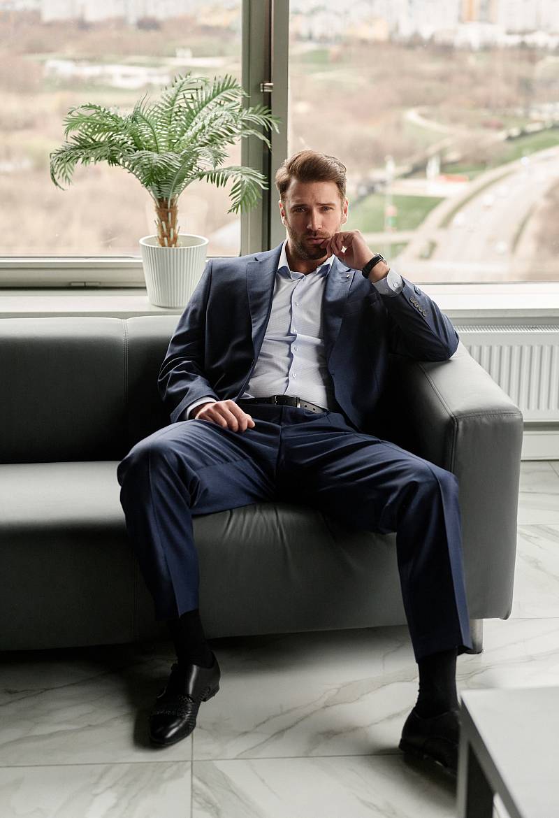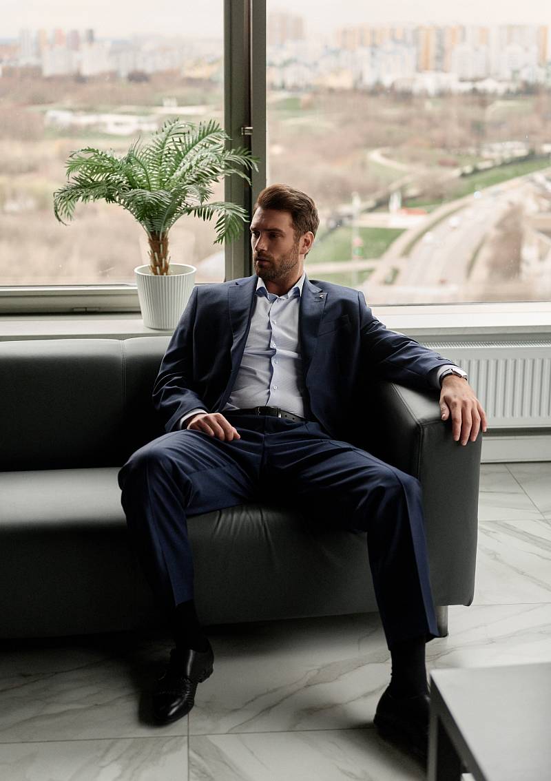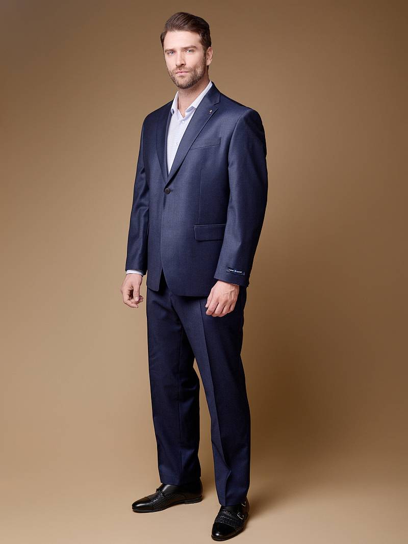 Классический костюм двойка Classic fit (ПОЛУПРИЛЕГАЮЩИЙ СИЛУЭТ). Пиджак однобортный на две пуговицы, с двумя боковыми карманами с клапанами и нагрудной листочкой. Рукава втачные, двухшовные со шлицей и четырьмя декоративными пуговицами. По спинке расположены две шлицы. Пиджак на подкладке, с двумя внутренними карманами. Брюки без защипов, с боковыми наклонными карманами и двумя задними карманами «в рамку». Передние половинки на подкладке. Верхний срез брюк обработан поясом с корсажной лентой и шлевками под ремень. Застежка обработана на тесьму-молнию, с петлей-пуговицей на поясе и усилен металлическим крючком.