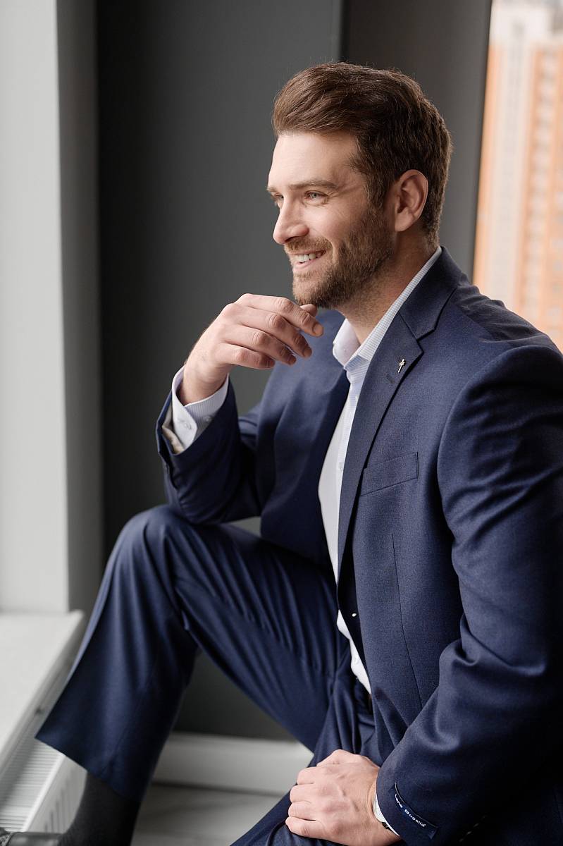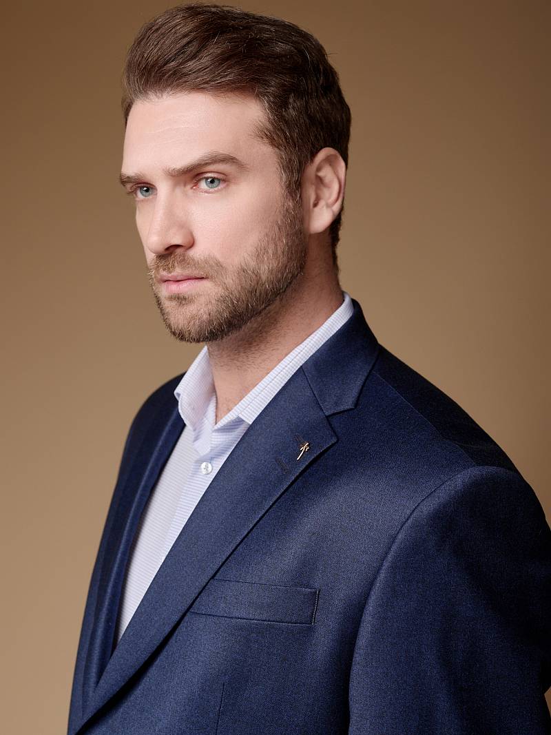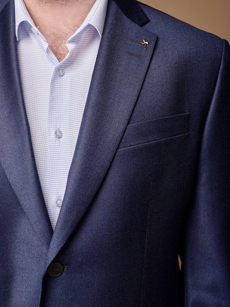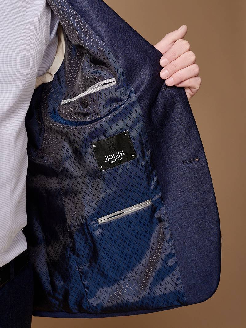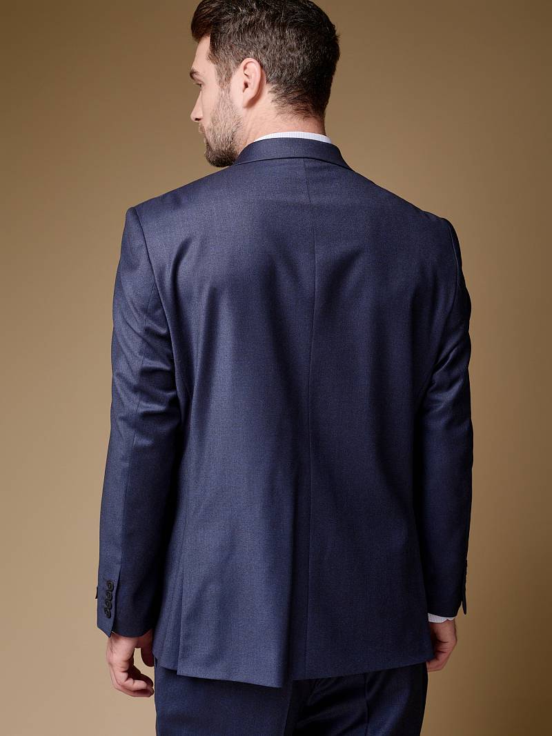 Классический костюм двойка Classic fit (ПОЛУПРИЛЕГАЮЩИЙ СИЛУЭТ). Пиджак однобортный на две пуговицы, с двумя боковыми карманами с клапанами и нагрудной листочкой. Рукава втачные, двухшовные со шлицей и четырьмя декоративными пуговицами. По спинке расположены две шлицы. Пиджак на подкладке, с двумя внутренними карманами. Брюки без защипов, с боковыми наклонными карманами и двумя задними карманами «в рамку». Передние половинки на подкладке. Верхний срез брюк обработан поясом с корсажной лентой и шлевками под ремень. Застежка обработана на тесьму-молнию, с петлей-пуговицей на поясе и усилен металлическим крючком.