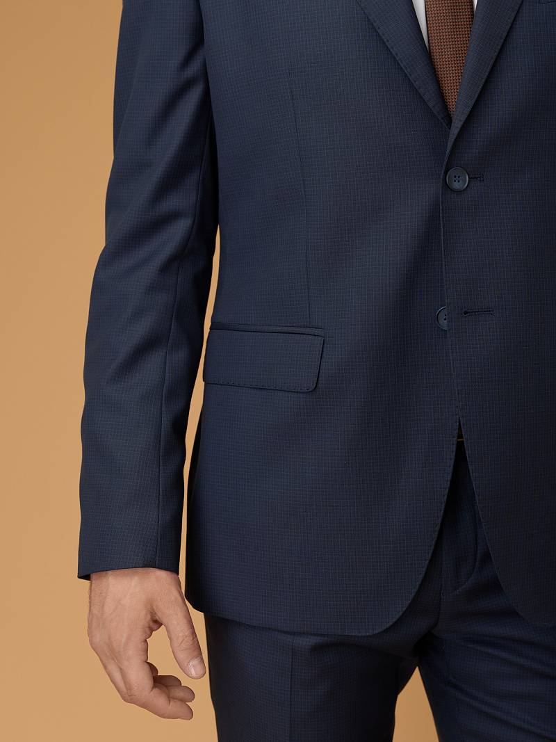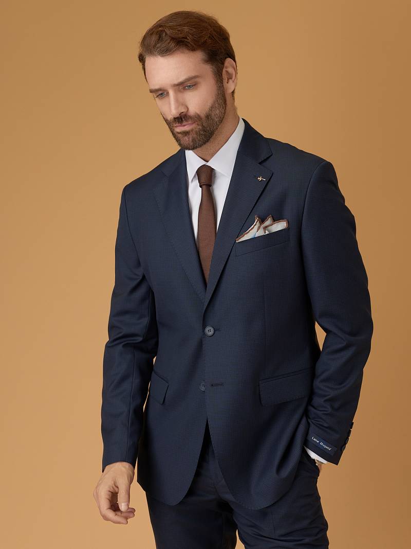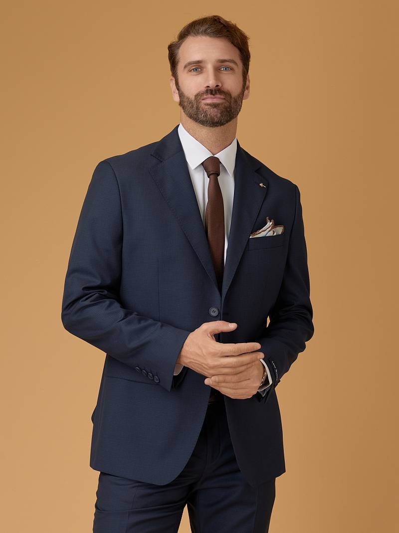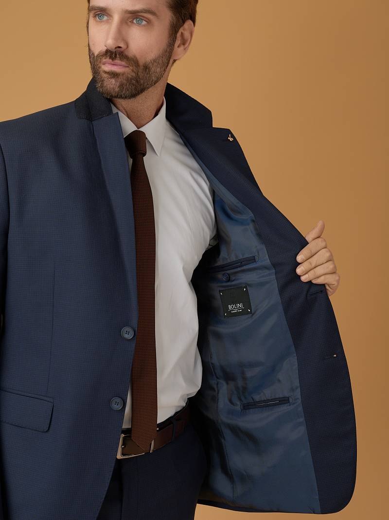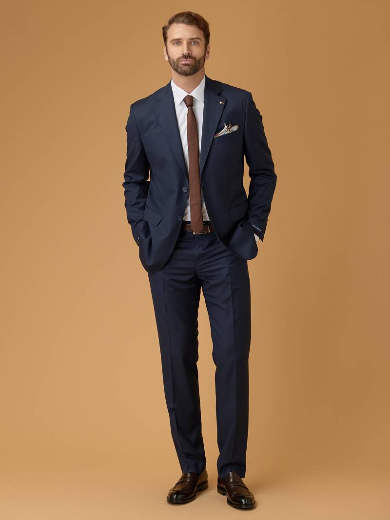 Classic fit (ПОЛУПРИЛЕГАЮЩИЙ СИЛУЭТ). Классический костюм двойка марки BOLINI– это идеальное сочетание стиля и комфорта для мужчин. Для пошива лаконичного темно-синего, однотонного костюма использовали премиальную шерсть высокого качества. Пиджак с классической шириной лацкана и мягкой линией плеч отлично сядет по фигуре, а расположенные по спинке две шлицы обеспечат дополнительный комфорт и свободу движения. Для придания образу торжественности подкладку нагрудного кармана можно использовать как платок-паше. Лацканы украсили небольшим значком в виде эмблемы бренда. Обработан пиджак шелковой подкладкой с двумя внутренними карманами. Брюки прямого кроя со стрелками и заниженной посадкой, с боковыми наклонными карманами и двумя задними карманами "в рамку". Верхний срез брюк обработан поясом с корсажной лентой и шлевками под ремень. Дизайнеры марки BOLINI тщательно подходят к выбору материалов. Пуговицы подбираются и красятся индивидуально под каждую ткань, а прикладные материалы используют только от передовых п