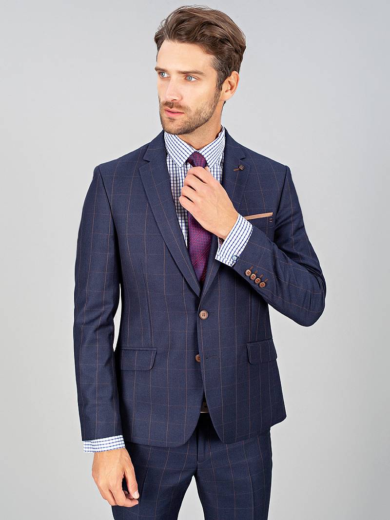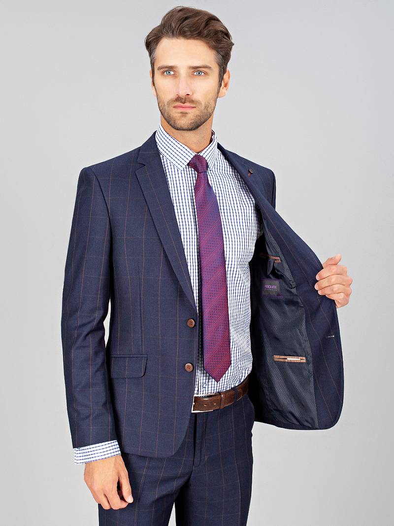Slim fit, две пуговицы, две шлицы. Декоративный платок в нагрудном кармане, контрастные петли.