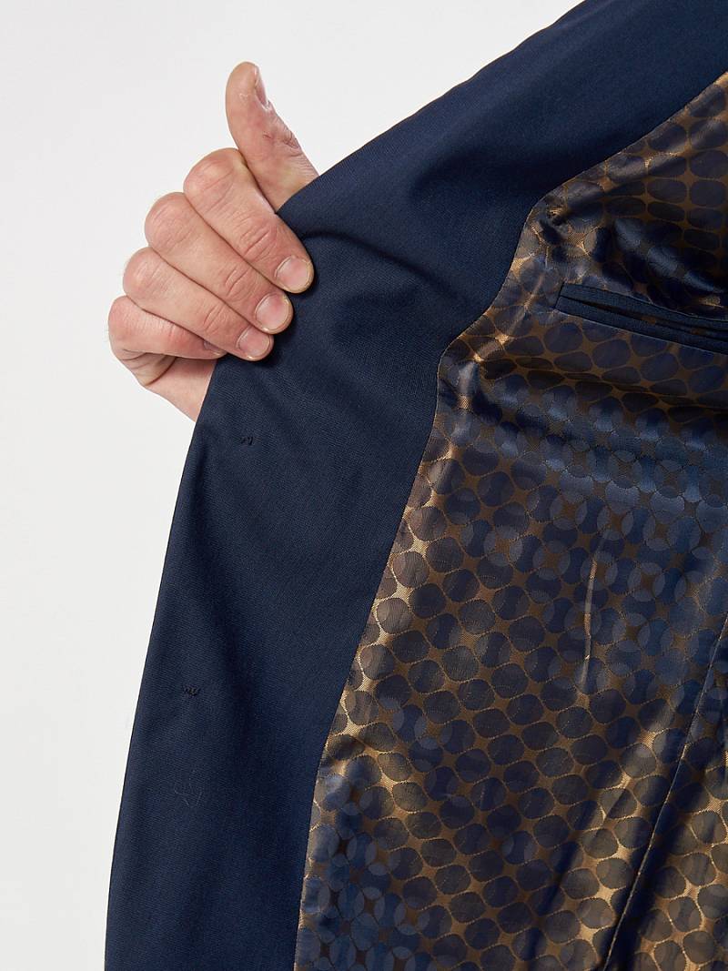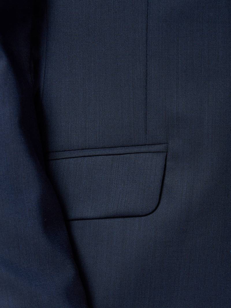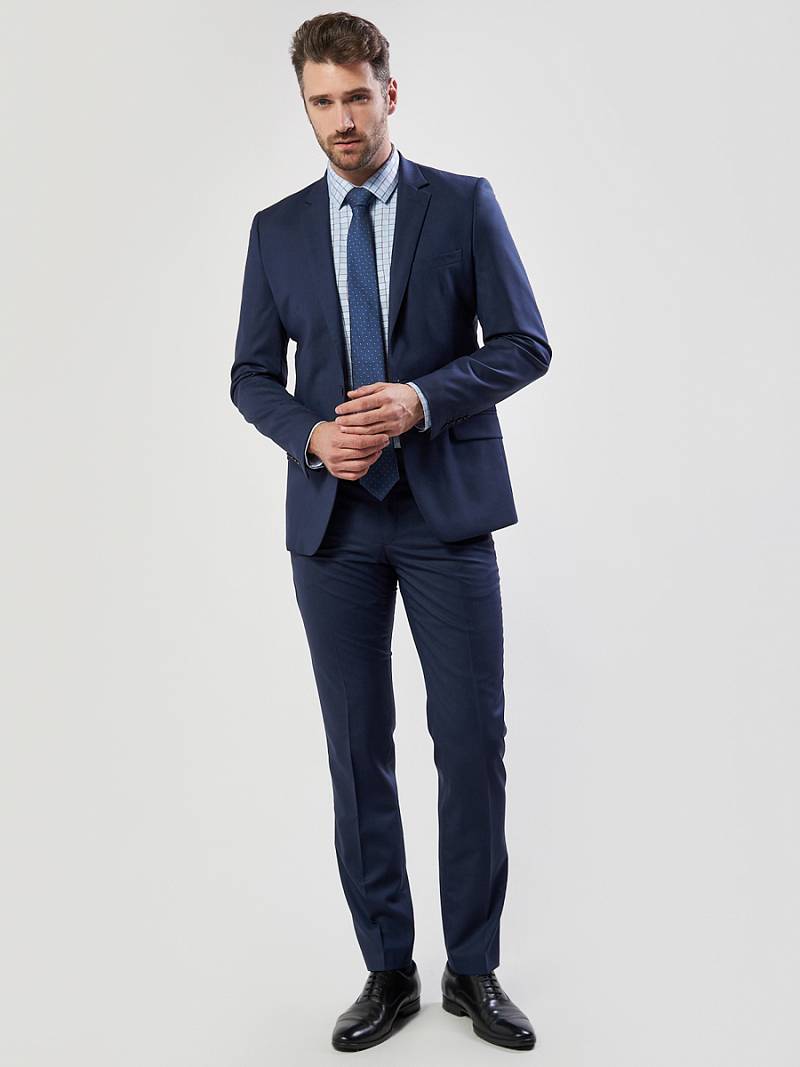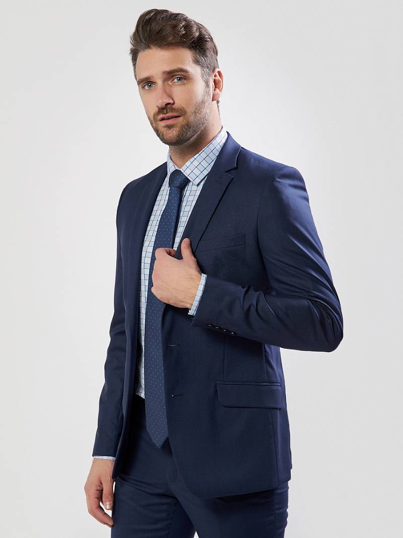 Классический костюм двойка Slim fit. Пиджак на две пуговицы, с боковыми и нагрудным карманами, по спинке одна шлица. Брюки без защипов с боковыми и одним задним карманом.