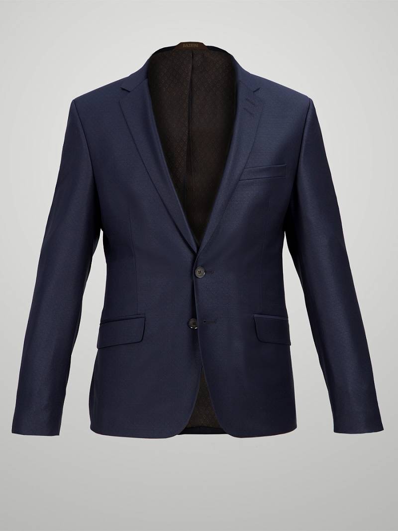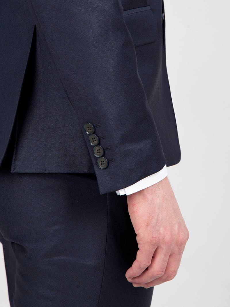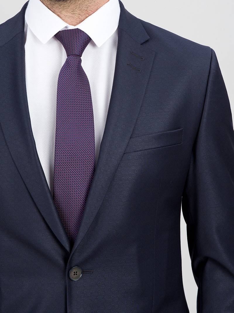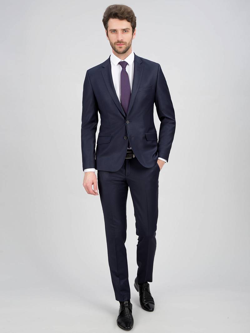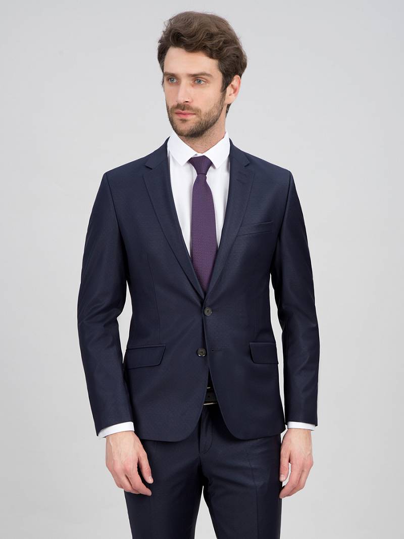 Классический костюм двойка Slim fit. Пиджак на две пуговицы, с боковыми и нагрудным карманами, по спинке две шлицы. Брюки без защипов с боковыми и одним задним карманом.