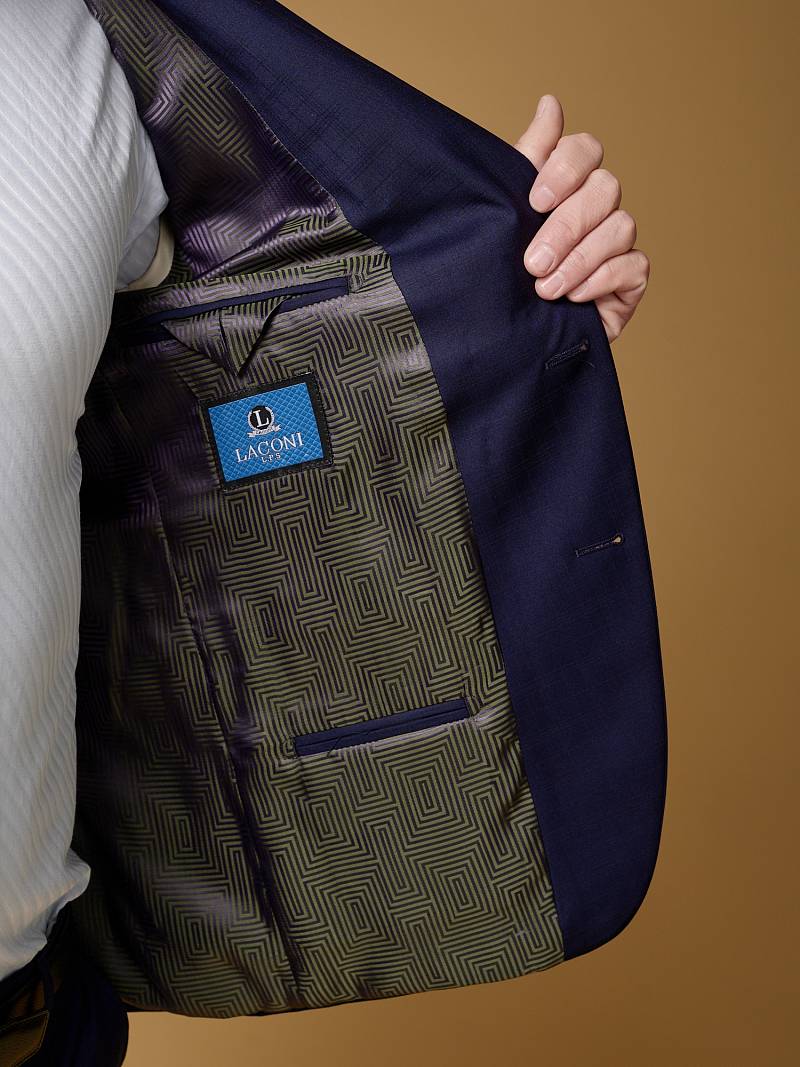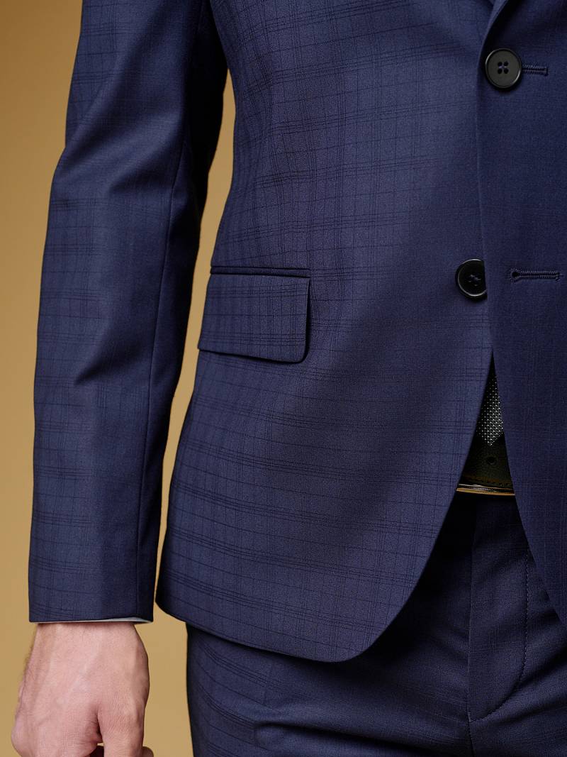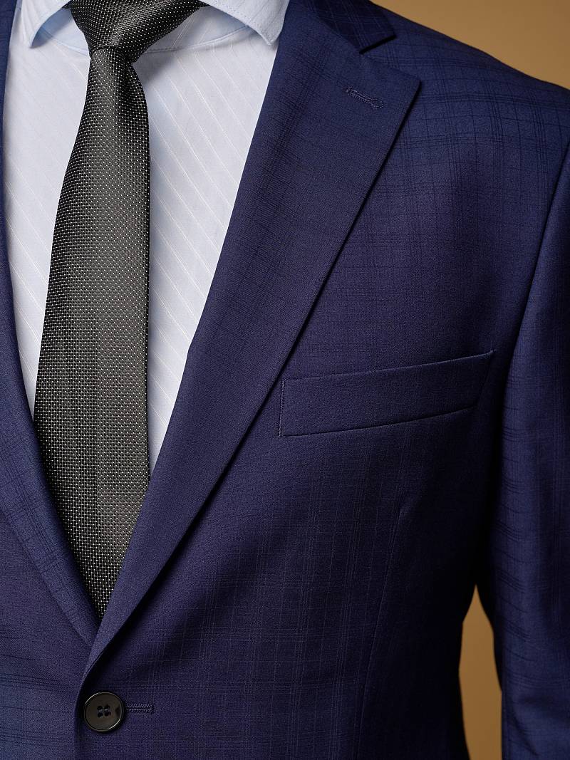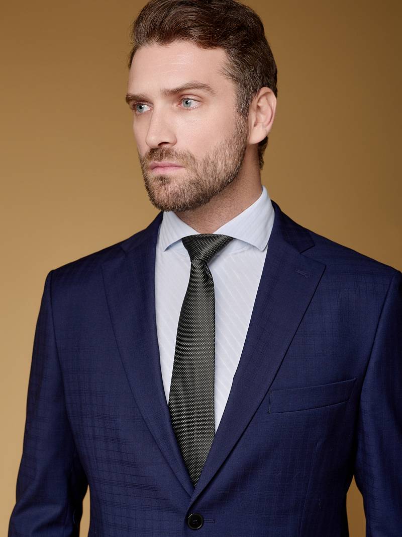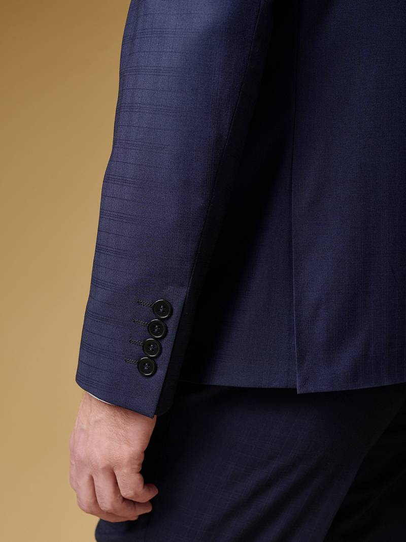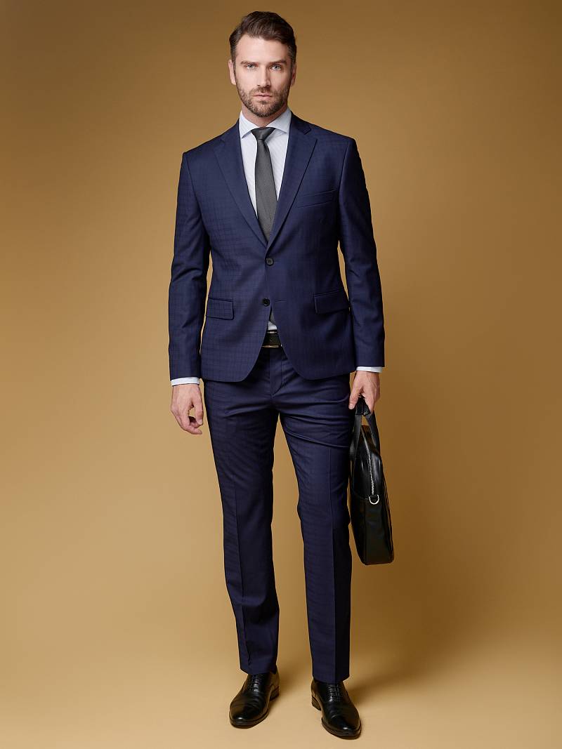 Классический костюм двойка Slim fit (ПРИЛЕГАЮЩИЙ СИЛУЭТ), рекомендуется брать на размер больше.Пиджак однобортный на две пуговицы, с двумя боковыми карманами с клапанами и нагрудной листочкой. Рукава втачные, двухшовные со шлицей и четырьмя декоративными пуговицами. По спинке расположены две шлицы. Пиджак на подкладке, с двумя внутренними карманами. Брюки без защипов, с боковыми наклонными карманами и одним задним карманом «в рамку». Передние половинки на подкладке. Верхний срез брюк обработан поясом с корсажной лентой и шлевками под ремень. Застежка обработана на тесьму-молнию, с петлей-пуговицей на поясе и усилен металлическим крючком.