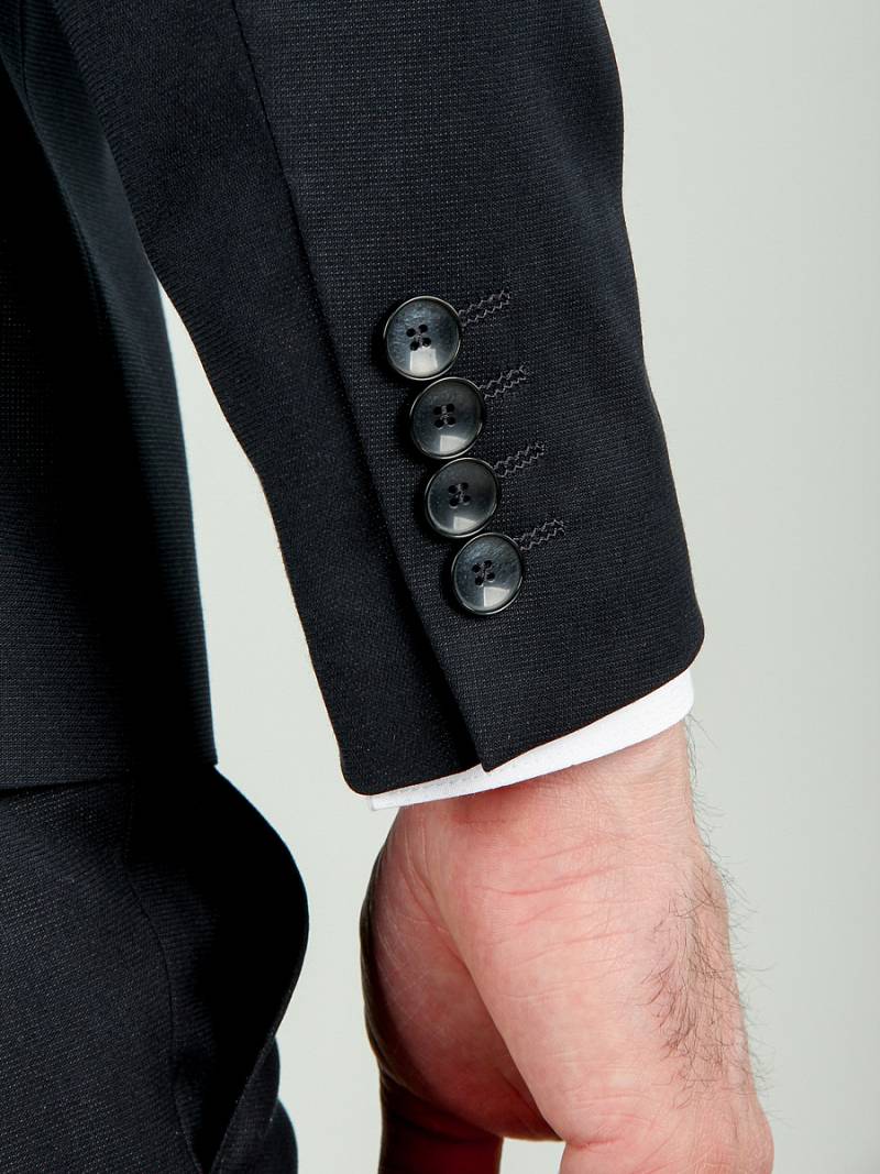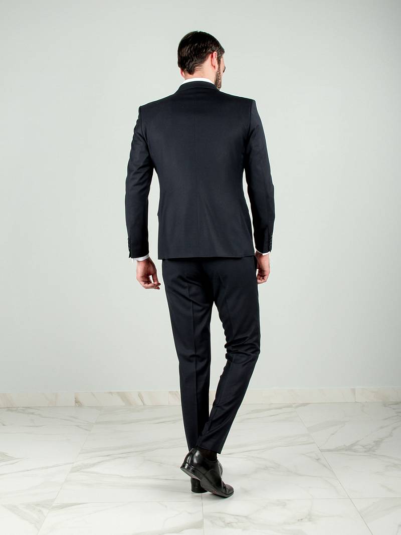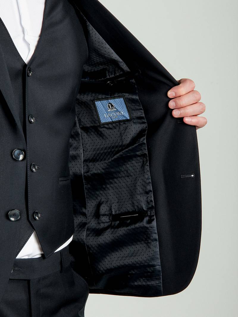 Классический костюм-тройка Slim fit. Пиджак на две пуговицы, с боковыми и нагрудным карманами, по спинке две шлицы. Брюки без защипов с боковыми и двумя задними карманами.