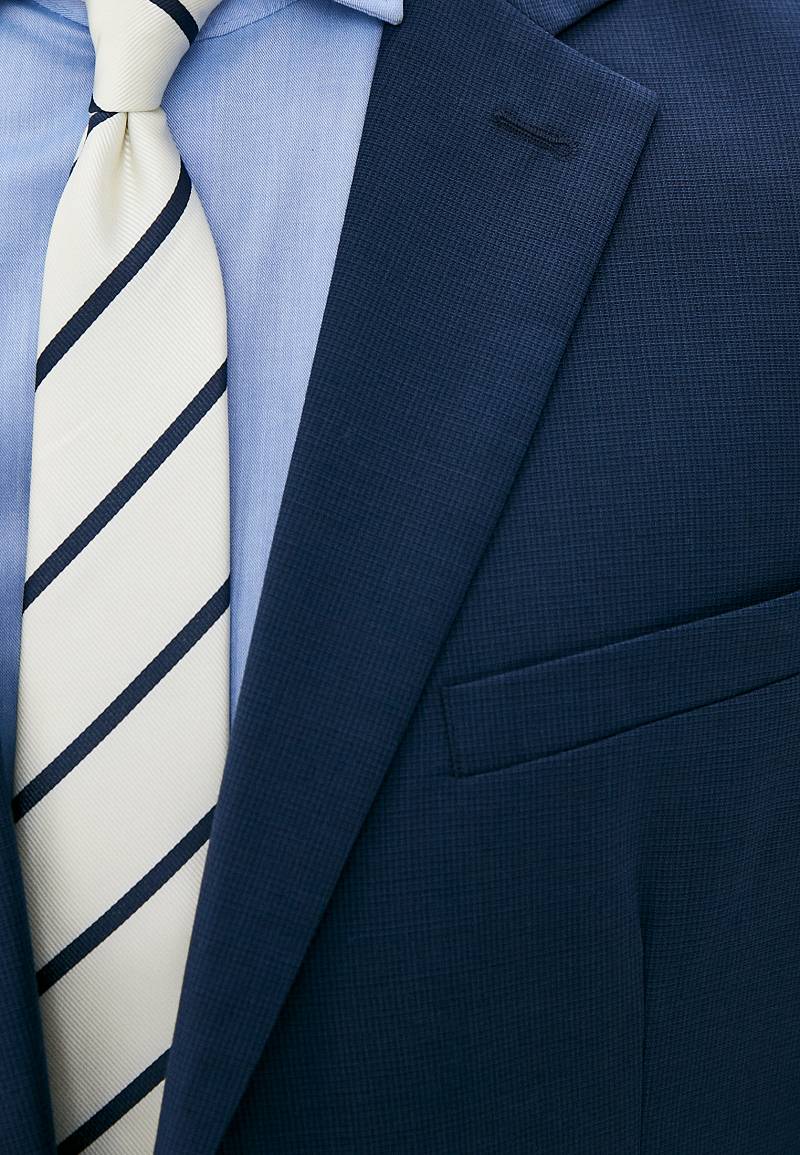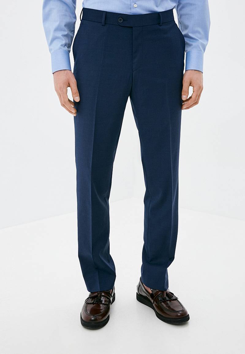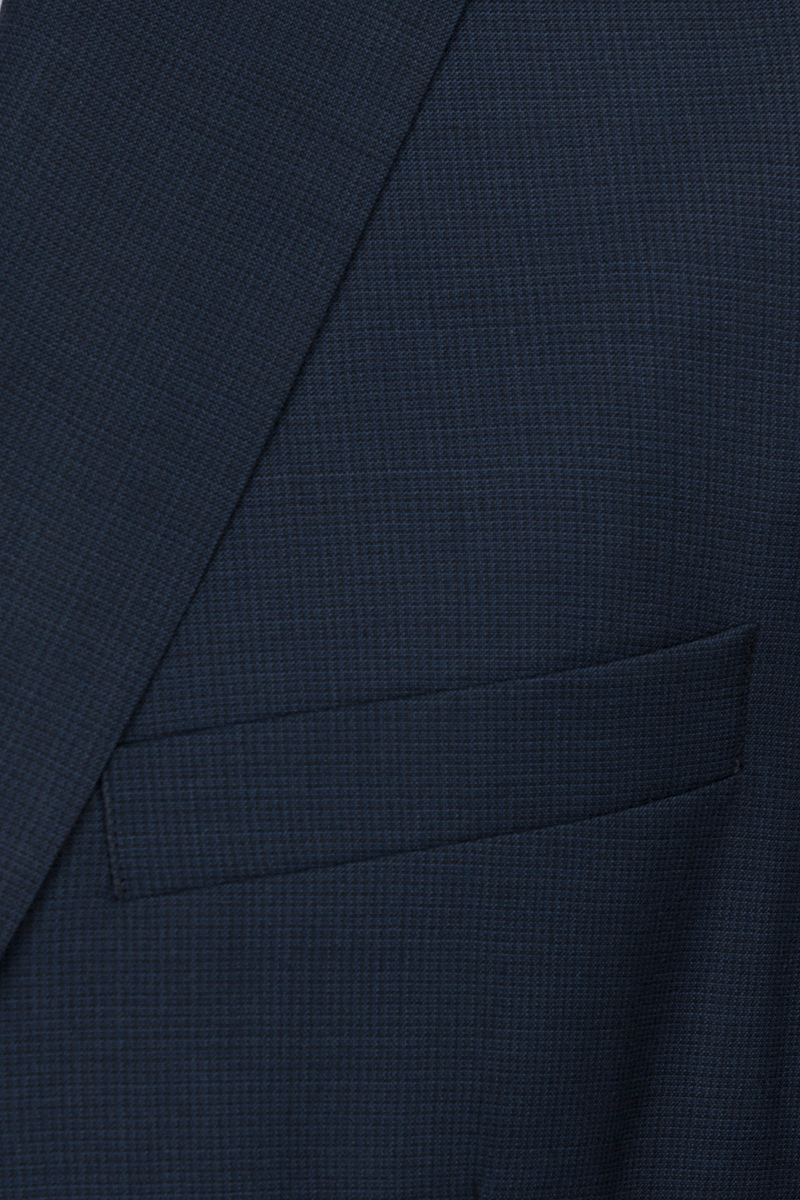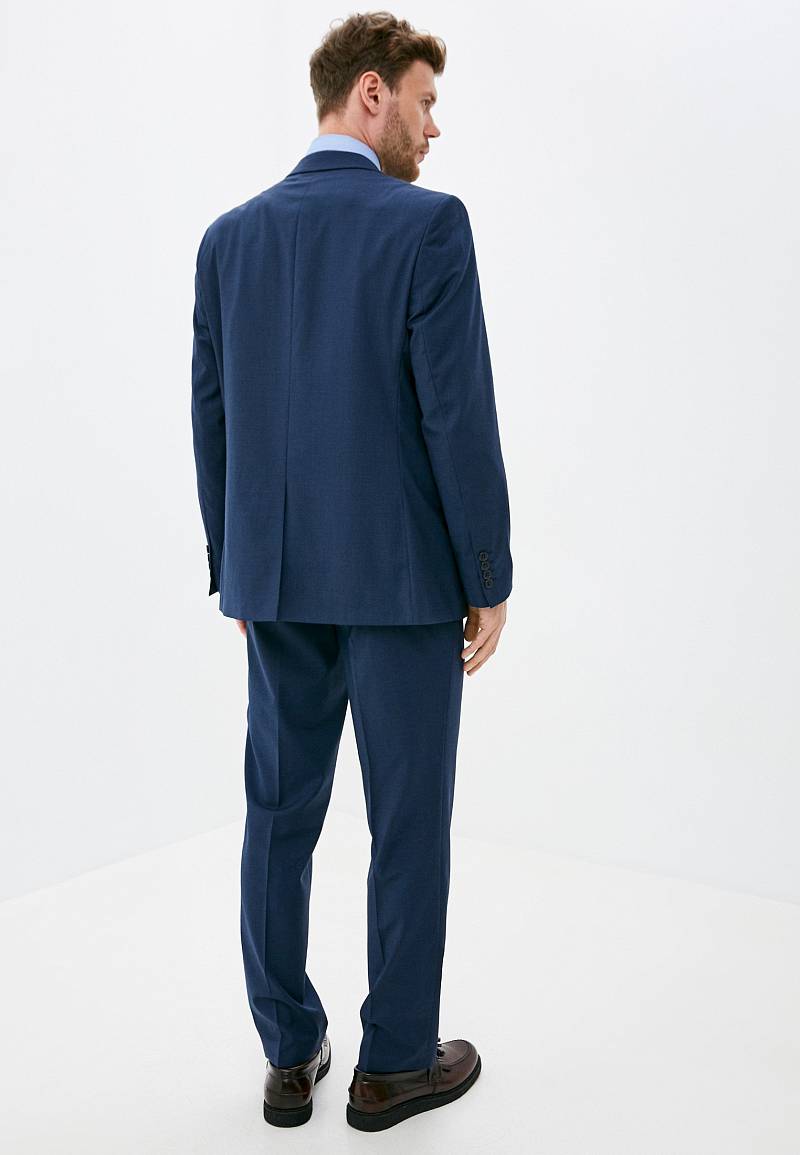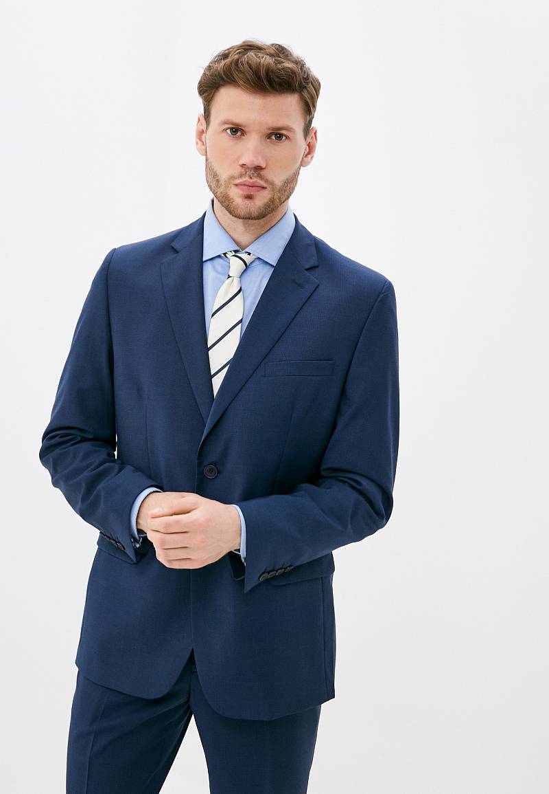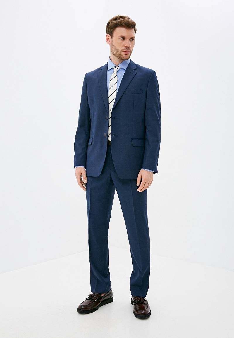 Классический костюм двойка Classic fit. Пиджак на две пуговицы, с боковыми и нагрудным карманами, по спинке две шлицы. Брюки без защипов с боковыми и одним задним карманом.