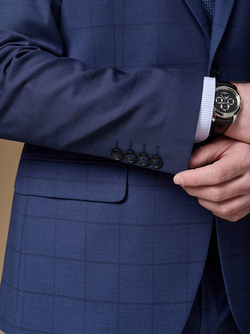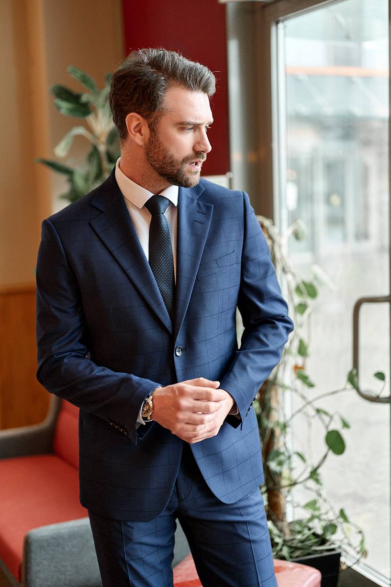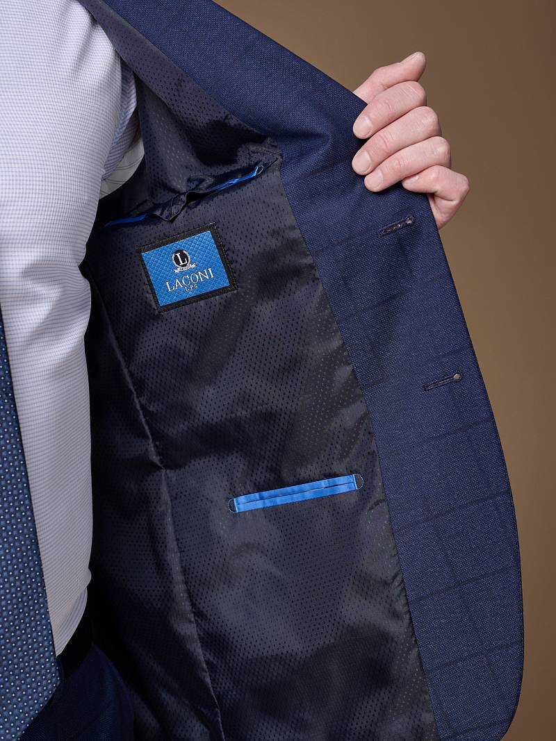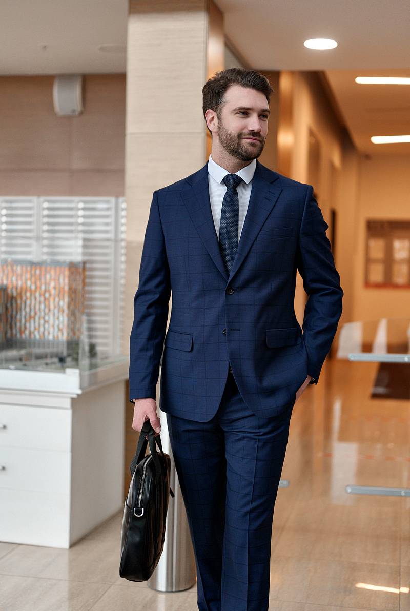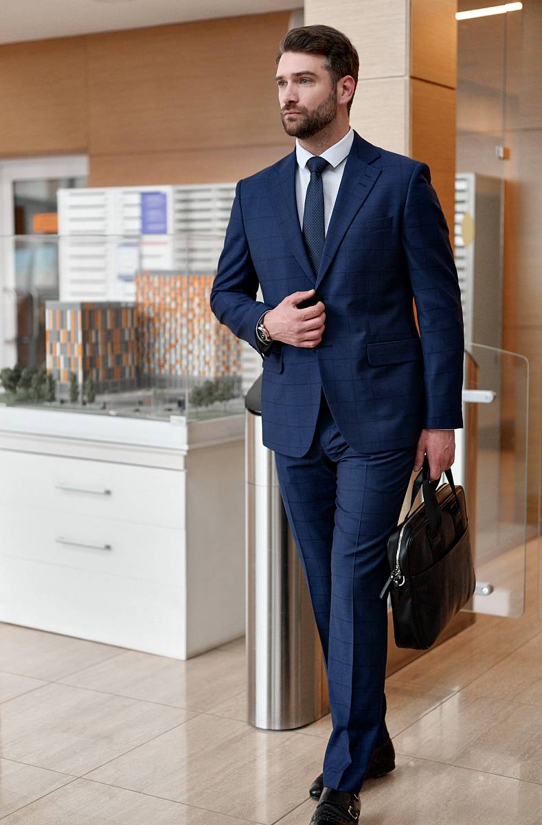 Классический костюм двойка Classic fit (ПОЛУПРИЛЕГАЮЩИЙ СИЛУЭТ). Пиджак однобортный на две пуговицы, с двумя боковыми карманами с клапанами и нагрудной листочкой. Рукава втачные, двухшовные со шлицей и четырьмя декоративными пуговицами. По спинке расположены две шлицы. Пиджак на подкладке, с двумя внутренними карманами. Брюки без защипов, с боковыми наклонными карманами и двумя задними карманами «в рамку». Передние половинки на подкладке. Верхний срез брюк обработан поясом с корсажной лентой и шлевками под ремень. Застежка обработана на тесьму-молнию, с петлей-пуговицей на поясе и усилен металлическим крючком.