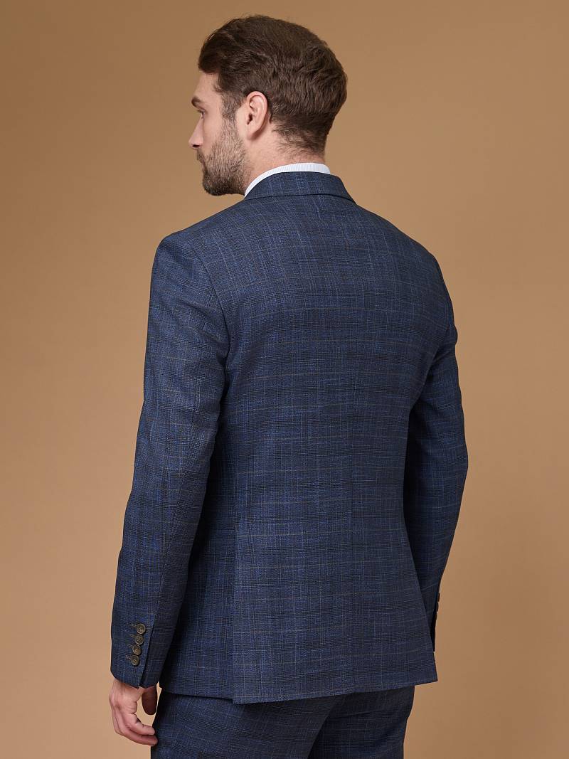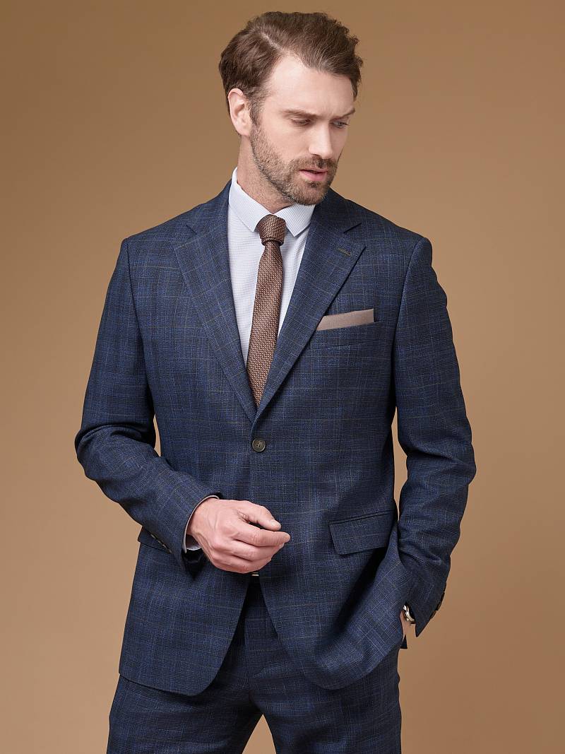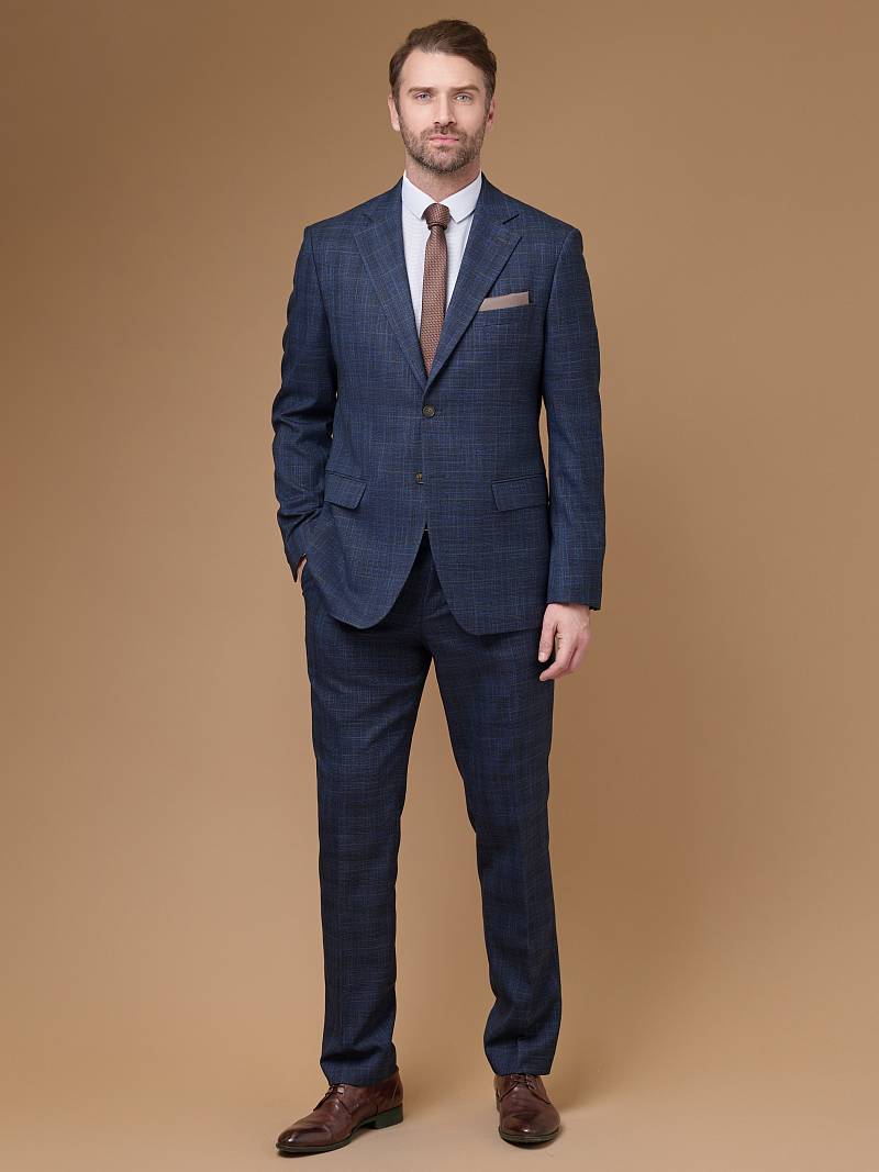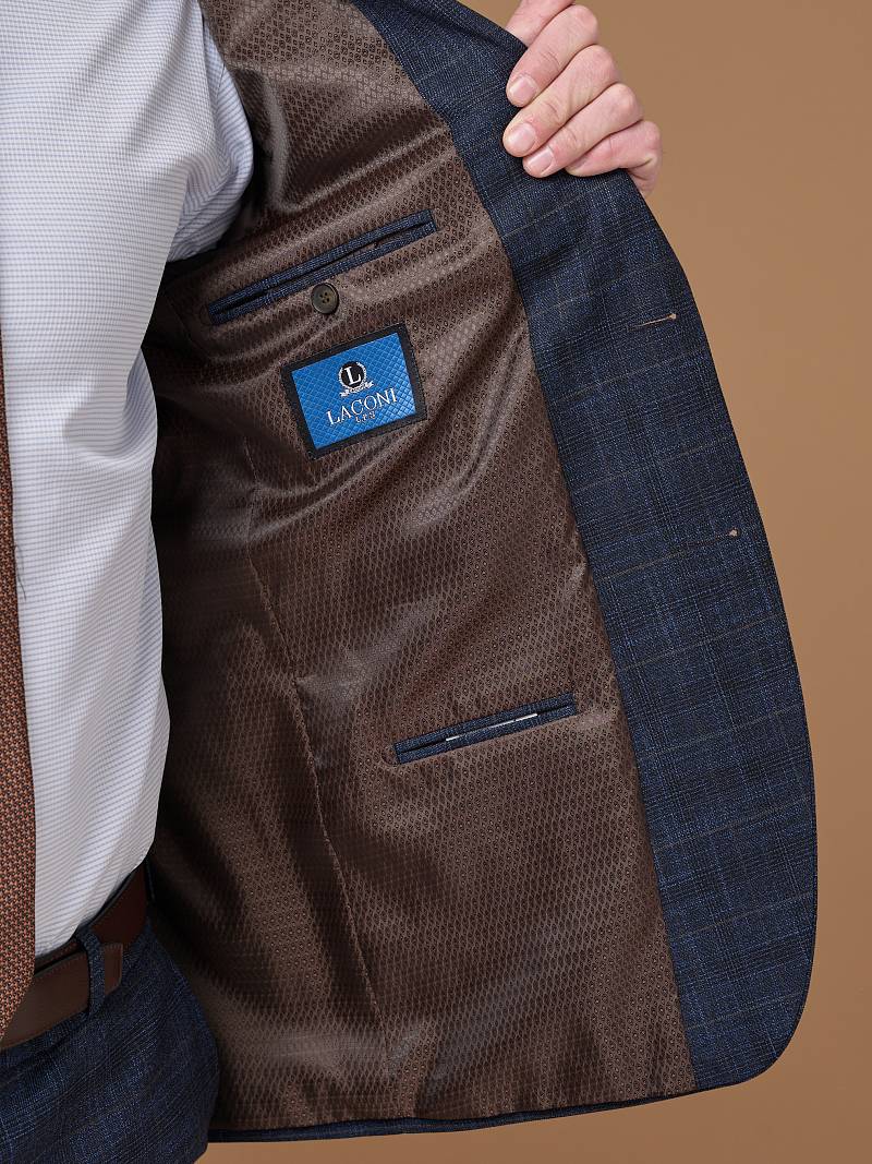 Classic fit (ПОЛУПРИЛЕГАЮЩИЙ СИЛУЭТ). Универсальный костюм двойка марки LACONI– это идеальный баланс между внешним видом и комфортом. Слегка приталенная однобортная модель на две пуговицы сшита из ткани спокойного синего цвета и ненавязчивой клетки. Пиджак с широкими лацканами и мягкой линией плеч дополнили сзади двумя шлицами, поэтому он садится точно по фигуре. Внутри пиджак обработан на подкладке с двумя внутренними карманами. Для придания образу торжественности подкладку нагрудного кармана можно использовать как платок. Брюки прямого кроя со стрелками и классической посадкой, с боковыми наклонными карманами и одним задним карманом "в рамку". Верхний срез брюк обработан поясом с корсажной лентой и шлевками под ремень. Дизайнеры марки LACONI тщательно подходят к выбору материалов. Пуговицы подбираются и красятся индивидуально под каждую ткань, а прикладные материалы используют только от передовых производителей.