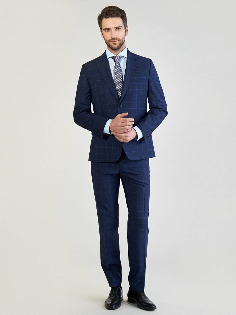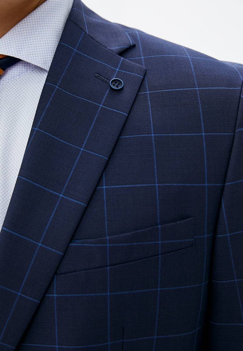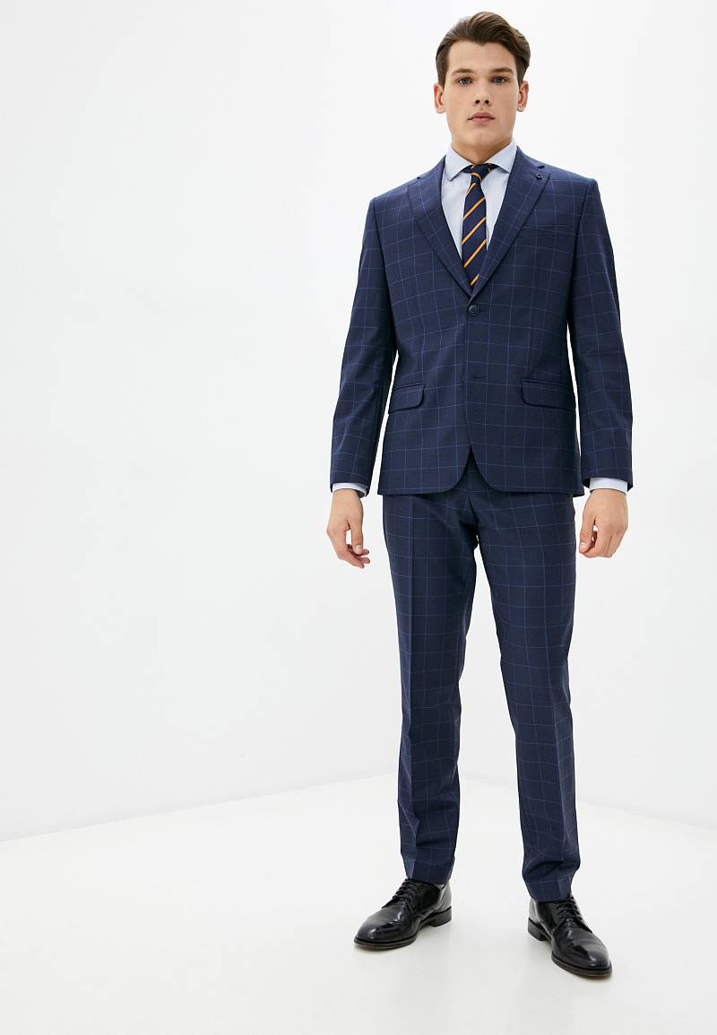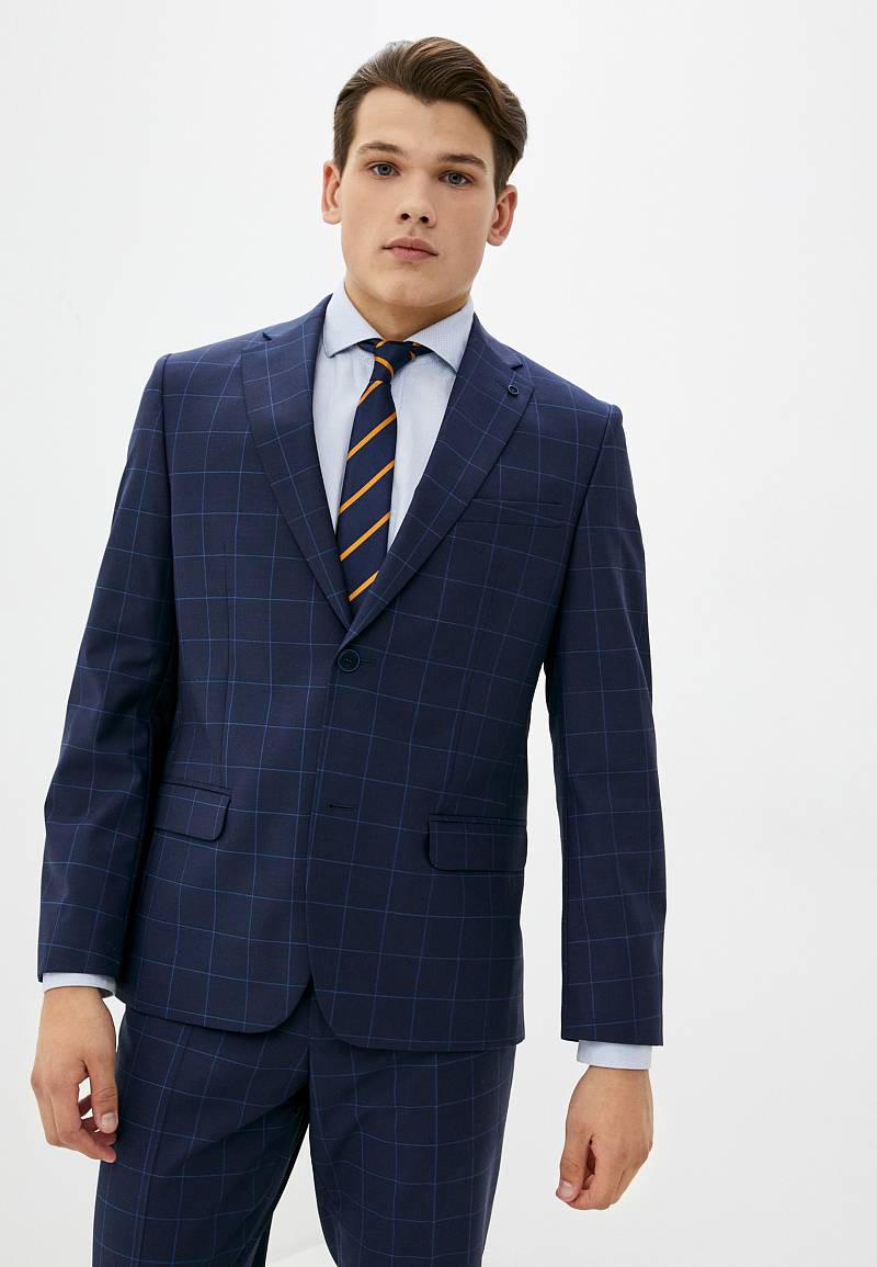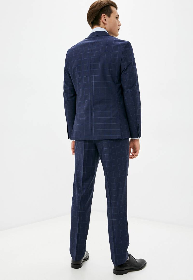 Классический костюм двойка Classic fit. Пиджак на две пуговицы, с боковыми и нагрудным карманами, по спинке две шлицы. Брюки без защипов с боковыми и одним задним карманом.