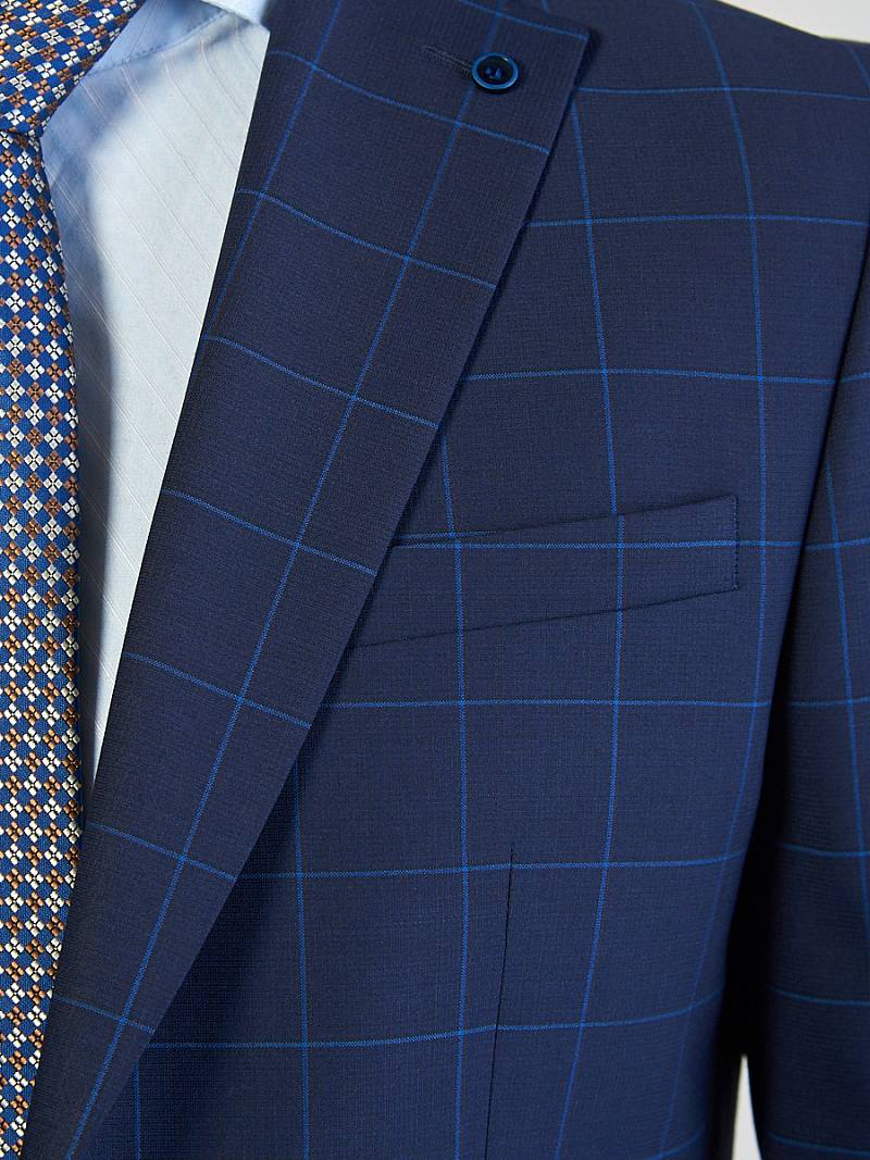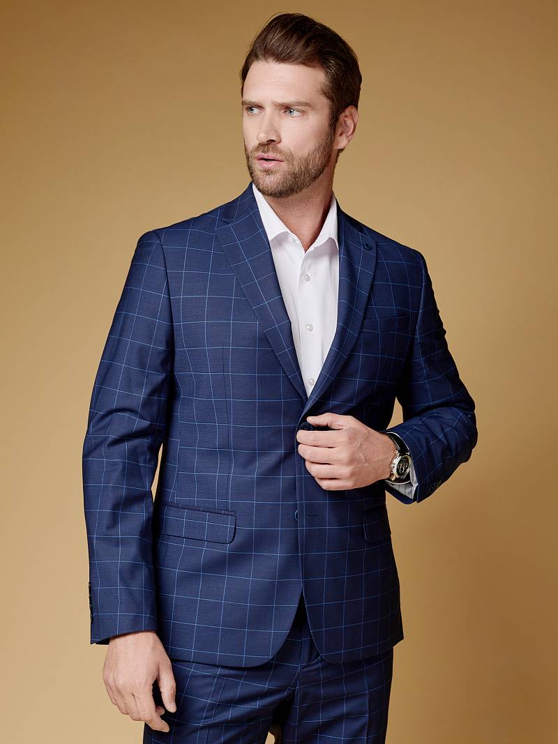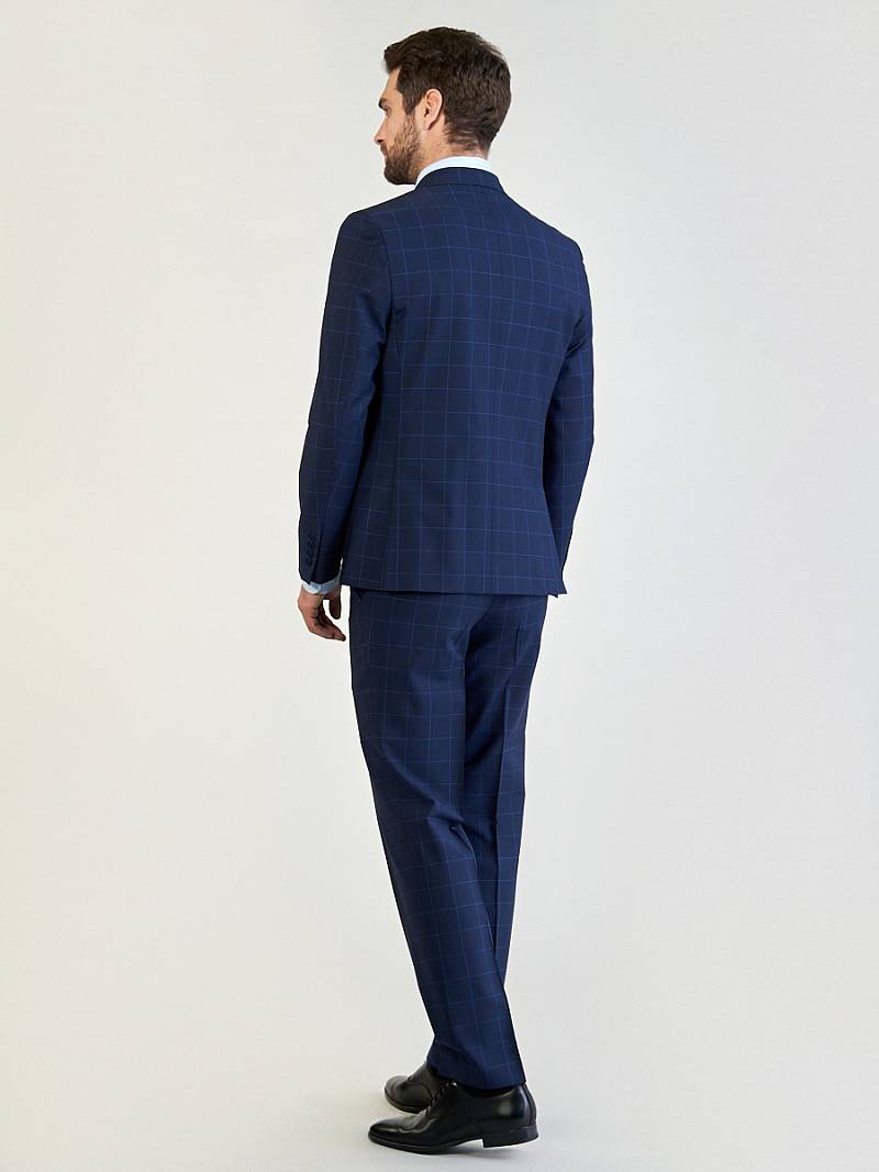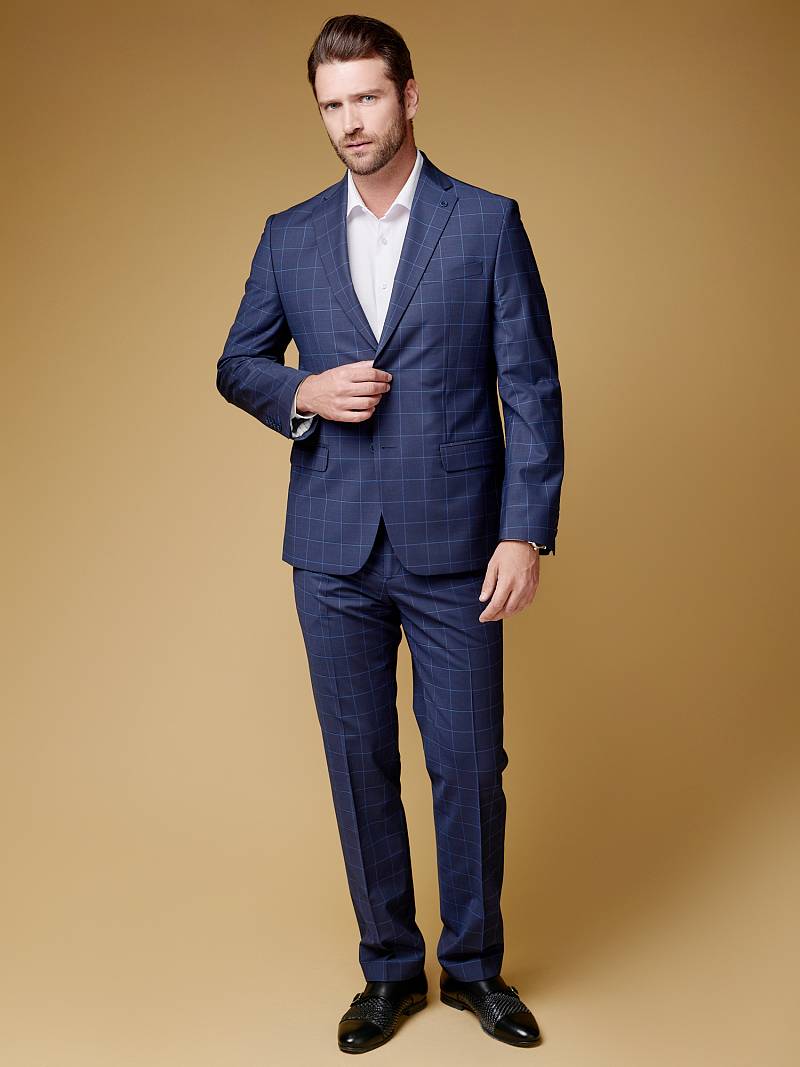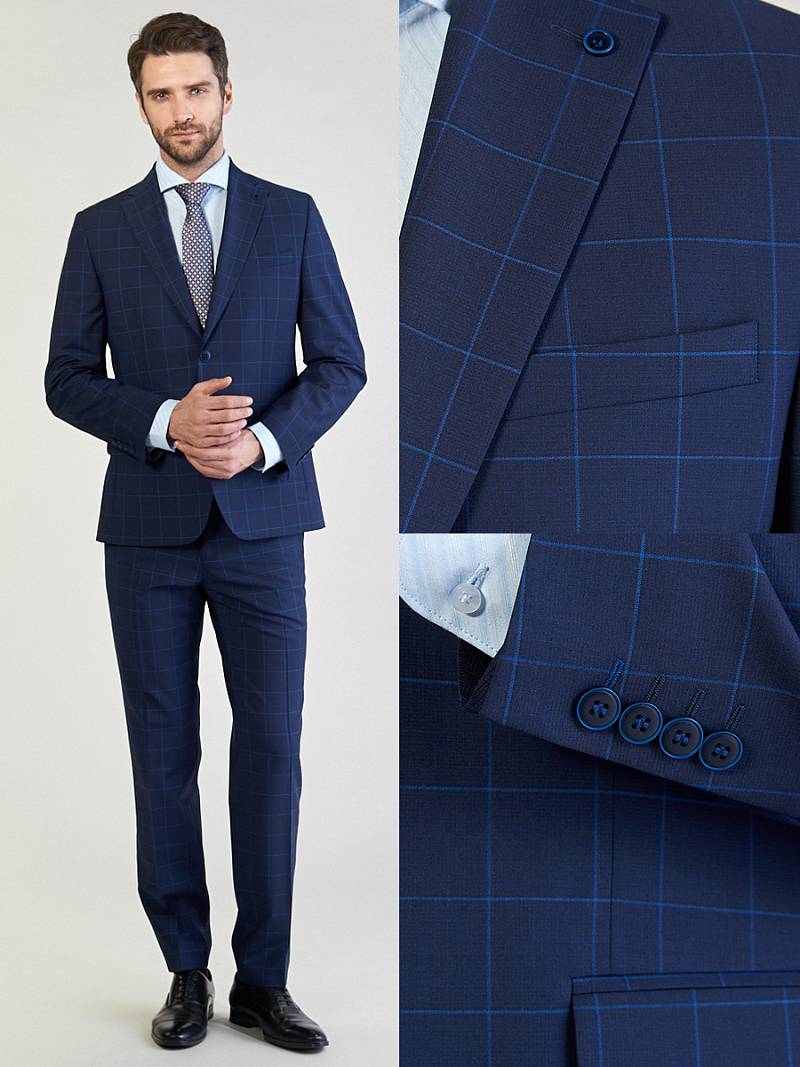 Классический костюм двойка Classic fit. Пиджак на две пуговицы, с боковыми и нагрудным карманами, по спинке две шлицы. Брюки без защипов с боковыми и одним задним карманом.