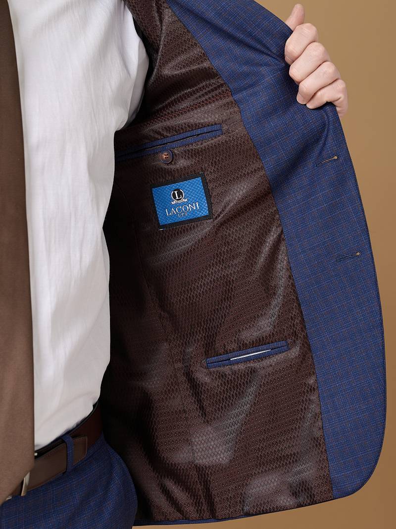 Slim fit (ПРИЛЕГАЮЩИЙ СИЛУЭТ), рекомендуется брать на размер больше. Костюм двойка марки LACONI– это идеальный баланс между внешним видом и комфортом. Приталенная однобортная модель на две пуговицы сшита из ткани нейтрального синего цвета и ненавязчивой клетки, что отлично подходит для любого случая в жизни. Пиджак с классической шириной лацкана и мягкой линией плеч дополнили сзади двумя шлицами, поэтому он садится точно по фигуре. Внутри пиджак обработан на подкладке с двумя внутренними карманами. Брюки прямого кроя со стрелками и заниженной посадкой, с боковыми наклонными карманами и одним задним карманом "в рамку". Верхний срез брюк обработан поясом с корсажной лентой и шлевками под ремень. Дизайнеры марки LACONI тщательно подходят к выбору материалов. Пуговицы подбираются и красятся индивидуально под каждую ткань, а прикладные материалы используют только от передовых производителей. Костюм мужской, классический, нарядный, повседневный, молодежный, casual, для работы в офисе, модный, для мужа, сына, бр