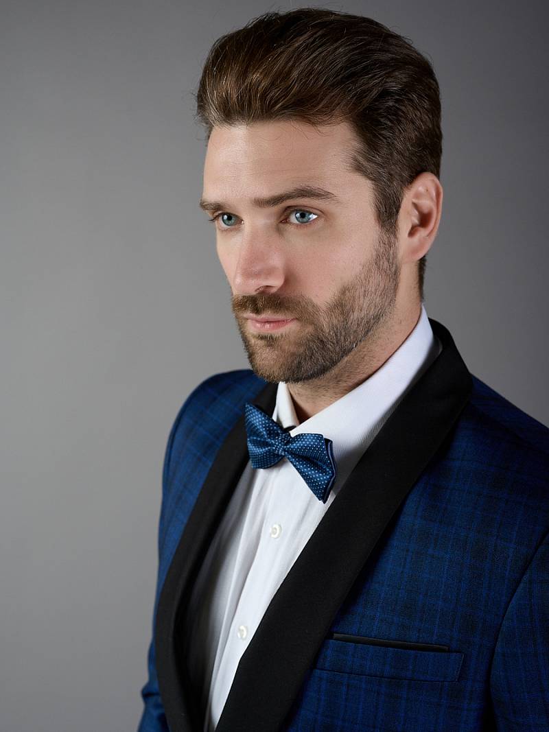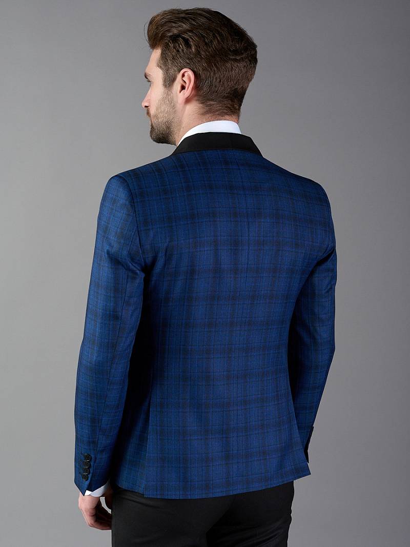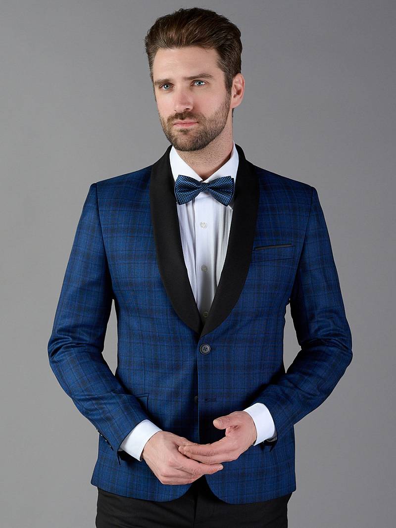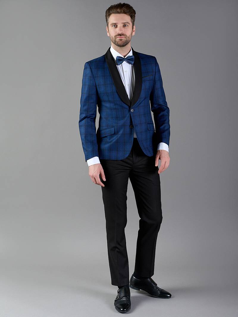 Классический костюм Slim fit. Пиджак с воротником-шалька на две пуговицы, с боковыми и нагрудным карманами, по спинке две шлицы, в нагрудном кармане. Брюки без защипов с боковыми и одним задним карманом. Брюки и воротник пиджака выполнены из ткани компаньона.
