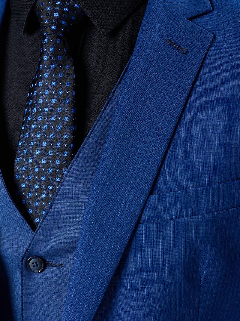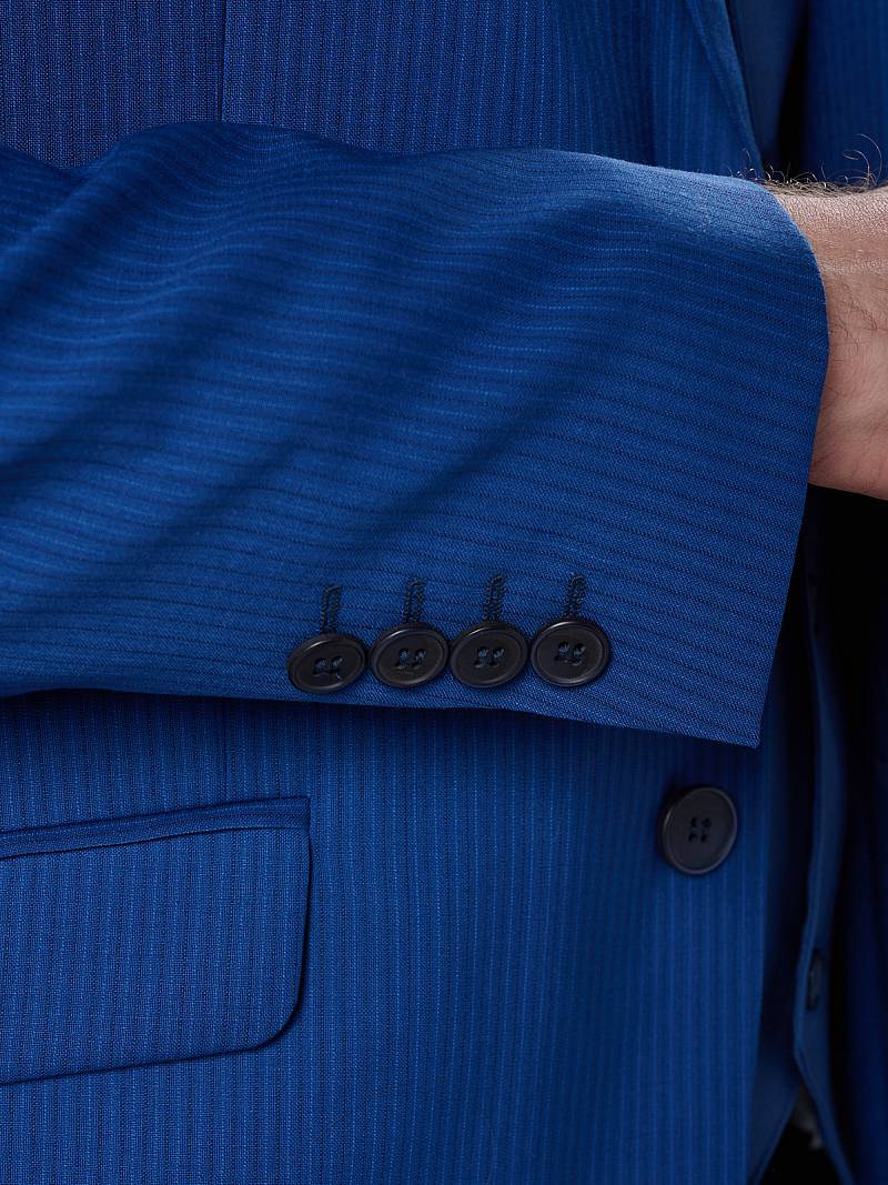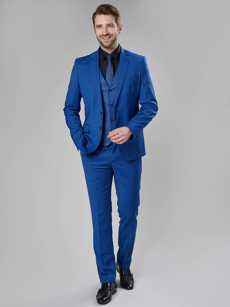 Классический костюм двойка Slim fit. Пиджак на две пуговицы, с боковыми и нагрудным карманами, по спинке одна шлица. Брюки без защипов с боковыми и одним задним карманом.