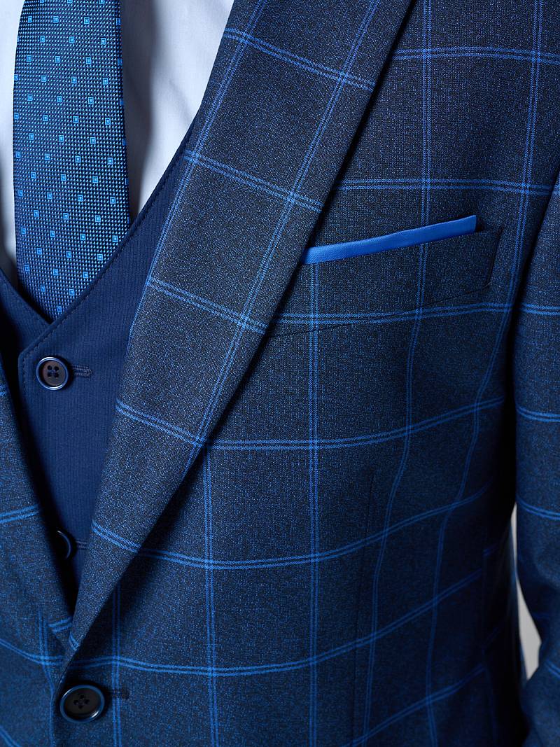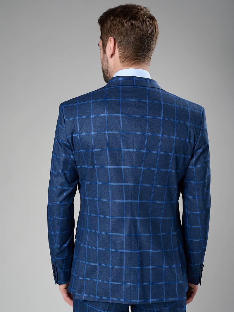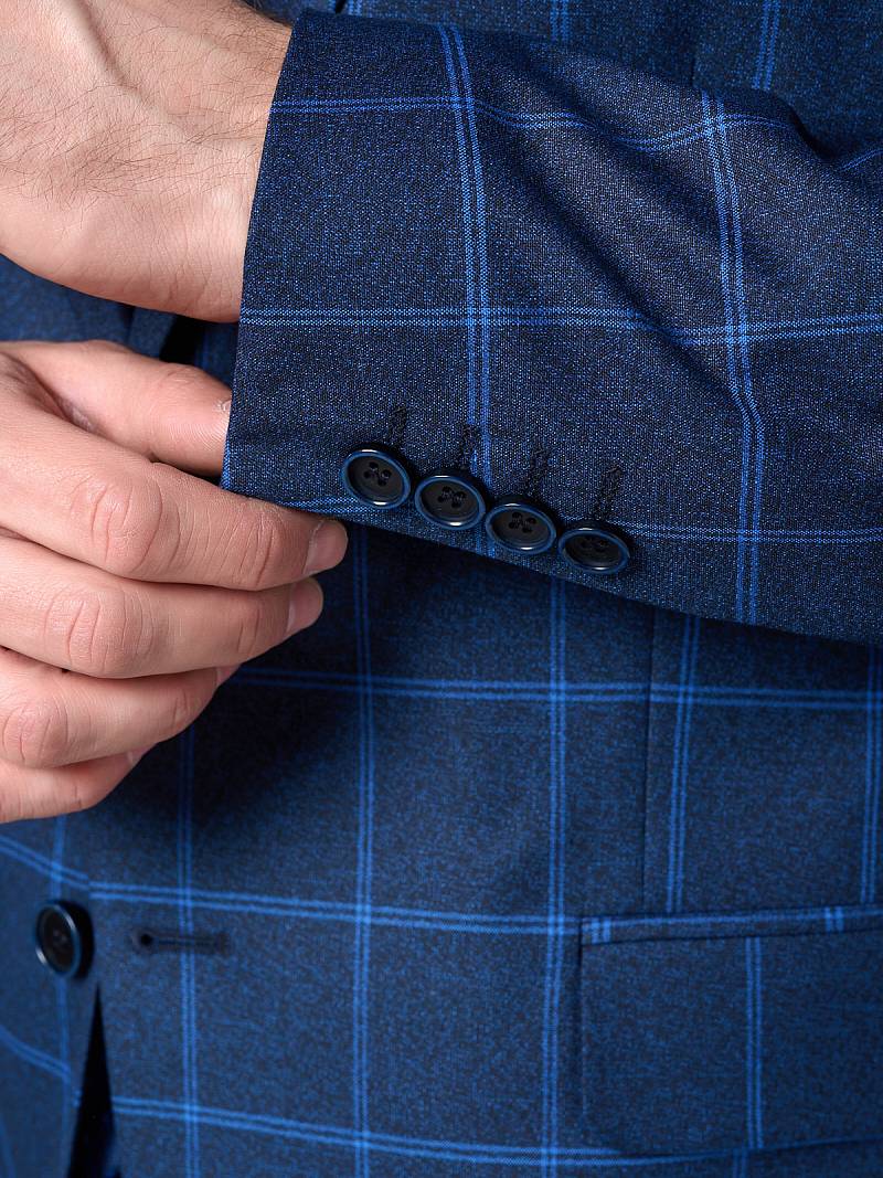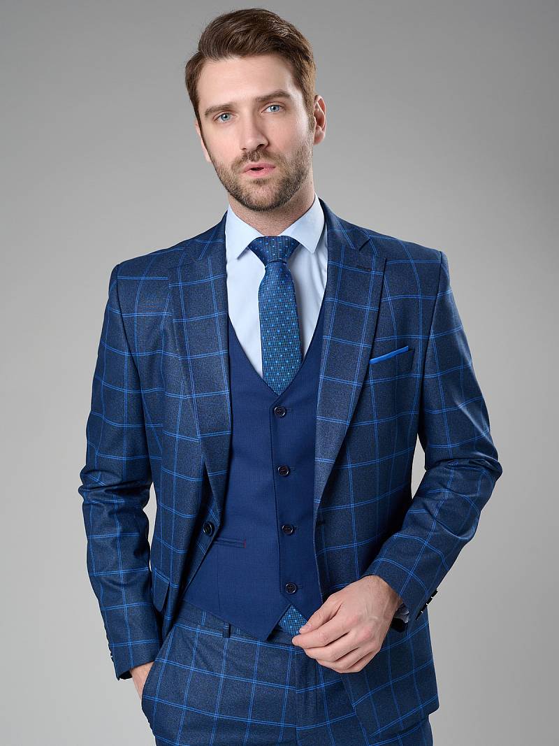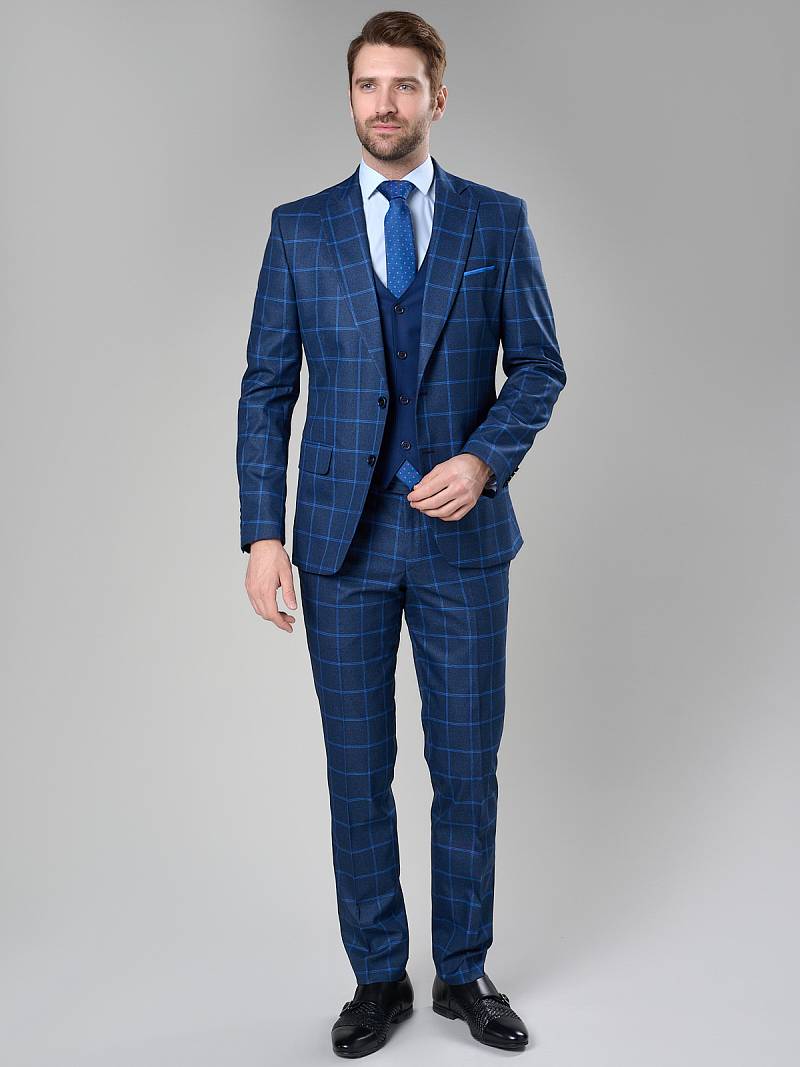 Классический костюм двойка Slim fit. Пиджак на две пуговицы, с боковыми и нагрудным карманами, по спинке две шлицы. Брюки без защипов с боковыми и двумя задними карманами.