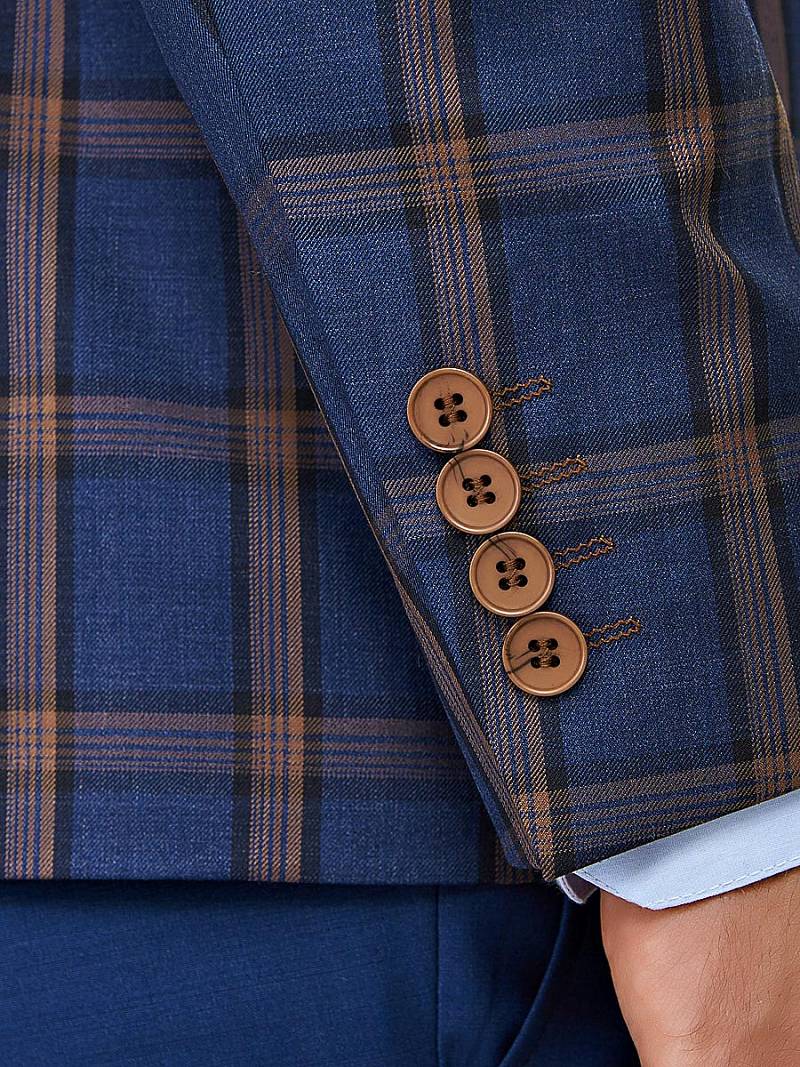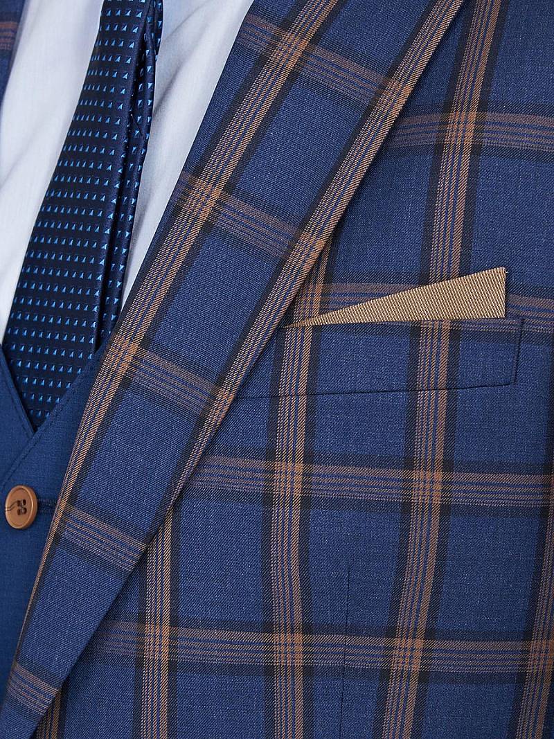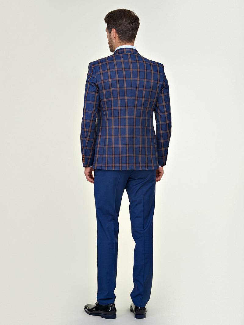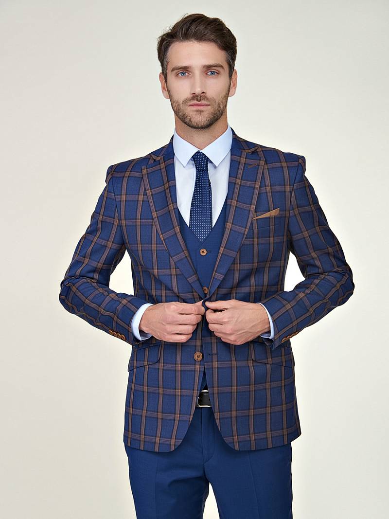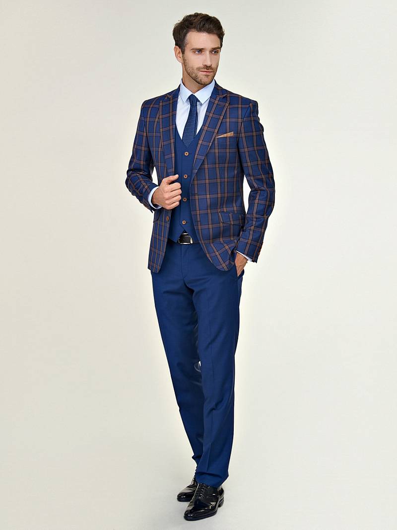 Классический костюм-тройка Slim fit. Пиджак на две пуговицы, с боковыми и нагрудным карманами, по спинке две шлицы. Брюки без защипов с боковыми и двумя задними карманами. Жилет и брюки выполнены из ткани компаньона.