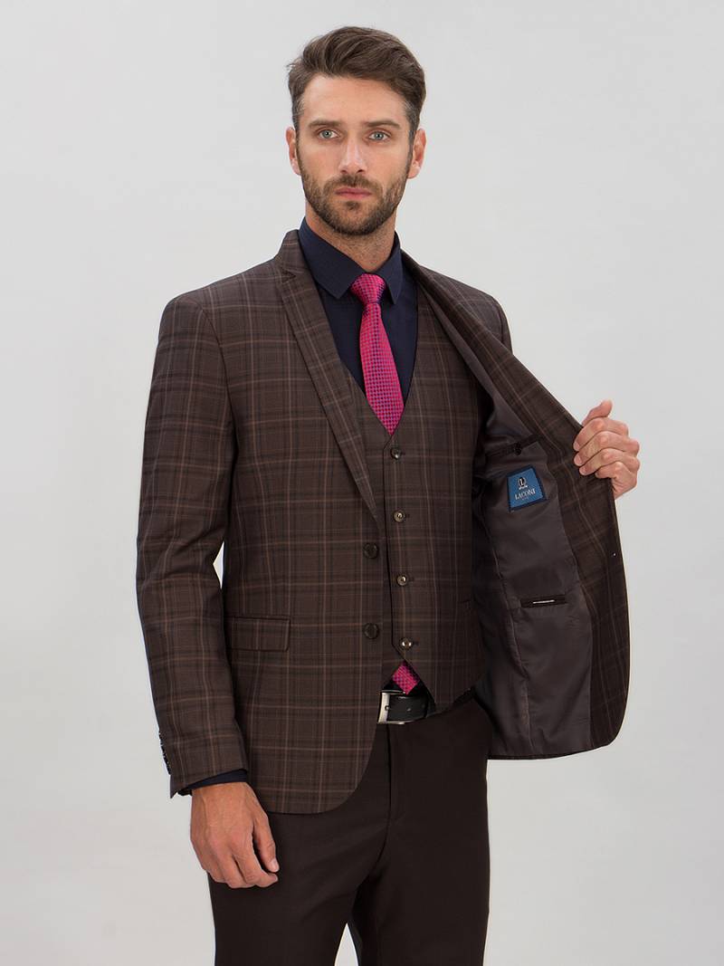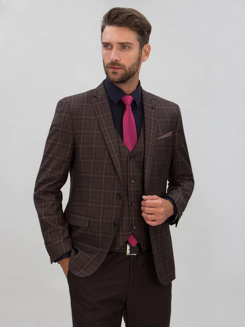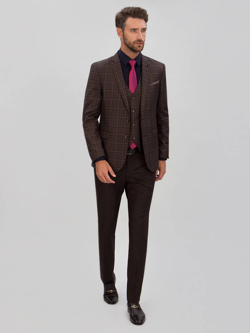Classic fit, две пуговицы, две шлицы. Контрастные петли, декоративная пуговица на лацкане, нагрудный платок. Брюки из ткани компаньон.