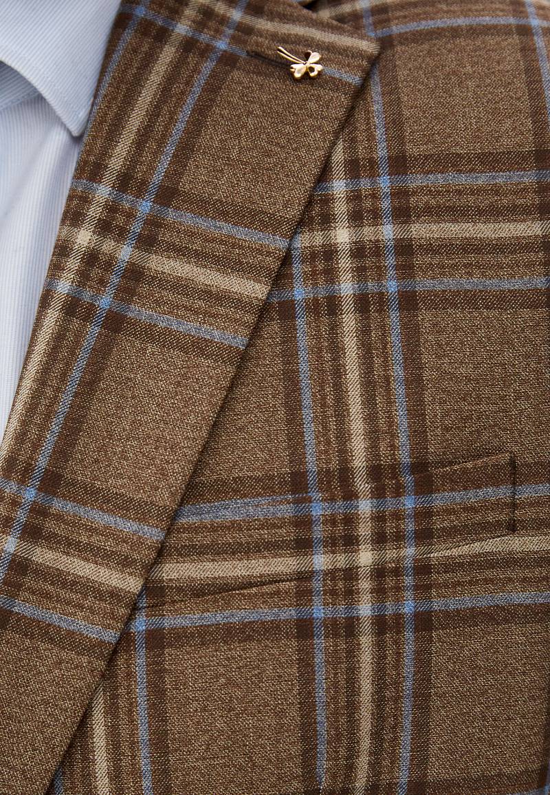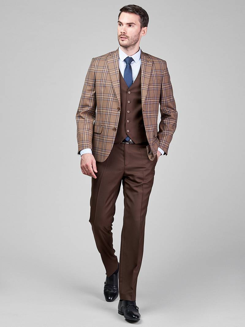 Classic fit, Однобортный костюм тройка на две пуговицы, по спинке две шлицы. Брюки выполнены из ткани компаньона.