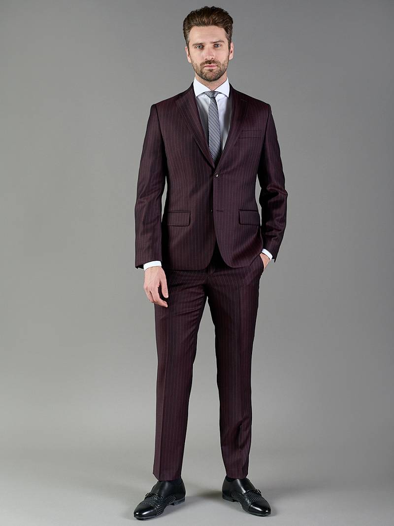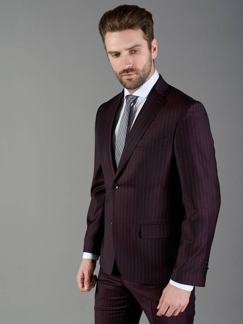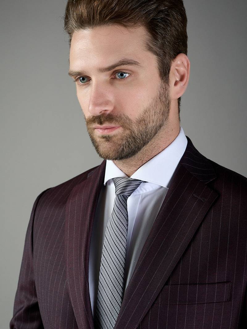 Классический костюм двойка Classic fit. Пиджак на две пуговицы, с боковыми и нагрудным карманами, по спинке две шлицы. Брюки без защипов с боковыми и одним задним карманом.