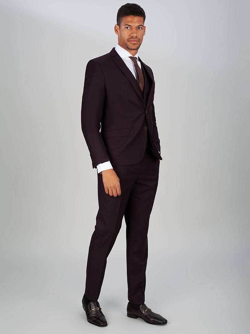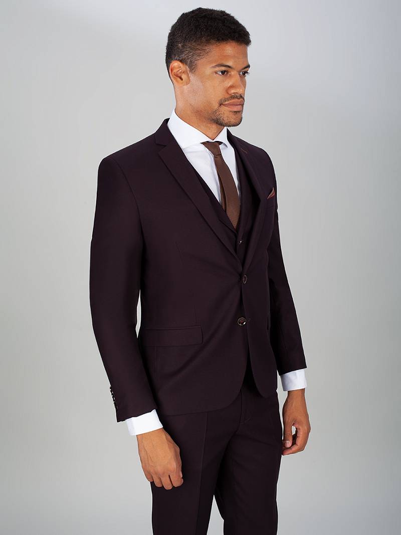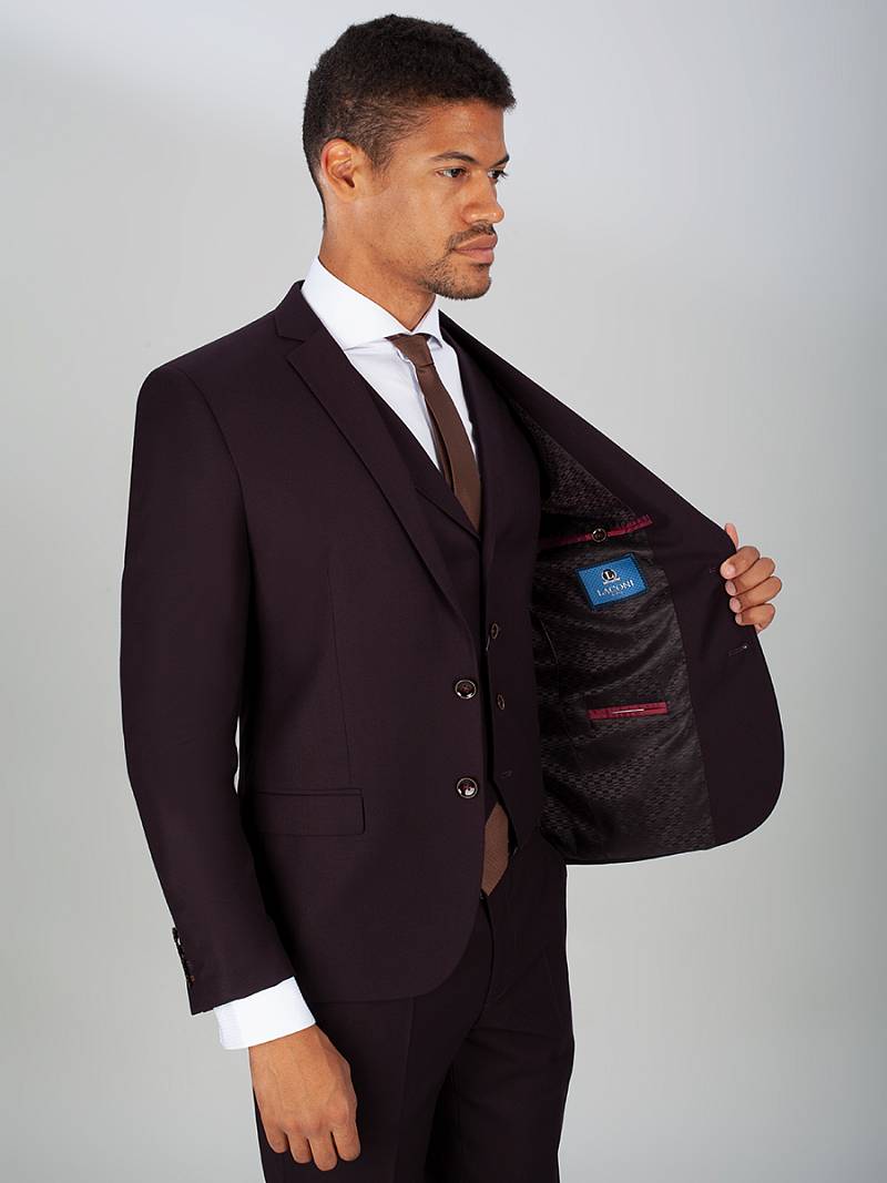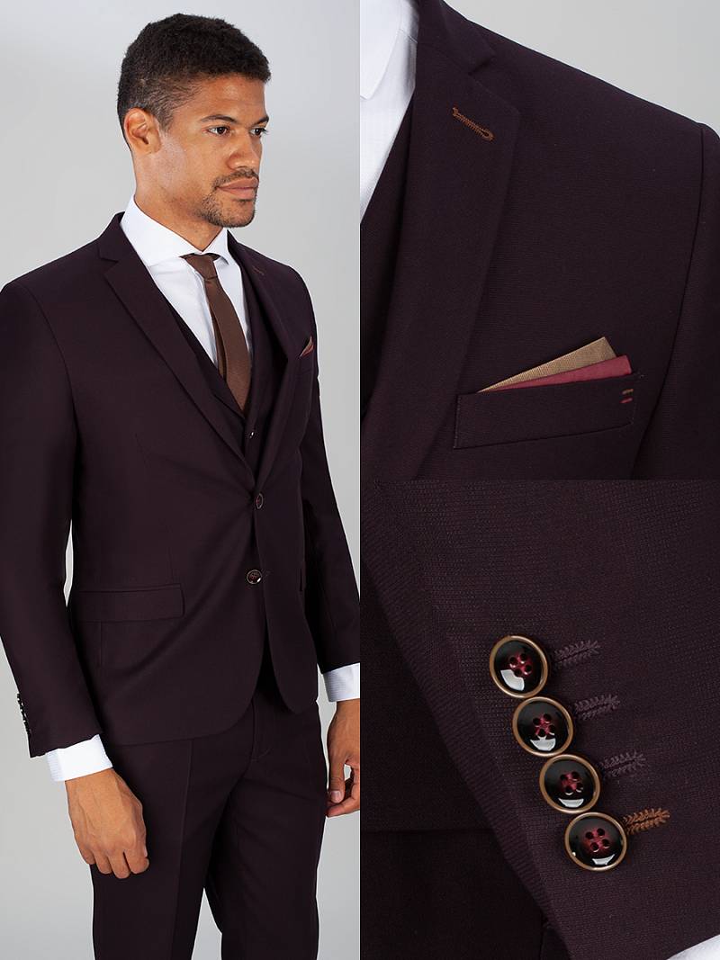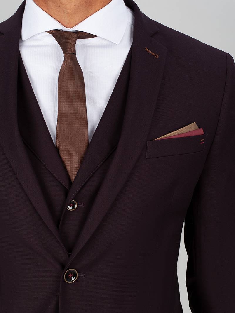 Slim fit, костюм-тройка, две пуговицы, две шлицы. Контрастные петли, нагрудный платок.