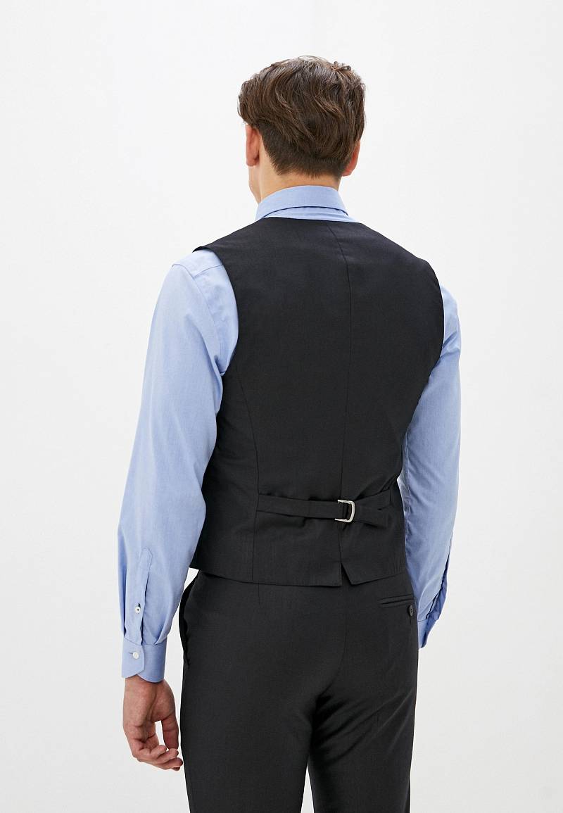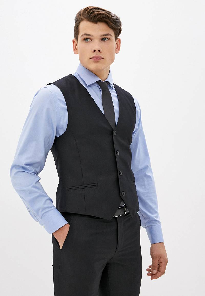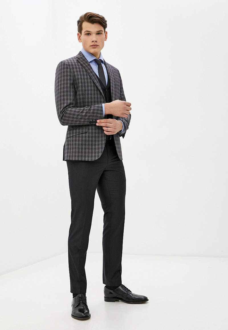 Классический костюм-тройка Slim fit . Пиджак на две пуговицы, с боковыми и нагрудным карманами, по спинке две шлицы. Брюки без защипов в боковыми и одним задним карманом. Жилет и брюки выполнены из ткани компаньона.