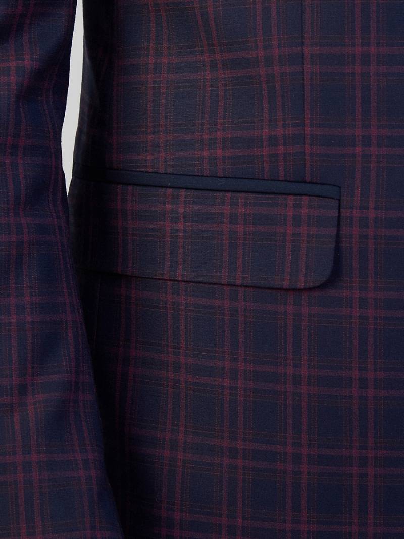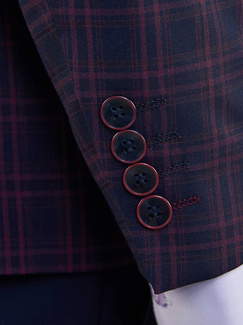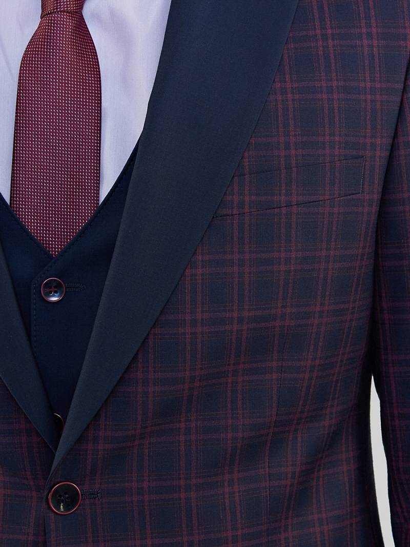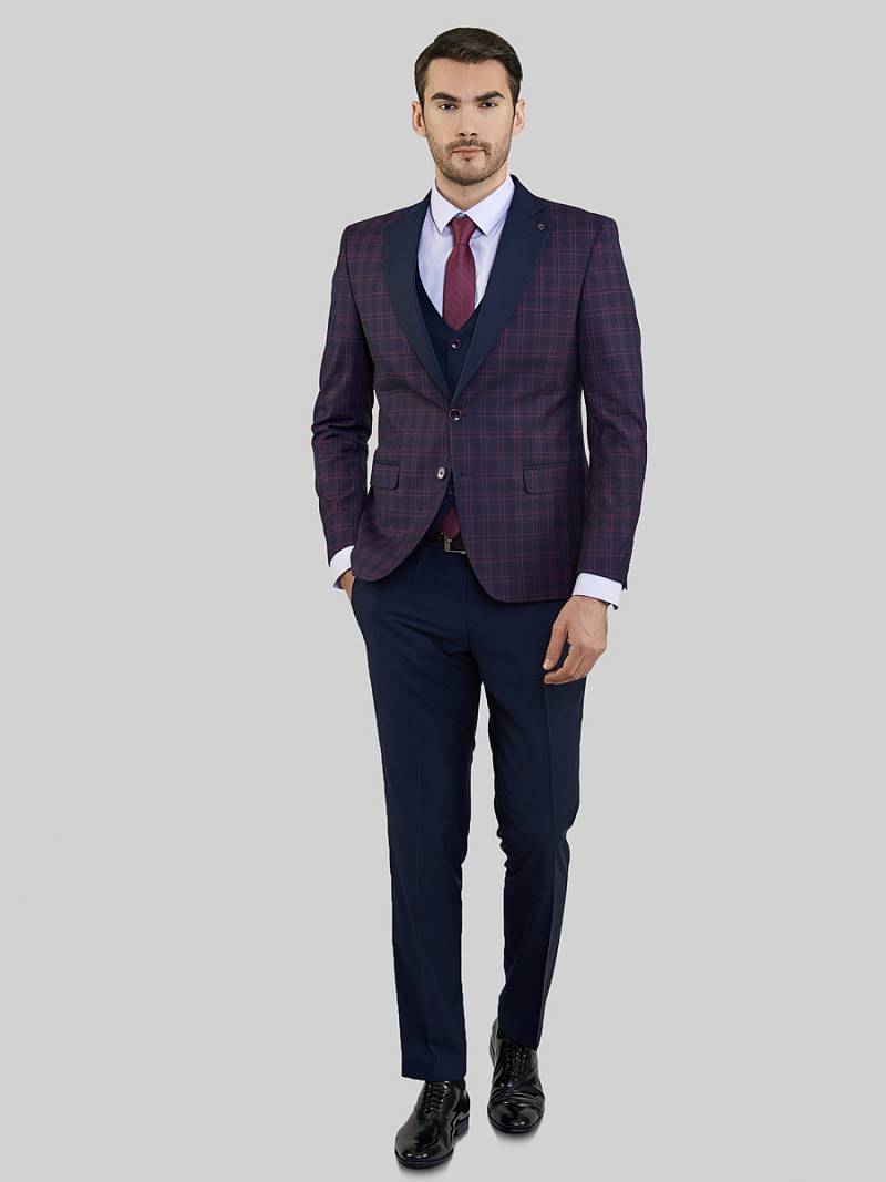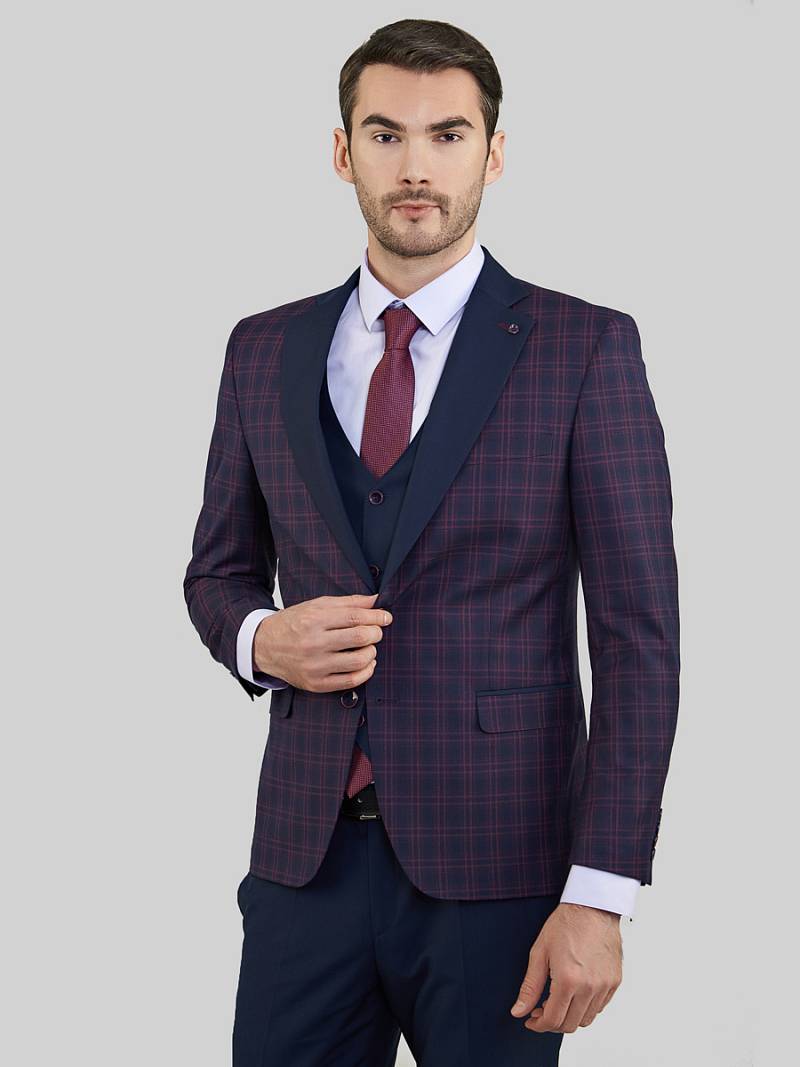 Костюм мужской тройка. Slim fit, 2 пуговицы, 2 шлицы, Пиджак из ткани в клетку, Брюки и жилет из однотонной ткани "гладь"компаньон. Спинка жилета полностью из ткани. Верхний воротник, лацканы, рамки боковых прорезных карманов из отделки темно-синей ткани "гладь".