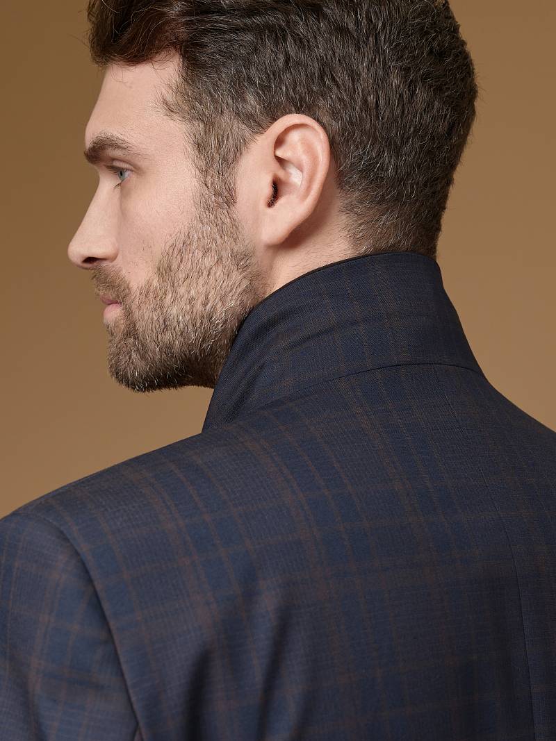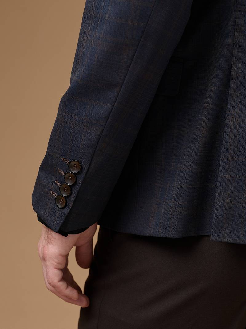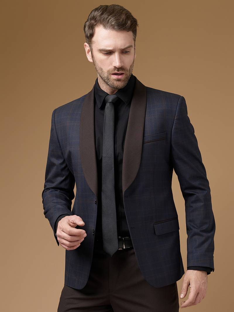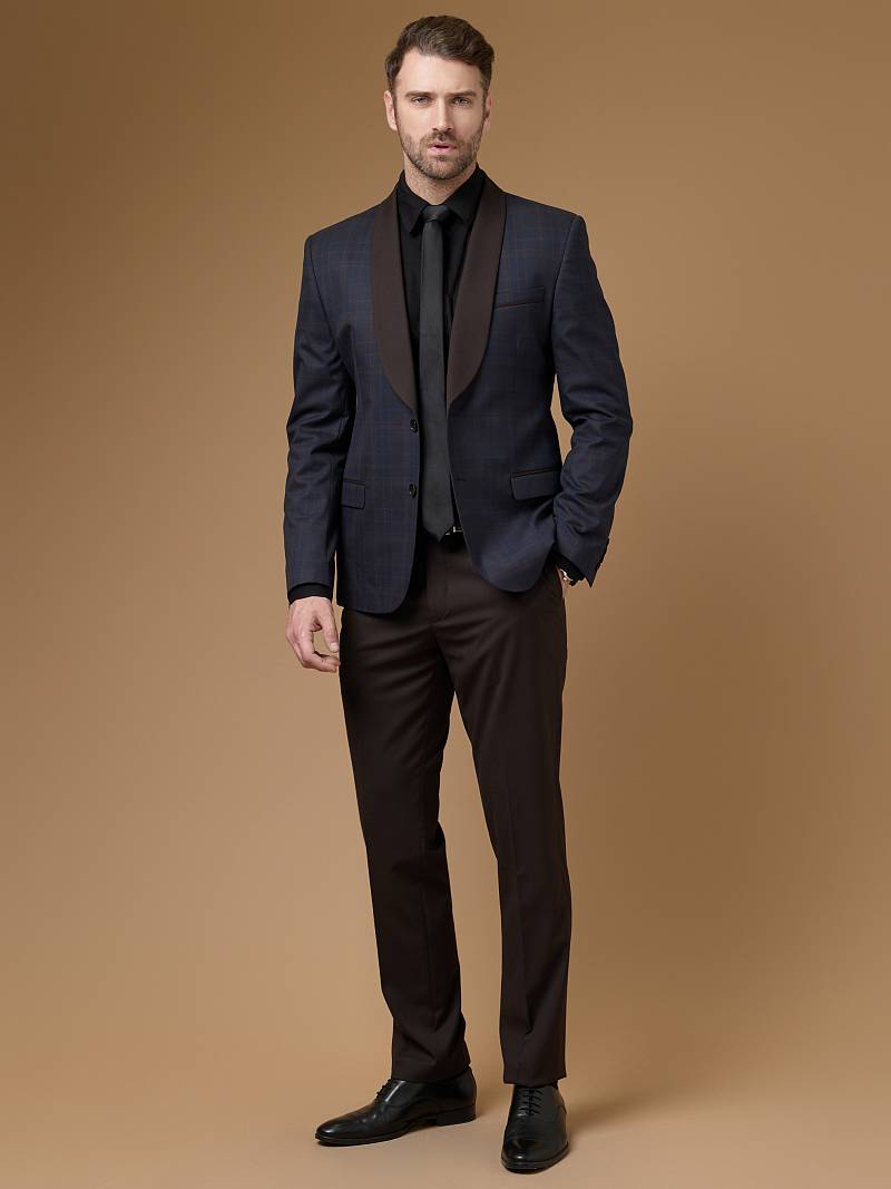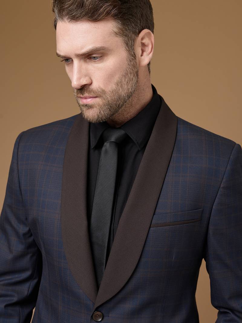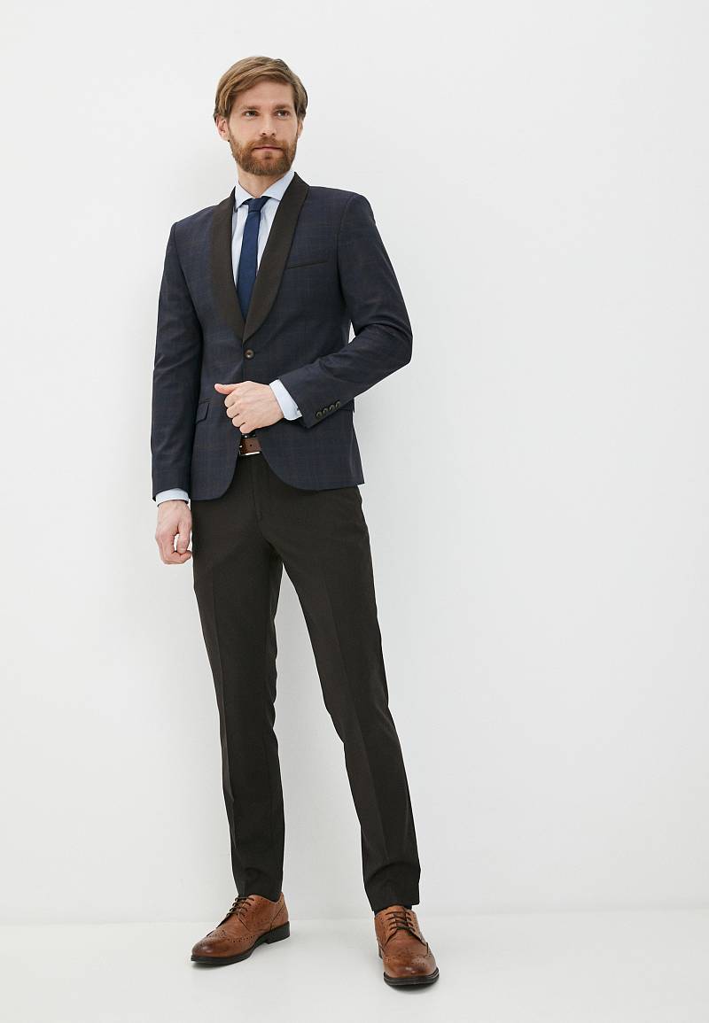 Классический костюм Slim fit. Пиджак с воротником-шалька на две пуговицы, с боковыми и нагрудным карманами, по спинке две шлицы, в нагрудном кармане расположен декоративный платок. Брюки без защипов с боковыми и одним задним карманом. Брюки и воротник пиджака выполнены из ткани компаньона.