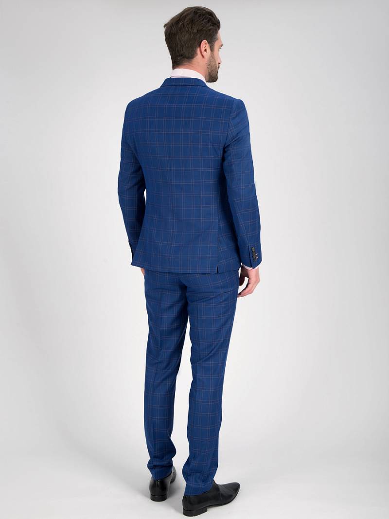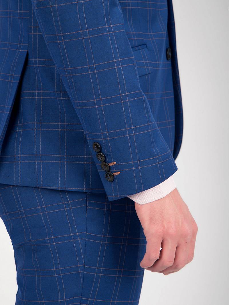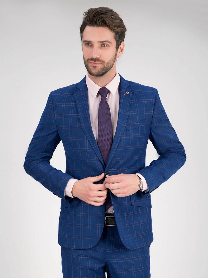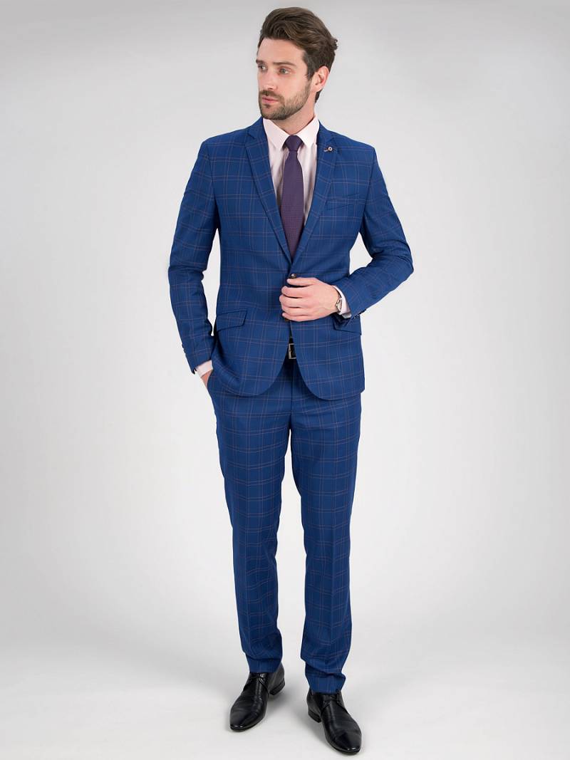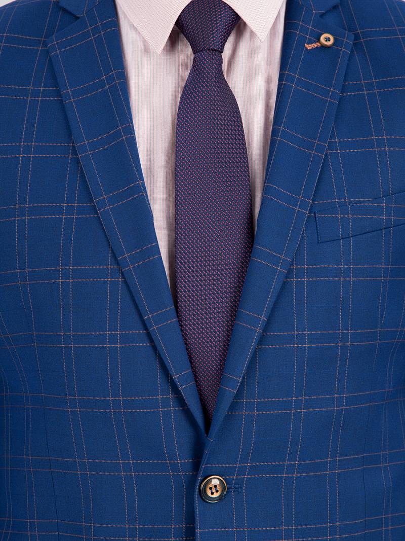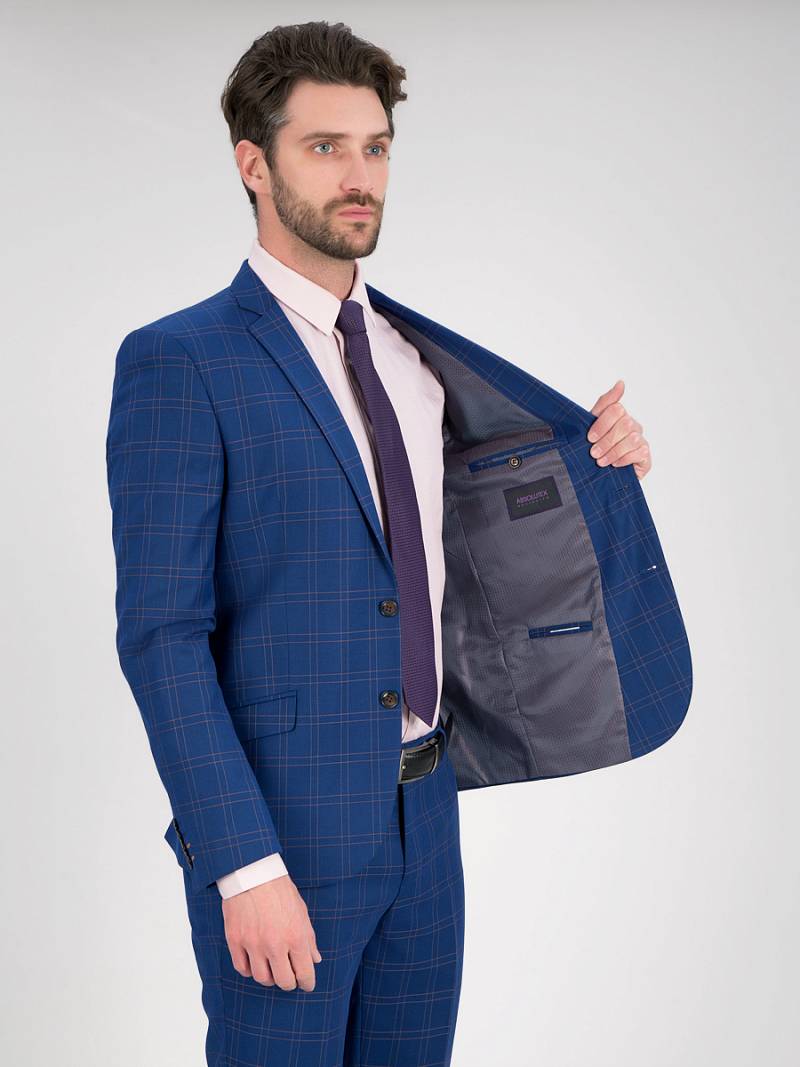 Классический костюм двойка Slim fit. Пиджак на две пуговицы, с боковыми и нагрудным карманами, по спинке две шлицы, контрастные петли, в фасонной петле декоративная пуговица. Брюки без защипов с боковыми и одним задним карманом.