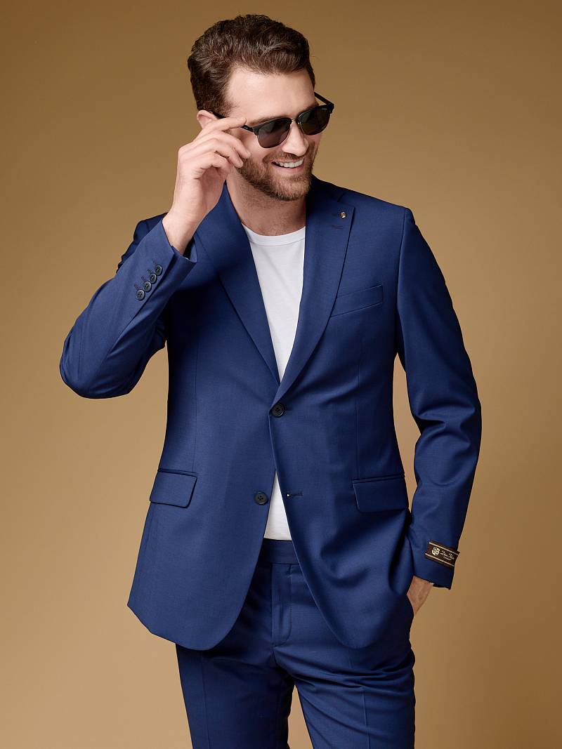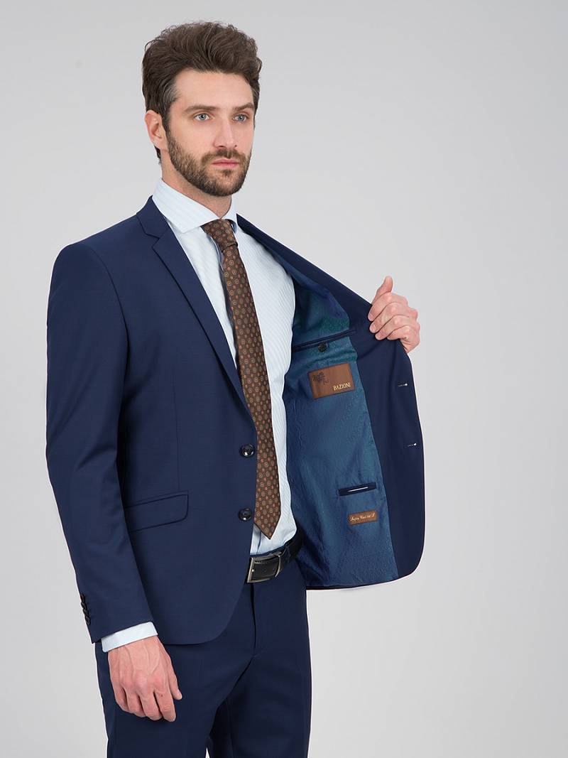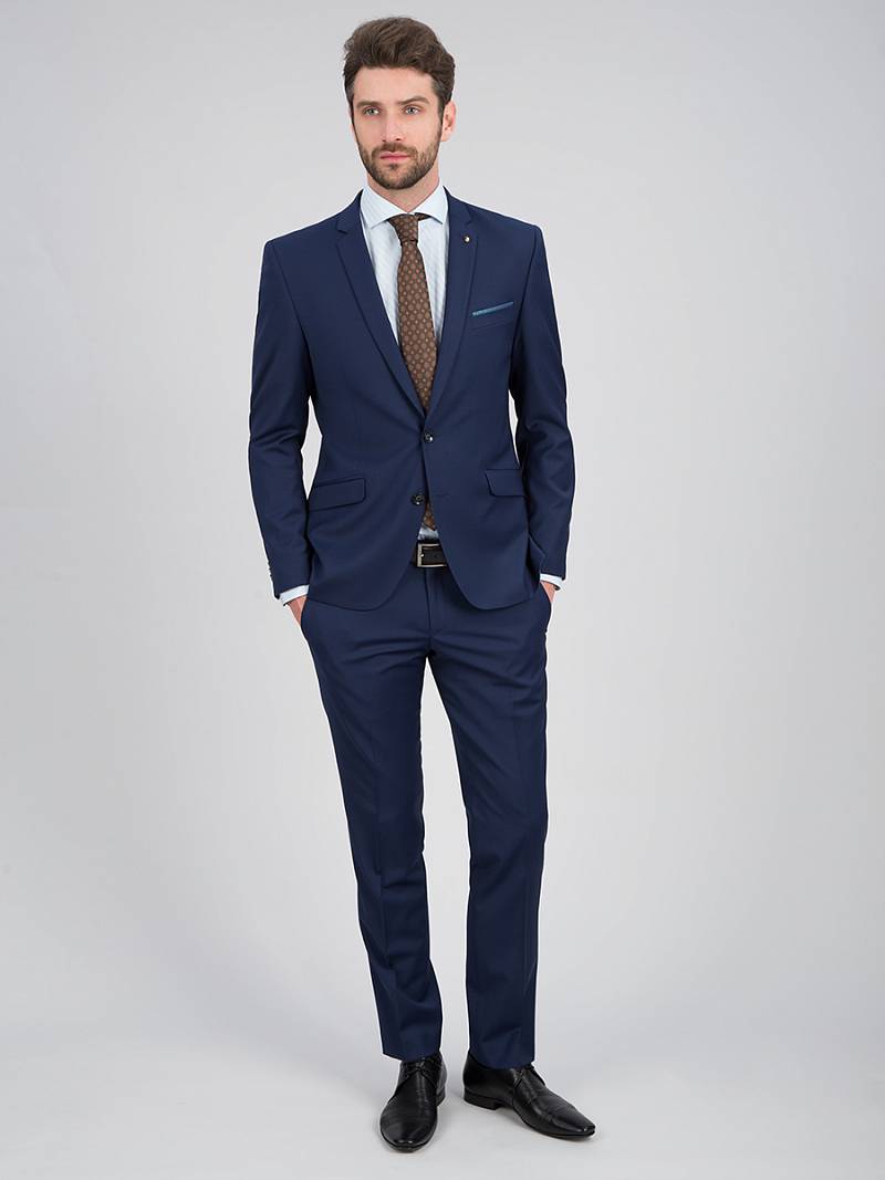 Классический костюм двойка Slim fit (ПРИЛЕГАЮЩИЙ СИЛУЭТ), рекомендуется брать на размер больше.Пиджак однобортный на две пуговицы, с двумя боковыми карманами с клапанами и нагрудной листочкой. Рукава втачные, двухшовные со шлицей и четырьмя декоративными пуговицами. По спинке расположены две шлицы. Пиджак на подкладке, с двумя внутренними карманами. Брюки без защипов, с боковыми наклонными карманами и двумя задними карманами «в рамку». Передние половинки на подкладке. Верхний срез брюк обработан поясом с корсажной лентой и шлевками под ремень. Застежка обработана на тесьму-молнию, с петлей-пуговицей на поясе и усилен металлическим крючком.