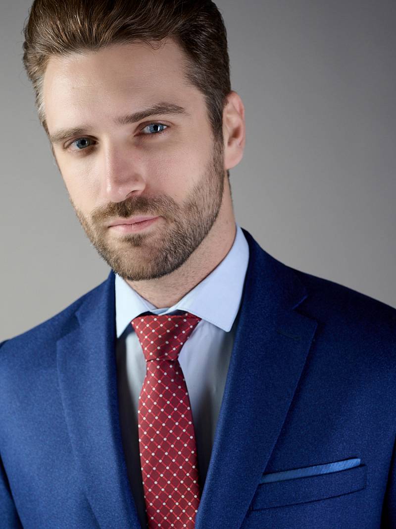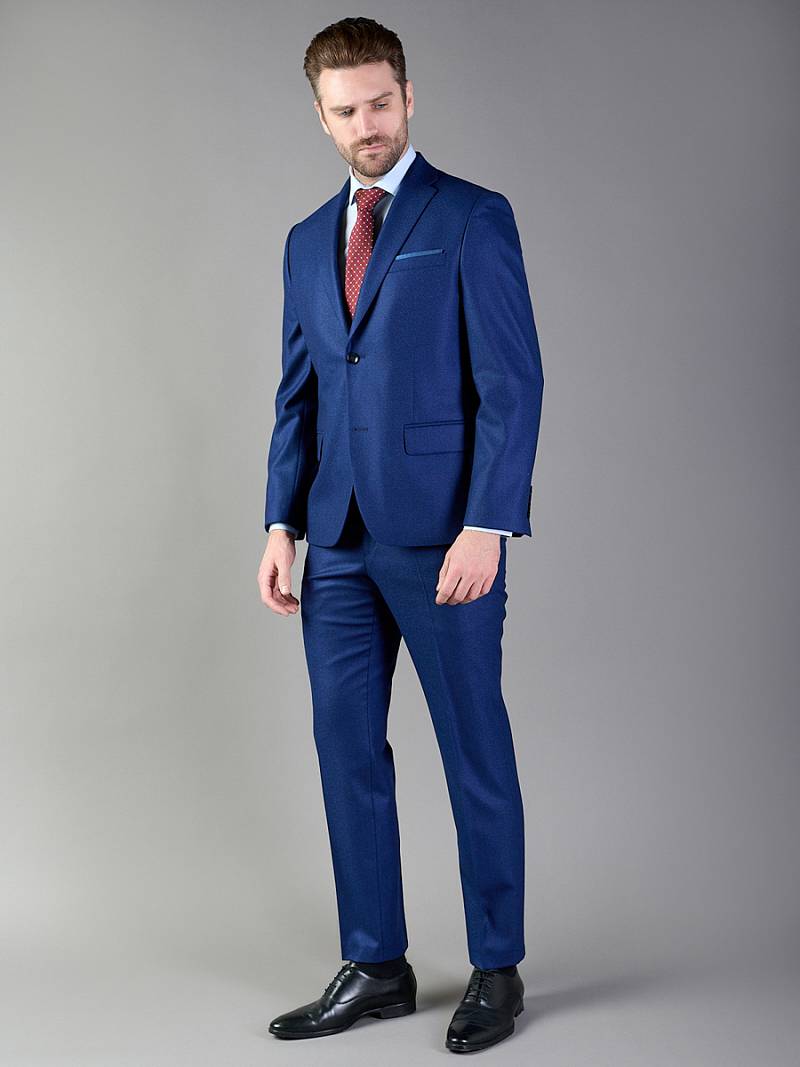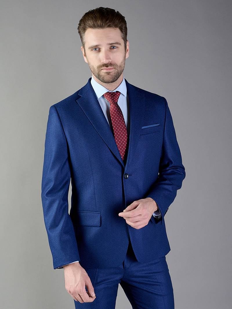 Классический костюм двойка Classic fit. Пиджак на две пуговицы, с боковыми и нагрудным карманами, по спинке две шлицы. Брюки без защипов с боковыми и одним задним карманом.
