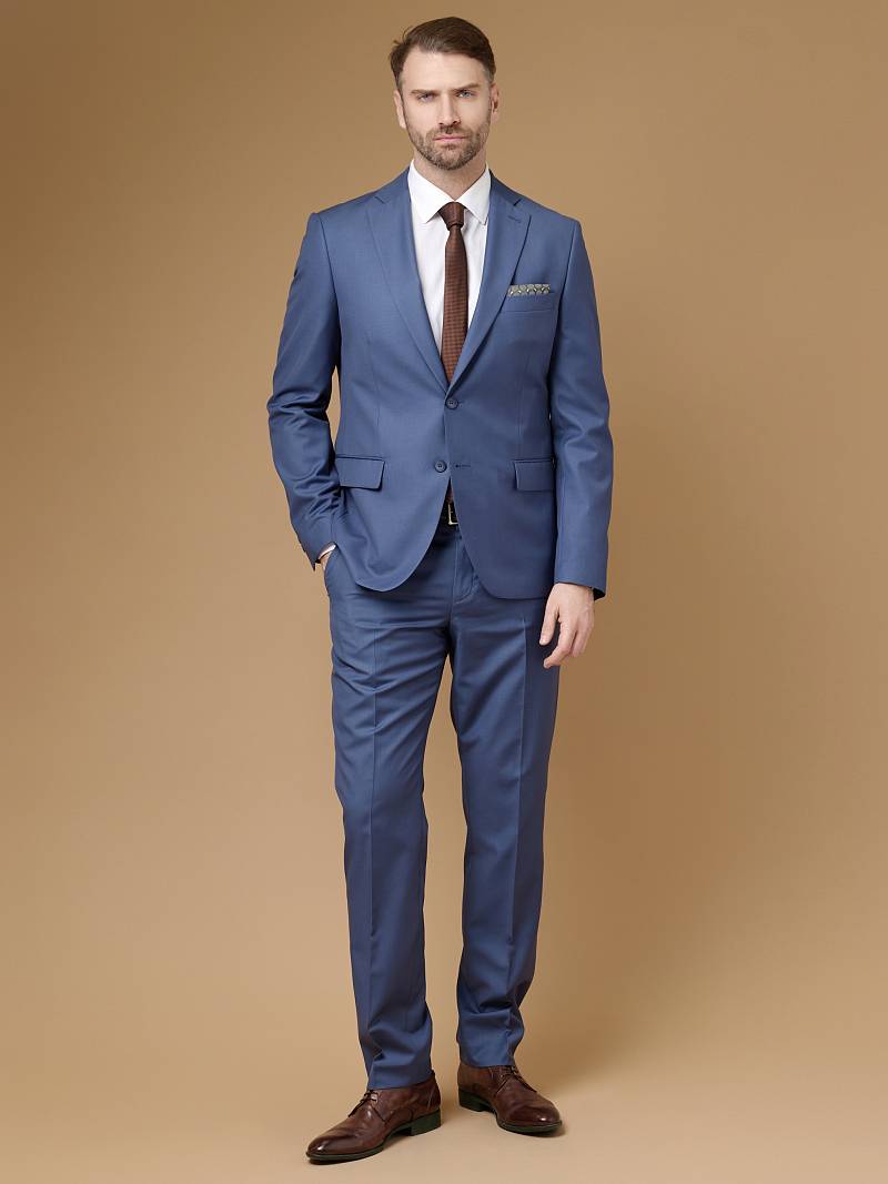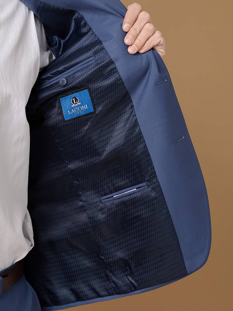 Slim fit (ПРИЛЕГАЮЩИЙ СИЛУЭТ), рекомендуется брать на размер больше. Классический костюм двойка марки LACONI– это идеальное сочетание стиля и комфорта для мужчин, которые ценят качественный пошив и изысканный дизайн. Для пошива лаконичного синего классического костюма использовали ткань с содержанием прочных волокон, которые не сковывают движение и обеспечивает дополнительный комфорт и удобство. Пиджак с классической шириной лацкана и мягкой линией плеч дополнили сзади двумя шлицами, модель садится точно по фигуре и отлично подходит для любого случая в жизни. Пиджак обработан на подкладке с двумя внутренними карманами. Для придания образу торжественности подкладку нагрудного кармана можно использовать как платок. Брюки прямого кроя со стрелками и заниженной посадкой, с боковыми наклонными карманами и одним задним карманом "в рамку". Верхний срез брюк обработан поясом с корсажной лентой и шлевками под ремень. Дизайнеры марки LACONI тщательно подходят к выбору материалов. Пуговицы подбираются и красятся индиви