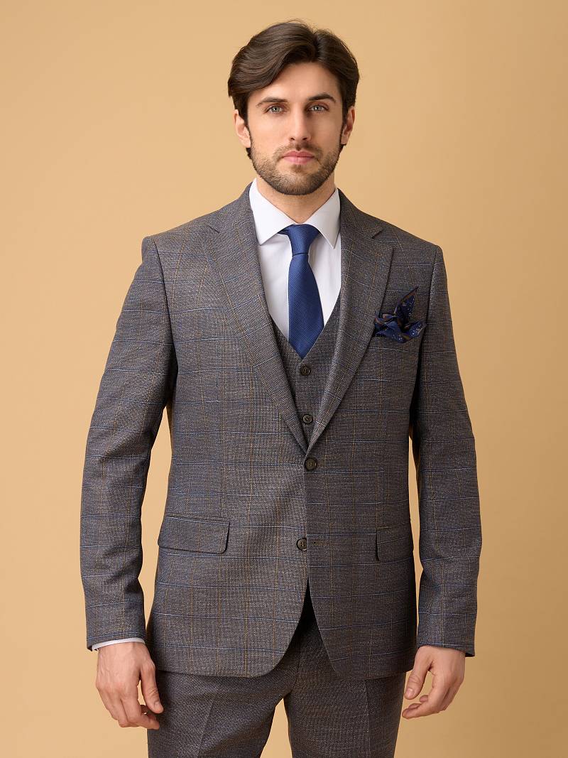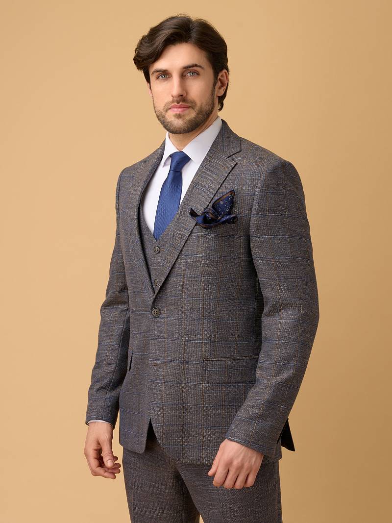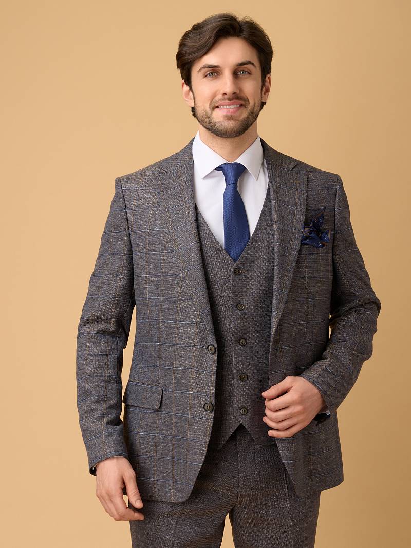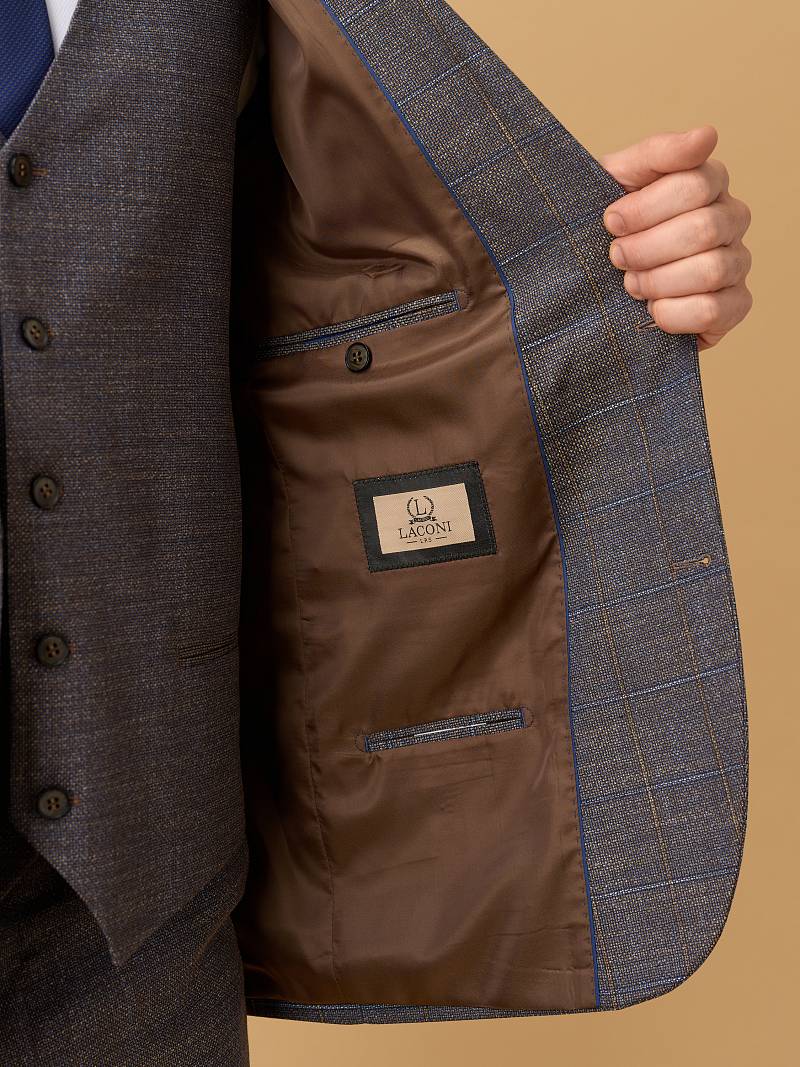 Представляем элегантный, статусный костюм в лучших традициях итальянского кроя от марки LACONI, сочетающий классическую строгость и современную утонченность. Премиальная шерсть в благородной клетке подчеркивает респектабельность, а безупречная посадка обеспечивает комфорт. Такой костюм подчеркивает престиж и тонкий вкус владельца, оставаясь при этом универсальным элементом гардероба. Пиджак с мягкой плечевой линией на двух пуговицах, двумя шлицами сзади и лацканами средней ширины выполнен из ткани в клетку, дополнен брюками и жилетом из однотонной ткани. Брюки прямого кроя со стрелками и средней посадкой, с боковыми наклонными карманами и двумя задними карманом "в рамку". Верхний срез брюк обработан поясом с корсажной лентой и шлевками под ремень. Внутри на подкладке расположены два внутренних кармана и выполнена отделка из контрастной вспушки и канта. Жилет с двумя боковыми карманами, по спинке расположен хлястик для регулировки объема в области талии. Дизайнеры марки LACONI тщательно подходят к выбору материалов. Пуговицы подбираются и красятся индивидуально под каждую ткань, а прикладные материалы используют только от передовых производителей.