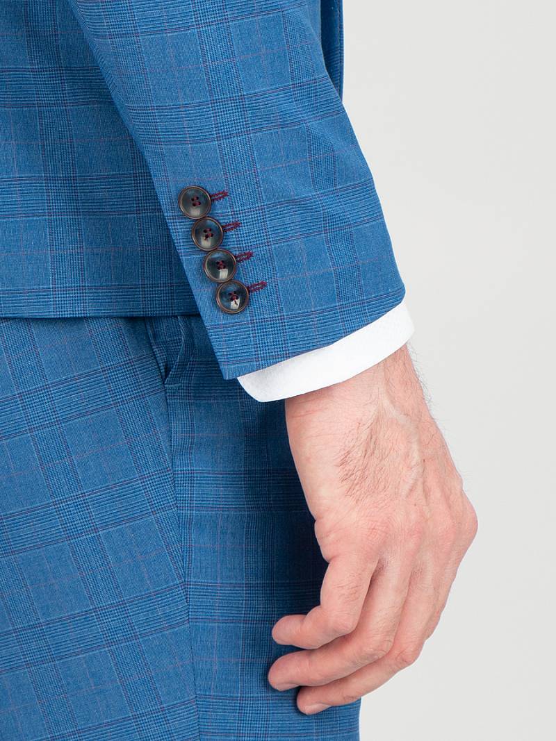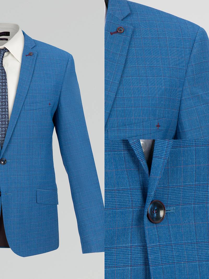 Ultra slim fit, две пуговицы, две шлицы. Контрастные петли, декоративная пуговица на лацкане, нагрудный платок.