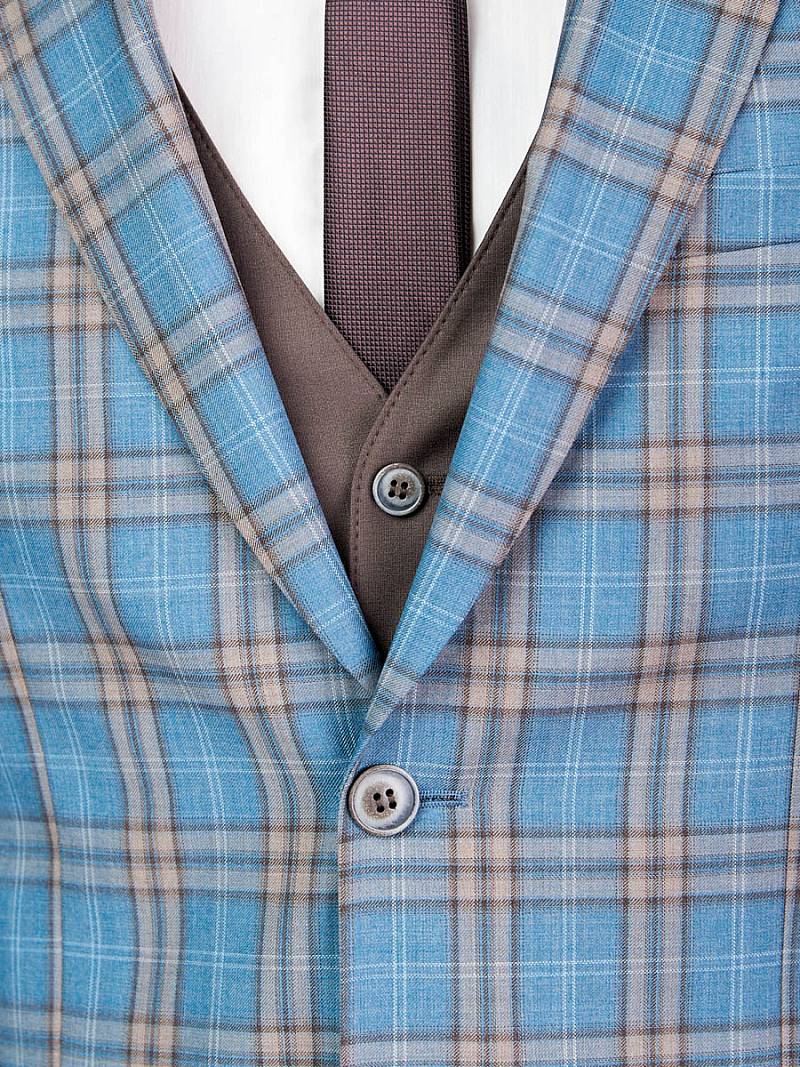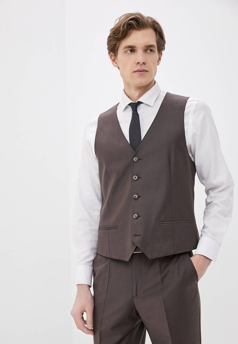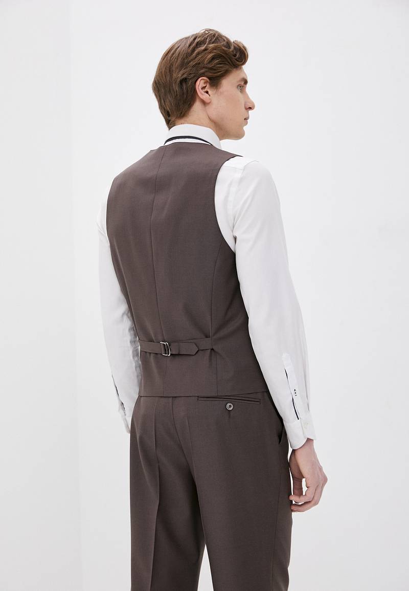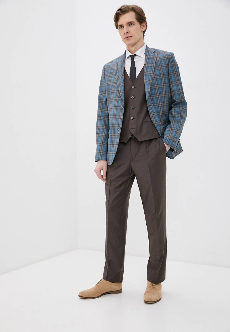 Classic fit. Однобортный костюм тройка на две пуговицы, по спинке две шлицы. Брюки выполнены из ткани компаньона.