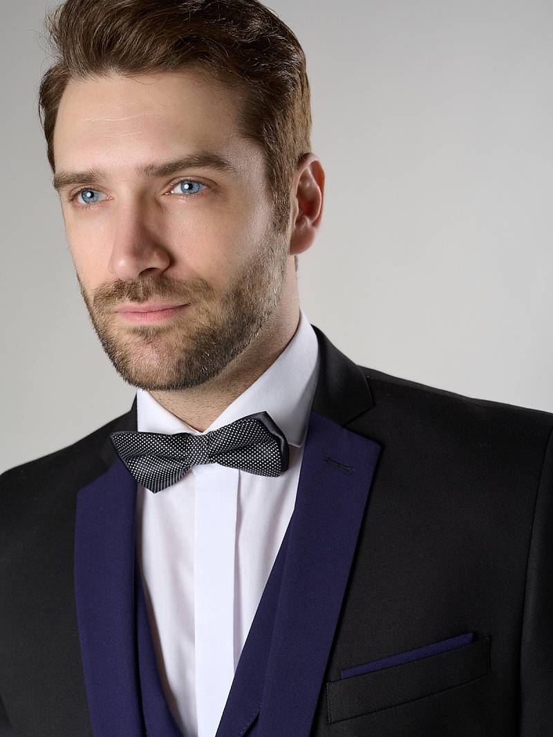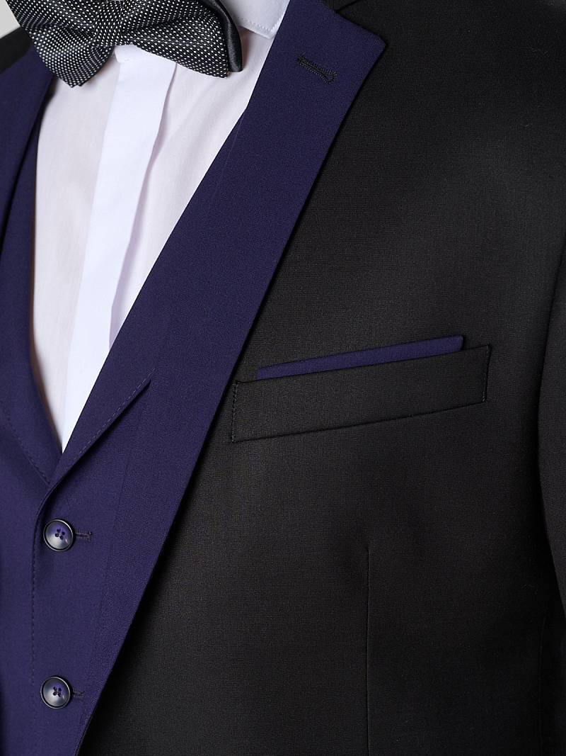 Классический костюм-тройка Slim fit. Пиджак на две пуговицы, с боковыми и нагрудным карманами, по спинке две шлицы, в нагрудном кармане расположен декоративный платок. Брюки без защипов с боковыми и одним задним карманом. Жилет и лацкан пиджака выполнены из ткани компаньона.
