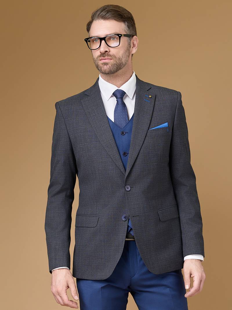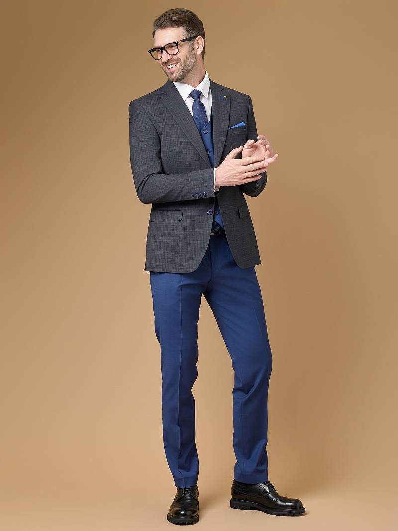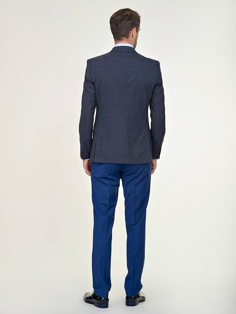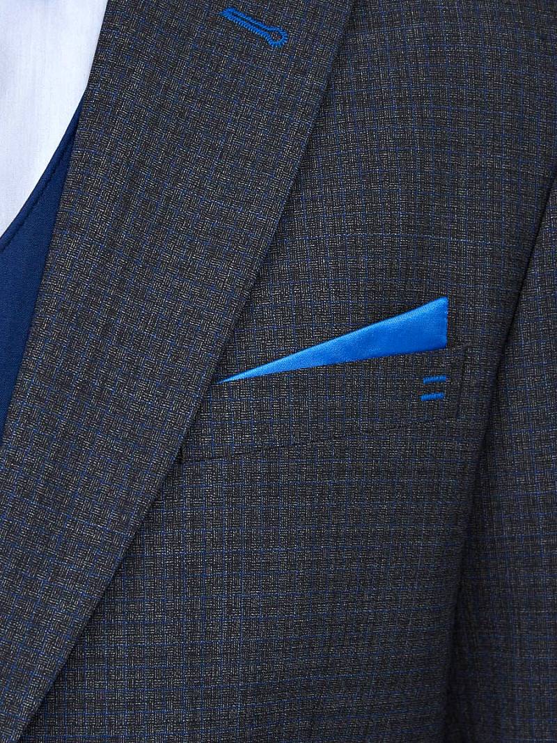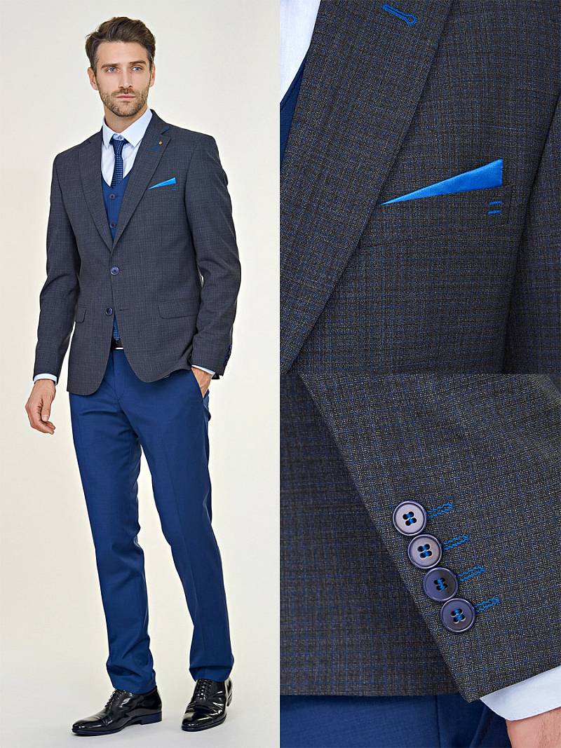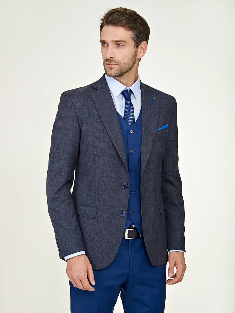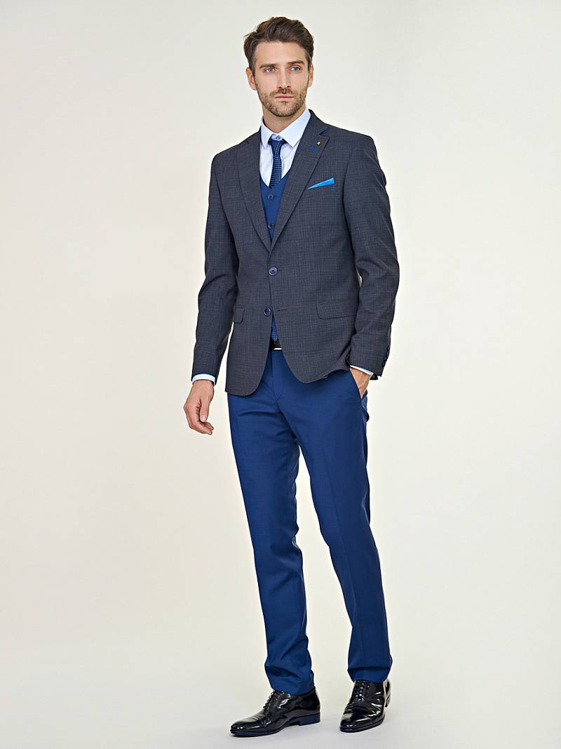 Классический костюм-тройка Slim fit. Пиджак на две пуговицы, с боковыми и нагрудным карманами, по спинке две шлицы. Брюки без защипов с боковыми и двумя задними карманами. Брюки и жилет выполнены из ткани компаньона.
