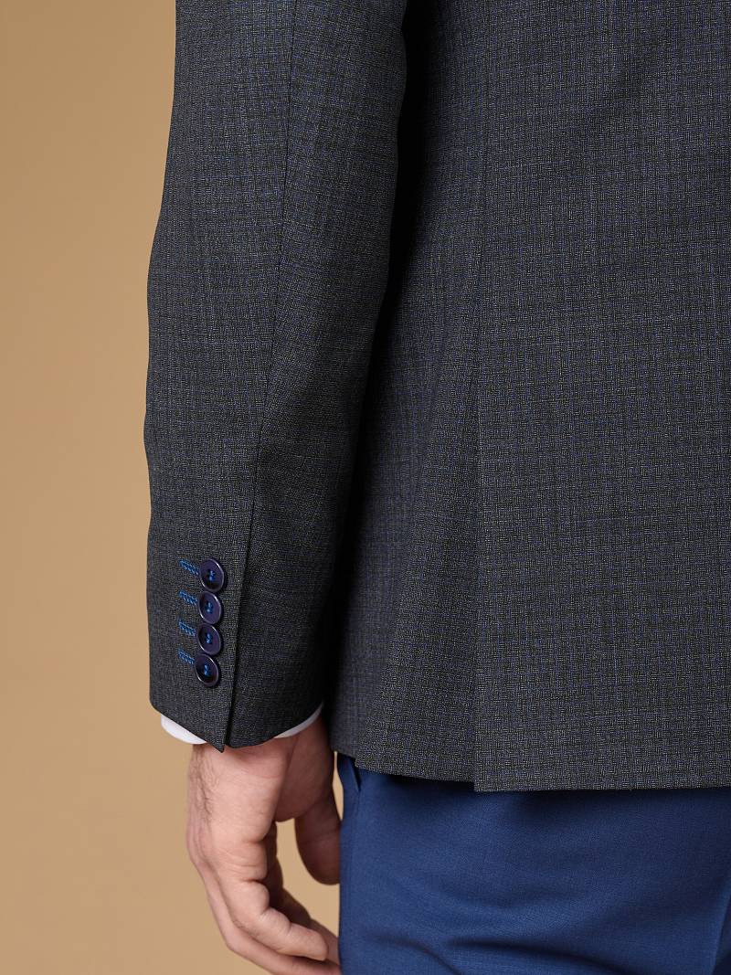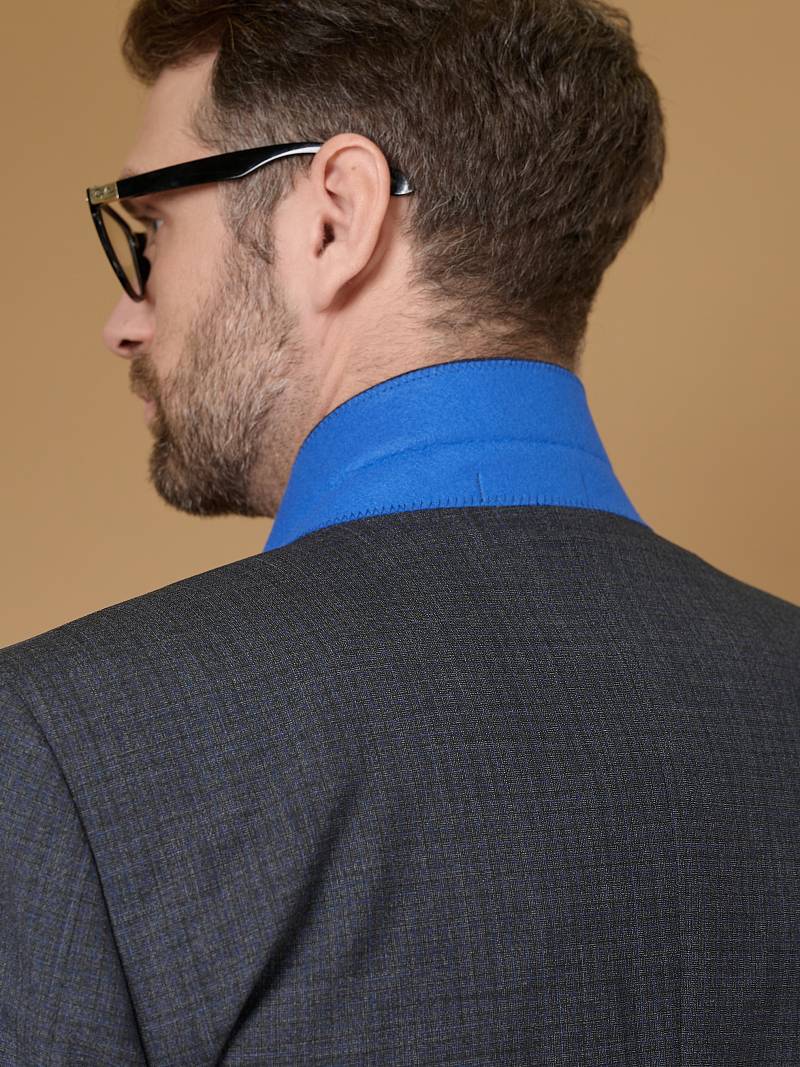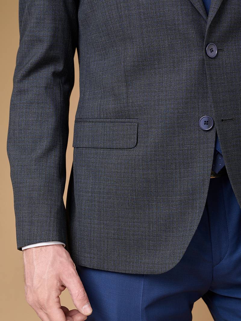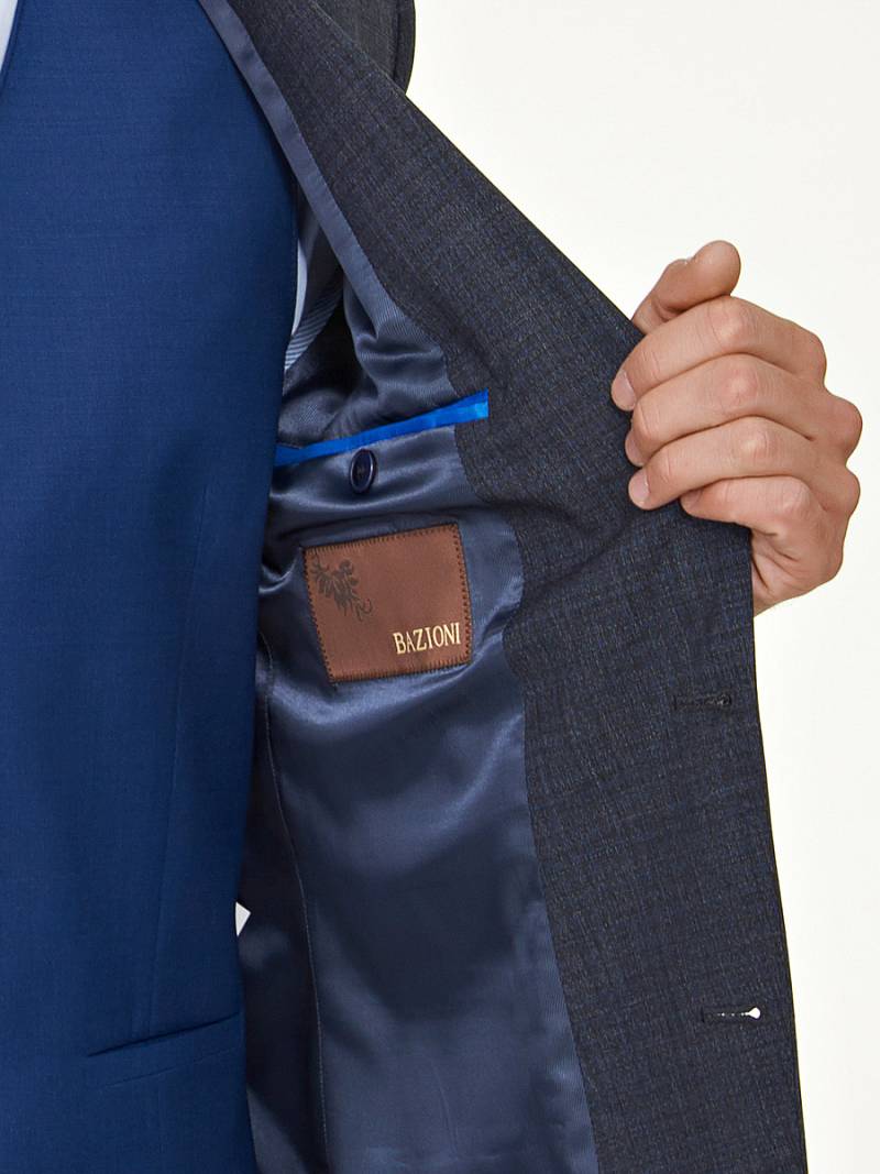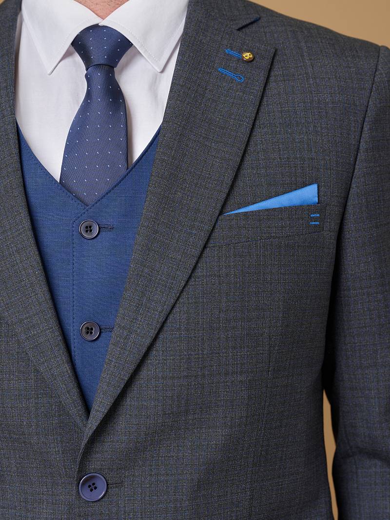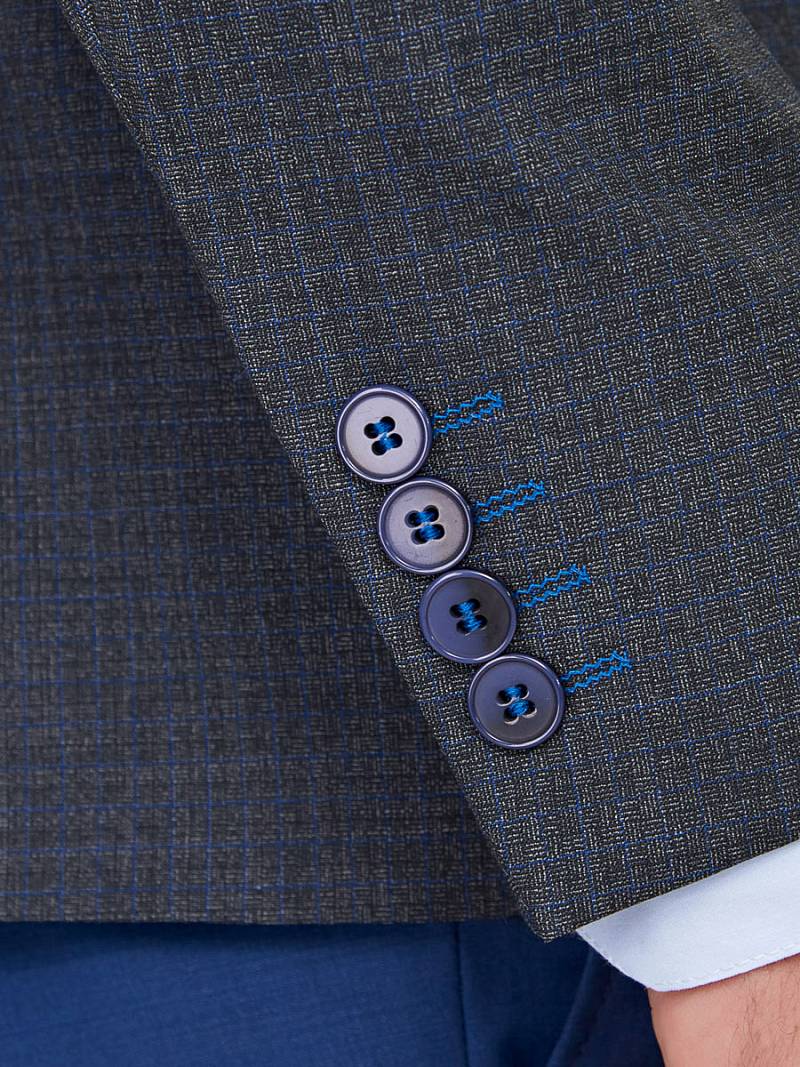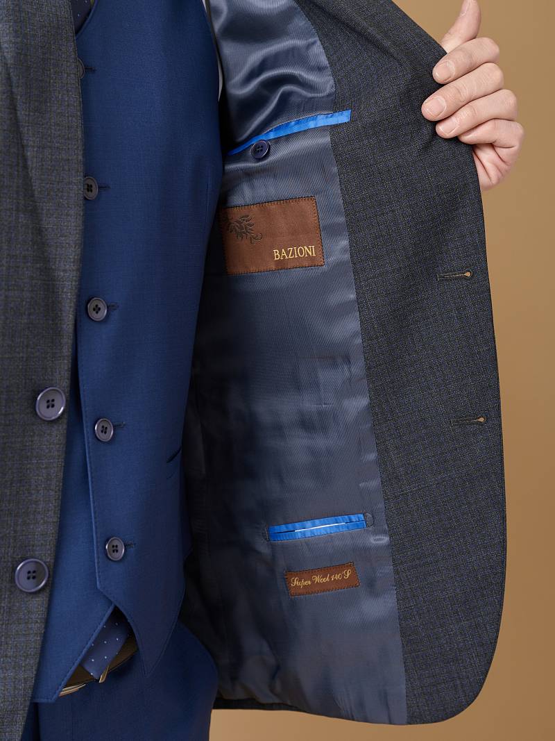 Классический костюм-тройка Slim fit. Пиджак на две пуговицы, с боковыми и нагрудным карманами, по спинке две шлицы. Брюки без защипов с боковыми и двумя задними карманами. Брюки и жилет выполнены из ткани компаньона.