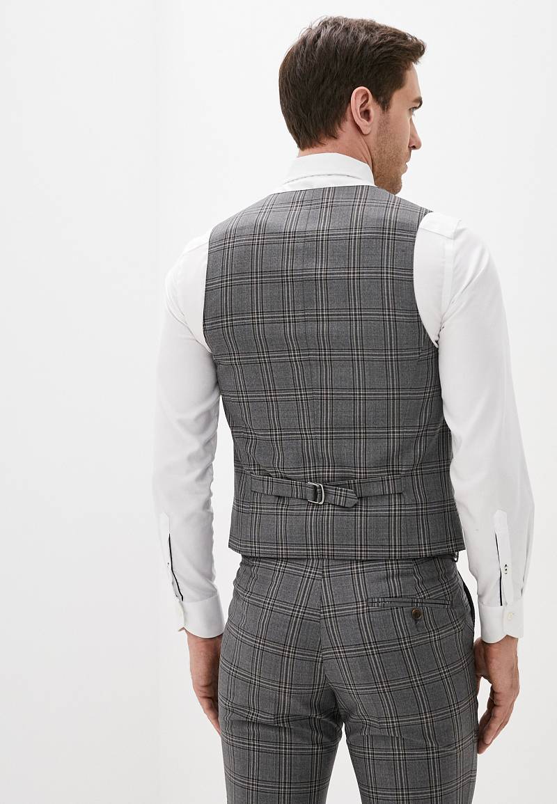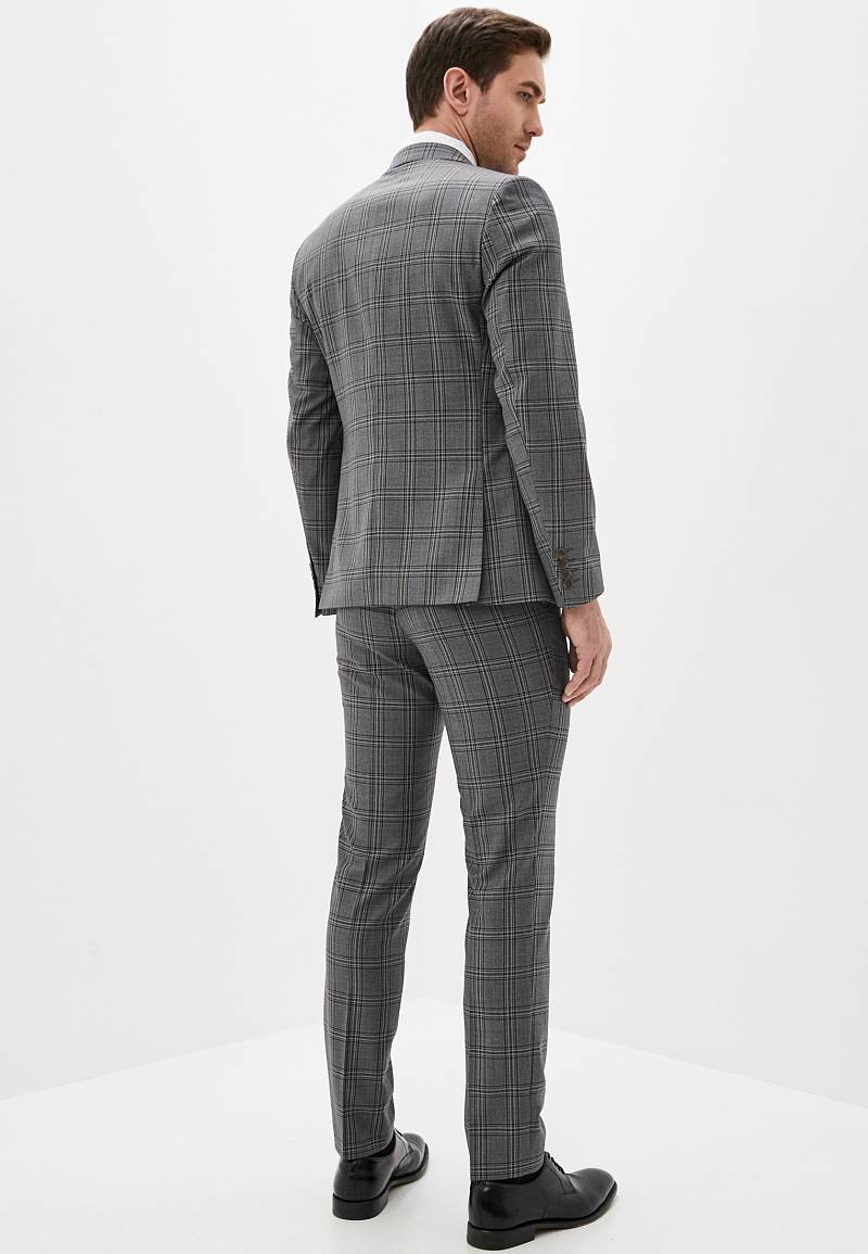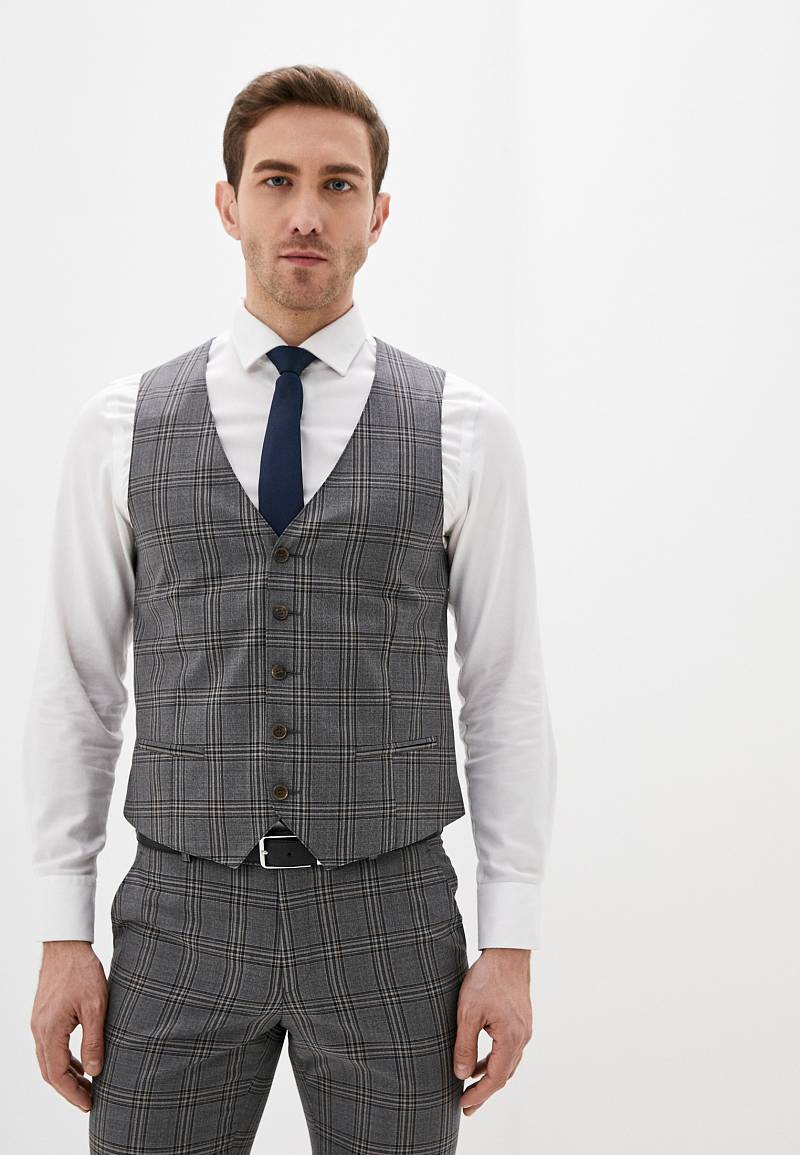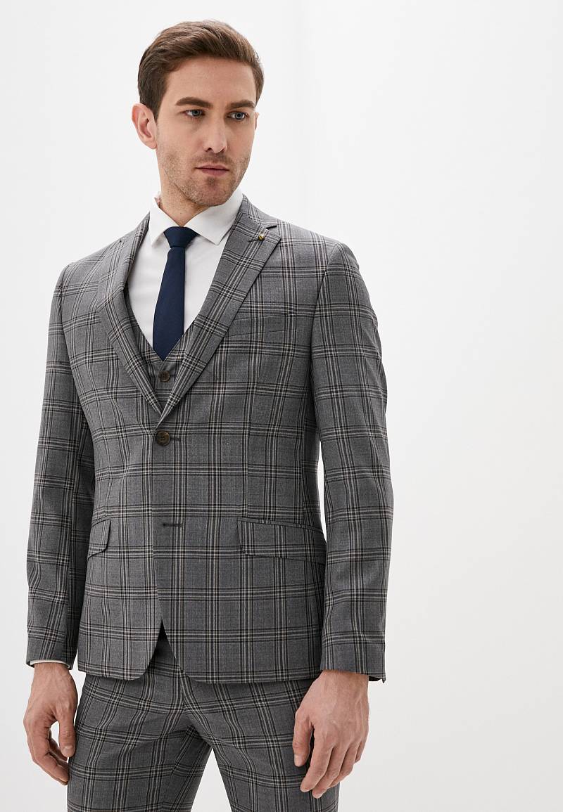 Классический костюм-тройка Slim fit . Пиджак на две пуговицы, с боковыми и нагрудным карманами, по спинке две шлицы. Брюки без защипов с боковыми и одним задним карманом.