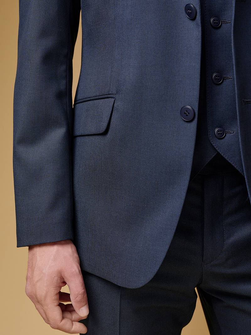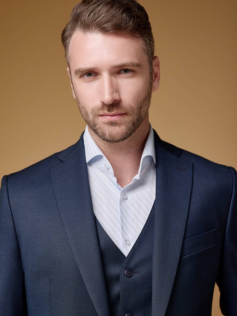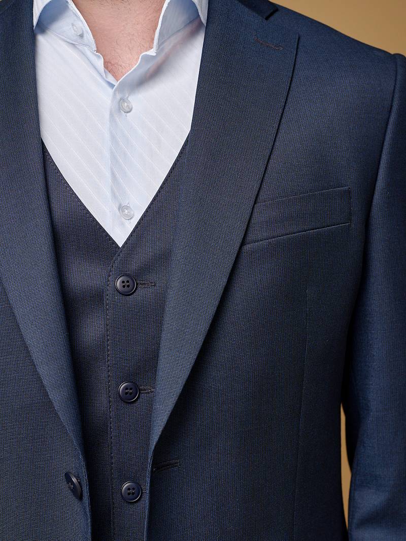 Классический костюм тройка Slim fit (ПРИЛЕГАЮЩИЙ СИЛУЭТ), рекомендуется брать на размер больше.Пиджак однобортный на две пуговицы, с двумя боковыми карманами с клапанами и нагрудной листочкой. Рукава втачные, двухшовные со шлицей и четырьмя декоративными пуговицами. По спинке расположены две шлицы. Пиджак на подкладке, с двумя внутренними карманами. Брюки без защипов, с боковыми наклонными карманами и одним задним карманом «в рамку». Передние половинки на подкладке. Верхний срез брюк обработан поясом с корсажной лентой и шлевками под ремень. Застежка обработана на тесьму-молнию, с петлей-пуговицей на поясе и усилен металлическим крючком. Жилет с двумя боковыми карманами, по спинке расположен хлястик для регулировки объема в области талии.