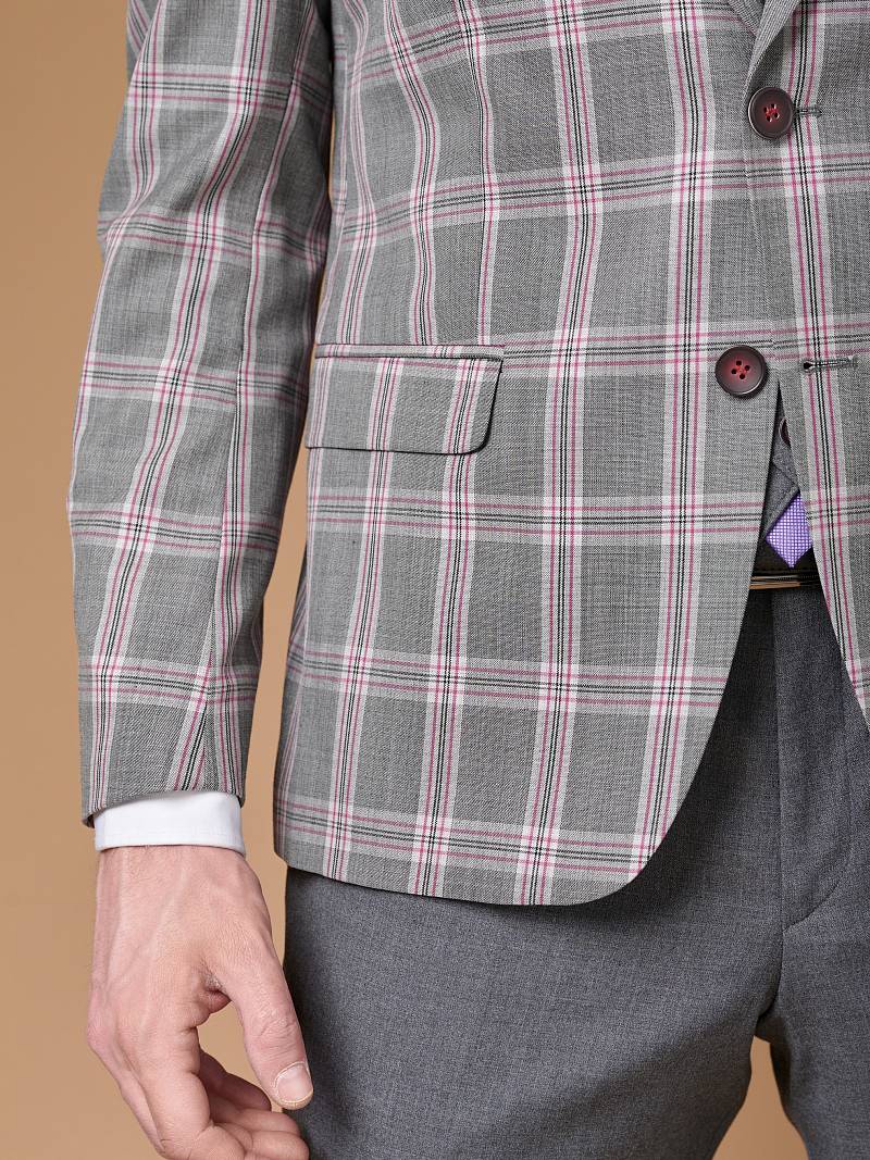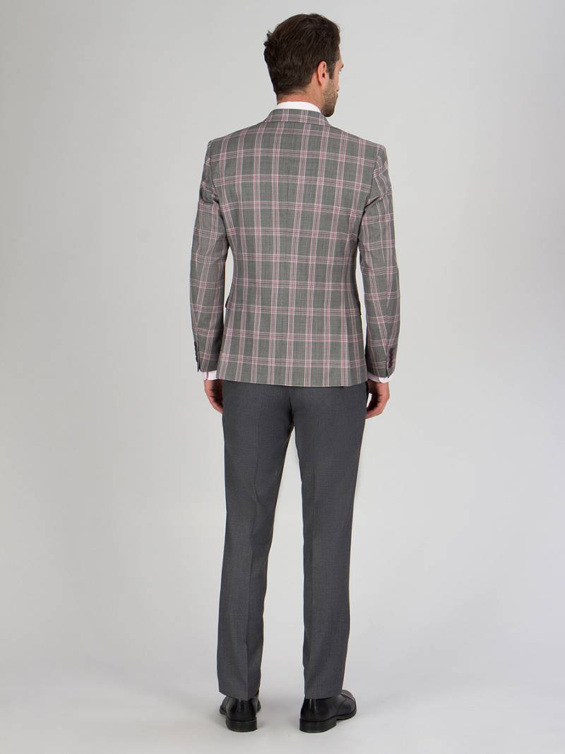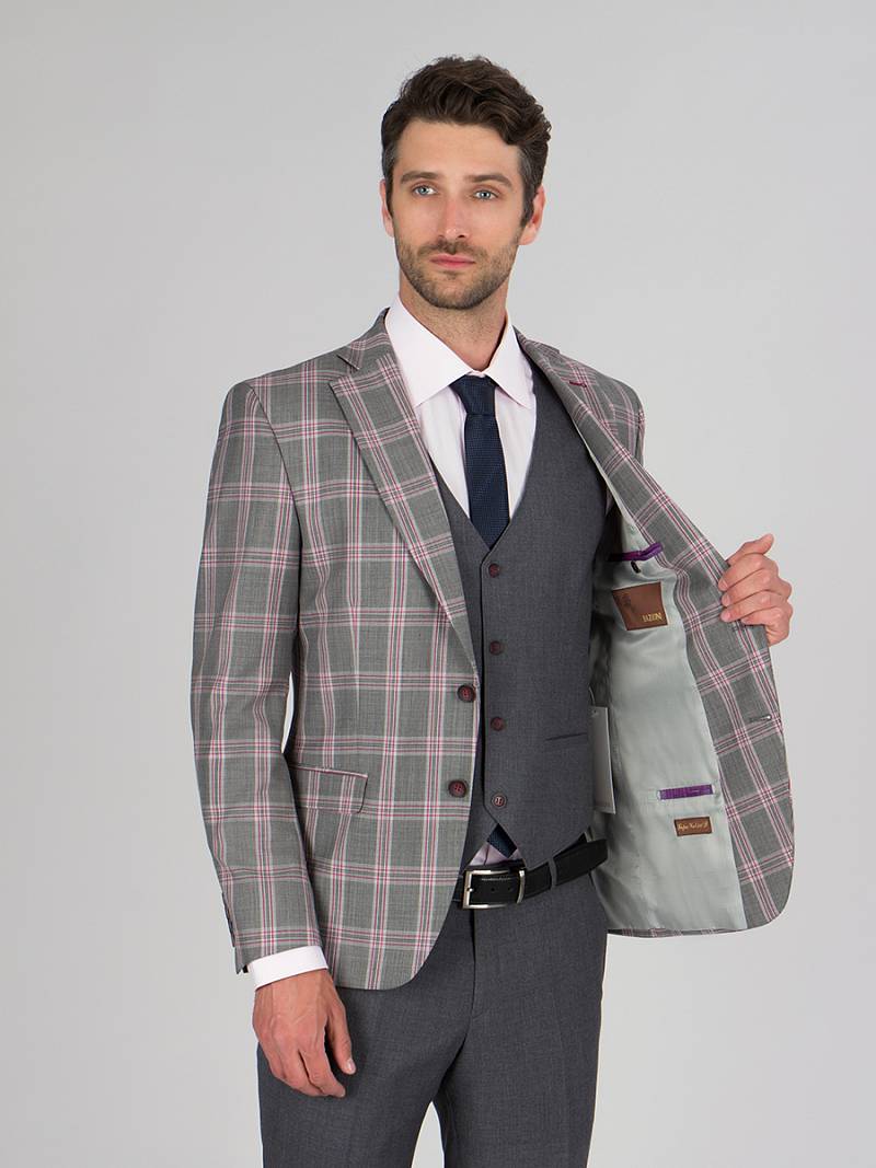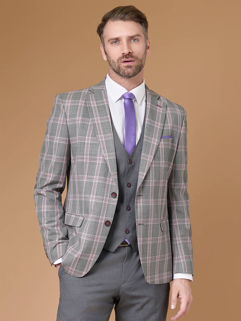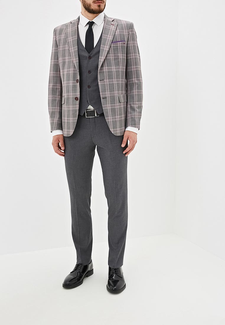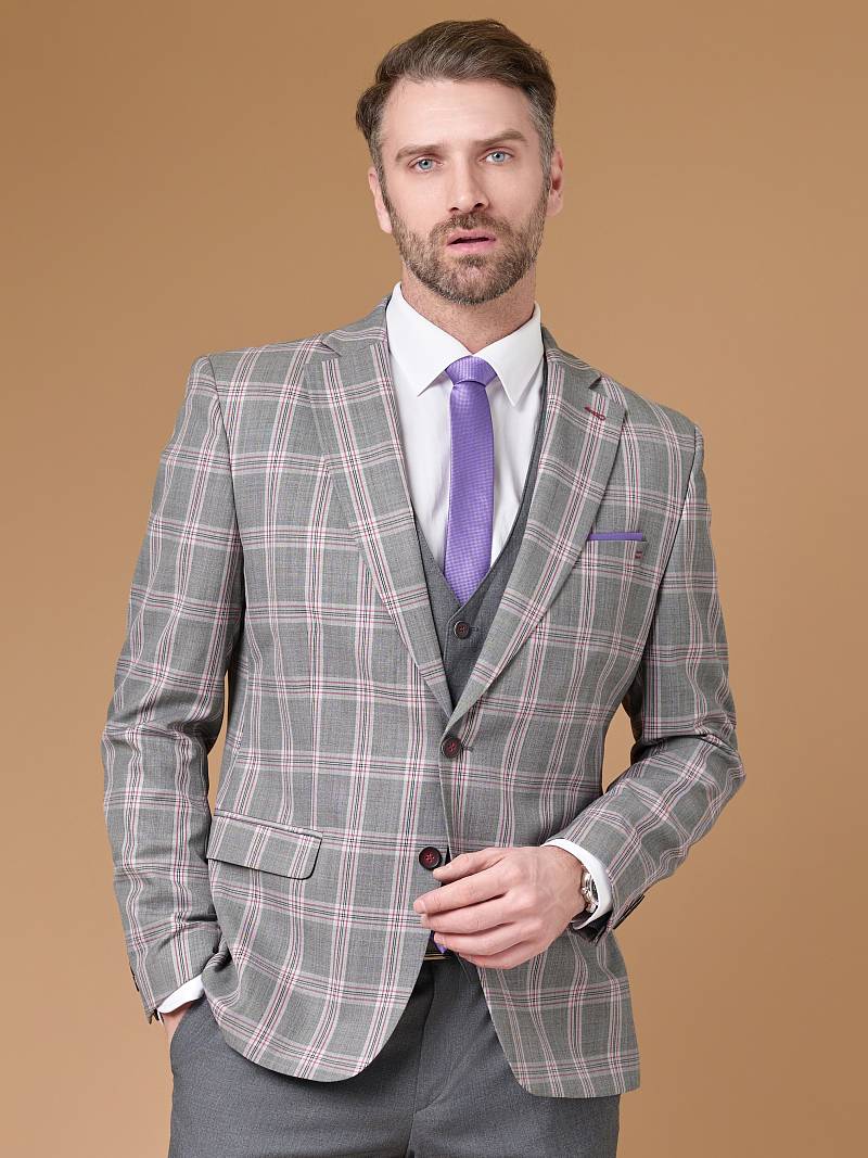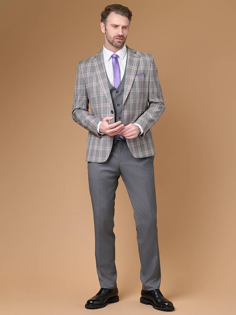 Классический костюм-тройка Slim fit. Пиджак на две пуговицы, с боковыми и нагрудным карманами, по спинке две шлицы. Брюки без защипов с боковыми и двумя задними карманами. Брюки и жилет выполнены из ткани компаньона.