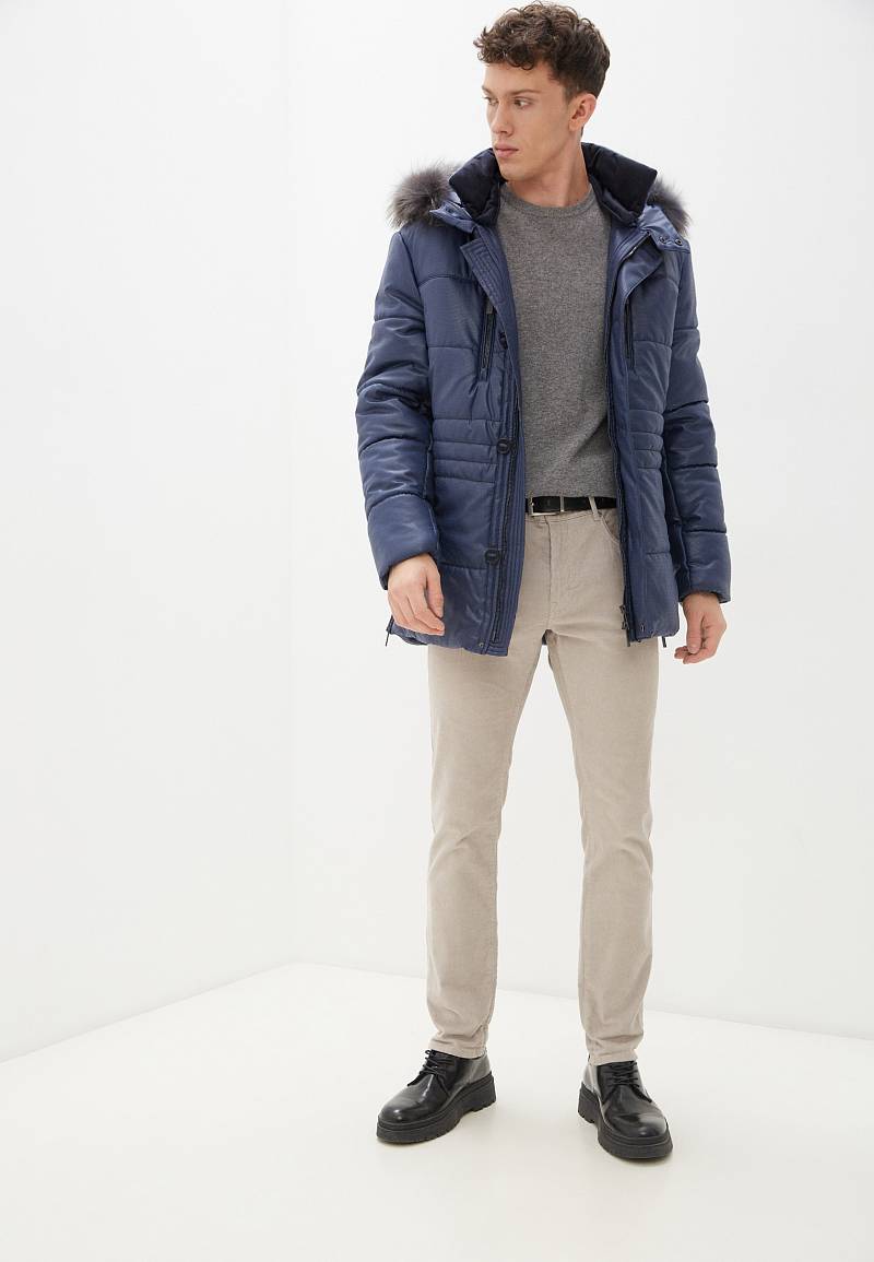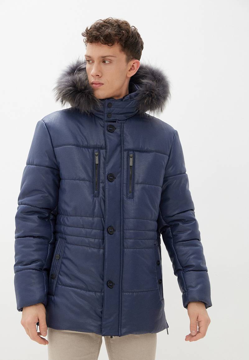 Куртка мужская прямого силуэта с капюшоном и меховой опушкой из натурального меха из ткани - имитирующей кожу Длина по спинке-82см. Ткань верха: 100%полиэстер. Подкладка: 100%полиэстер. Утеплитель: термофин 250 гр.