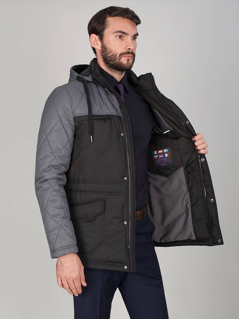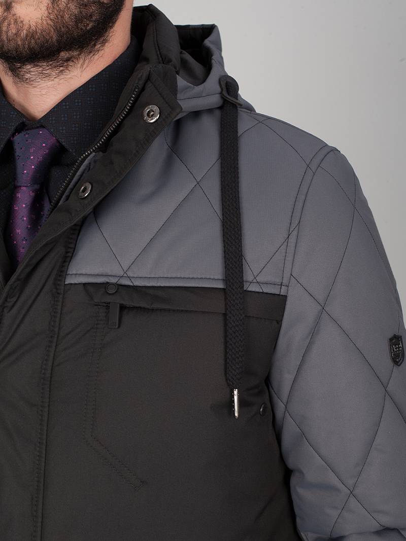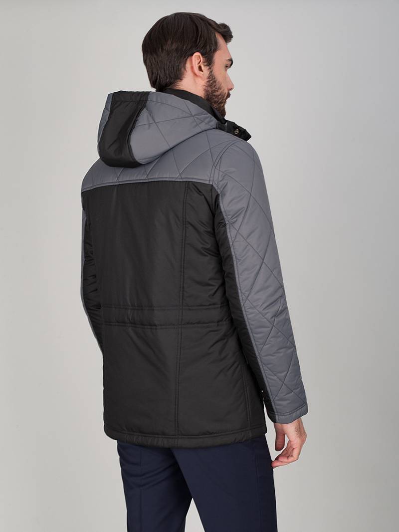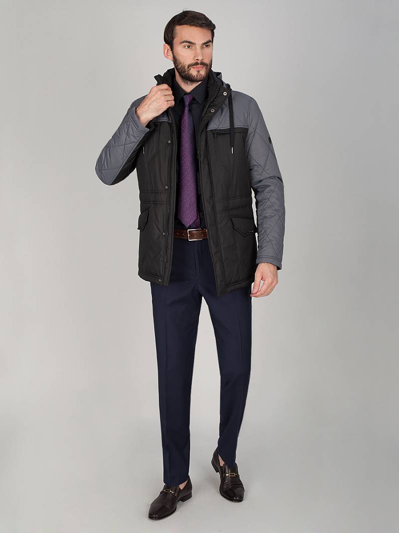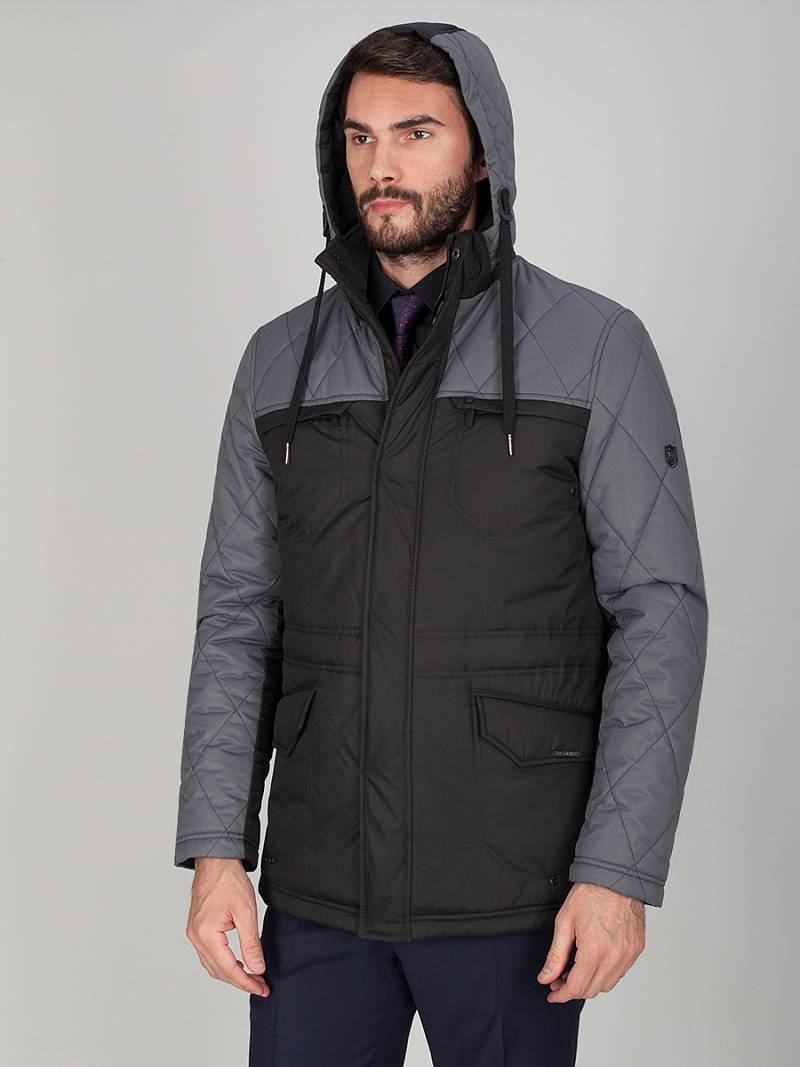Куртка мужская демисезонная прямого силуэта с капюшоном. Капюшон пристегивается на молнию, состоит из двух тканей компаньонов. Полочки и спинка -комбинированные с кокетками из стеганой отделочной ткани. Верхние части рукавов также из стеганой отделочной ткани. Воротник, основные полочки, спинка, нижние части рукавов и планка - из ткани серого цвета. На полочках расположены два верхних кармана в швах кокеток и два нижних кармана с клапаном, проложена отделочная строчка имитирующая накладные карманы. По линии талии проложена кулиса.