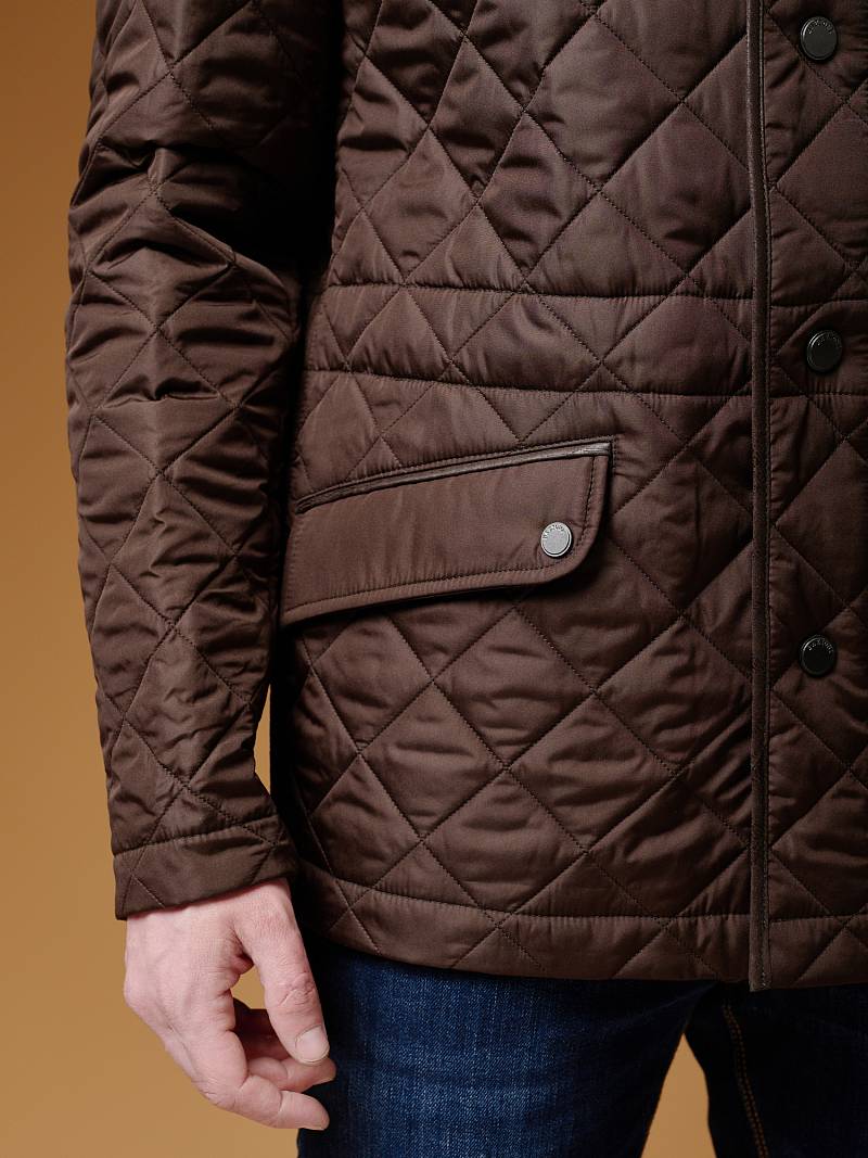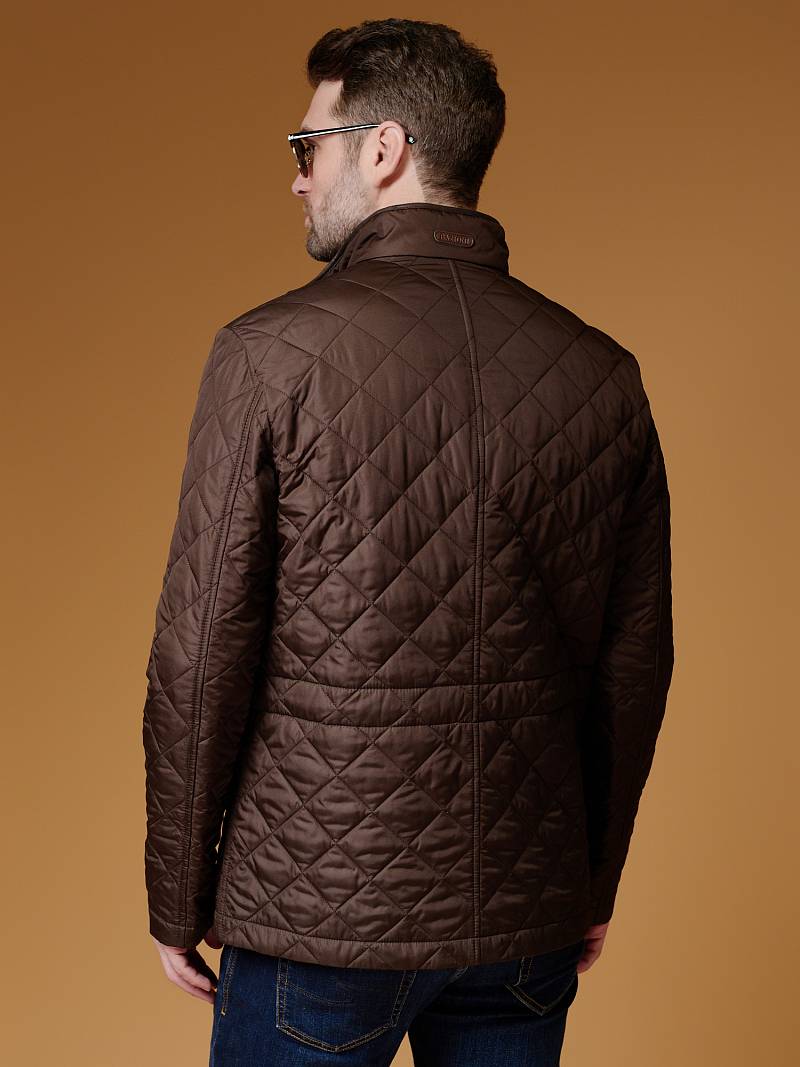 Куртка мужская из стеганой ткани, без подкладки. Все внутренние швы окантованы. Отделочная ткань-рамки карманов, окантовка борта и воротника, нижняя часть клапана, планка под нижние детали кнопки, Центральная застежка на молнию и кнопки. Воротник-стойка. Боковые карманы "в рамку" с клапаном, На линии талии кулиска, регулирующая обхват талии. Спинка со средним швом. Рукава втачные. На левом рукаве и на стойке - нашивки с логотипом. Два внутренних накладных кармана на пуговицах. Утеплитель- синтепон 100г.