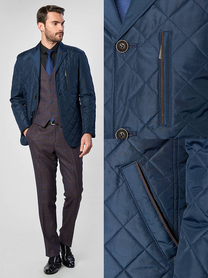 Куртка мужская из стеганой ткани с отделкой из замши, Длина по спинке для размера 50/176 - 77см. Ткань верха: 100%полиэстер. Подкладка: 100%полиэстер. Утеплитель: термоплюс 100 гр.