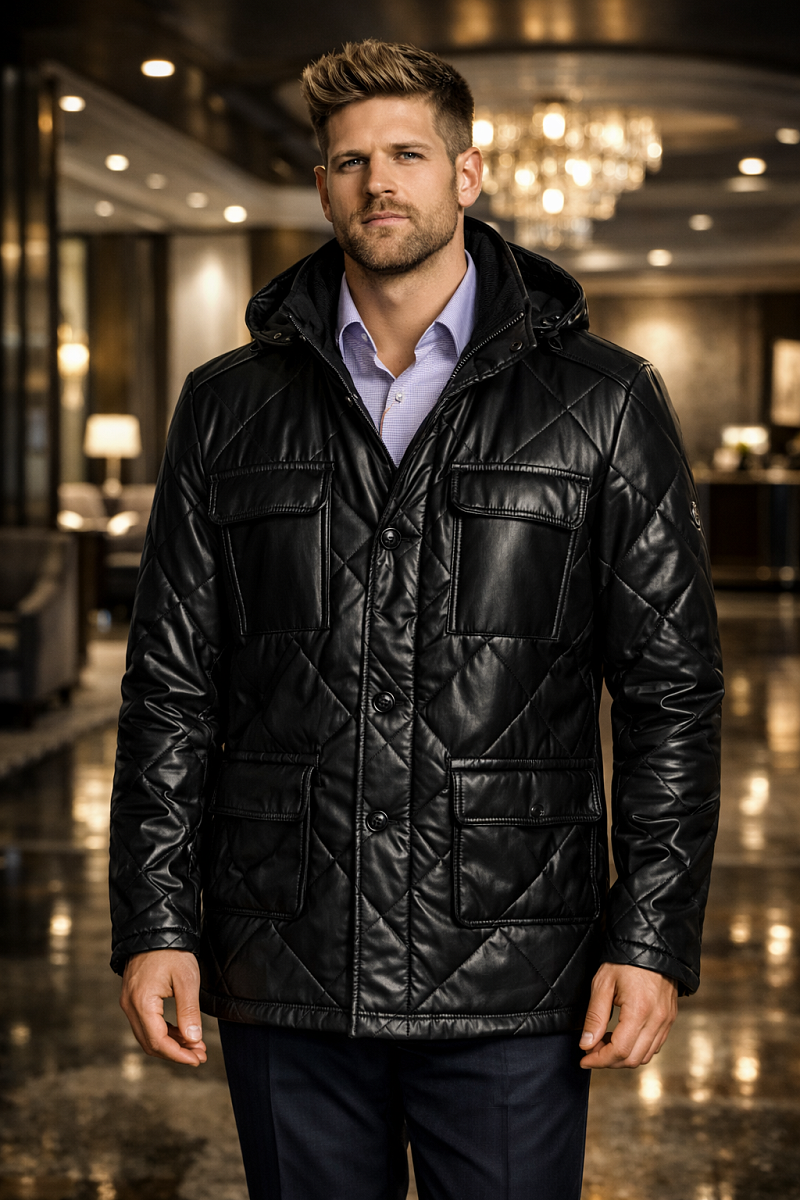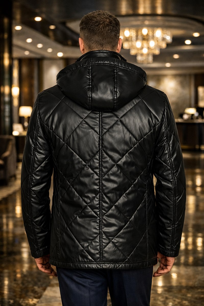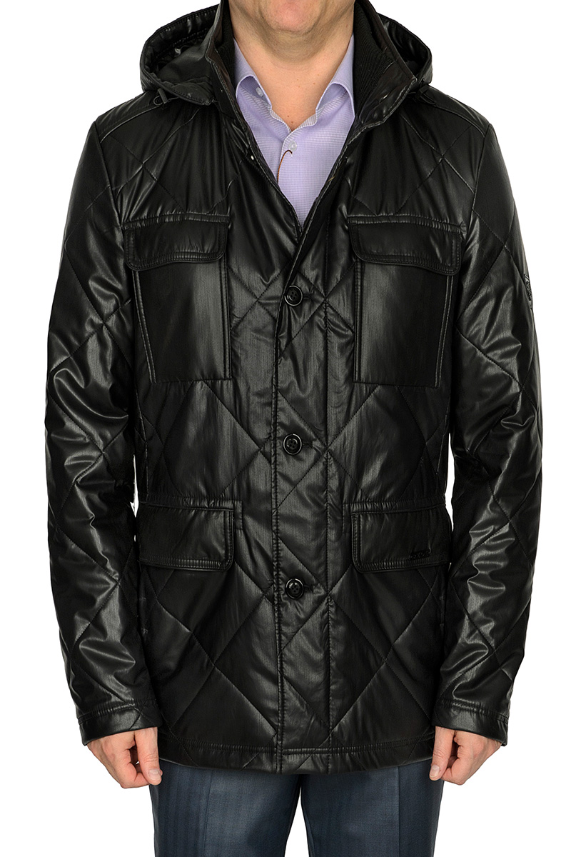 Куртка мужская из стеганой ткани, застёжка на пуговицах, воротник стойка, боковые карманы прорезные с клапаном, нагрудные карманы накладные с клапаном.