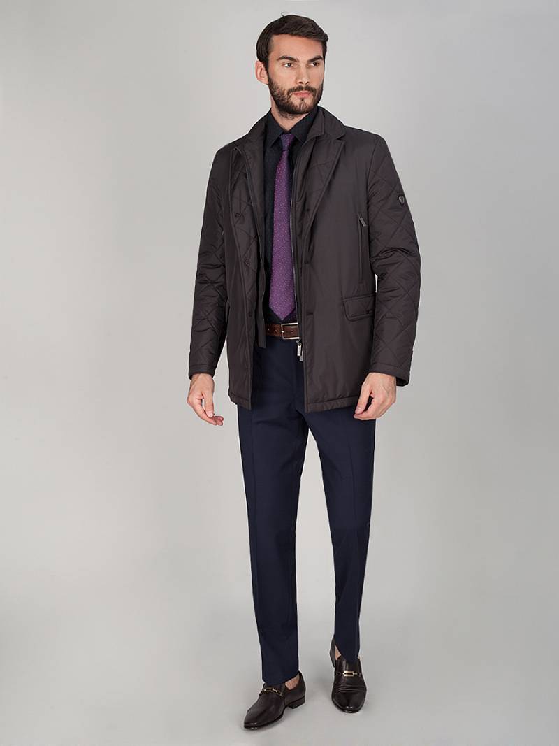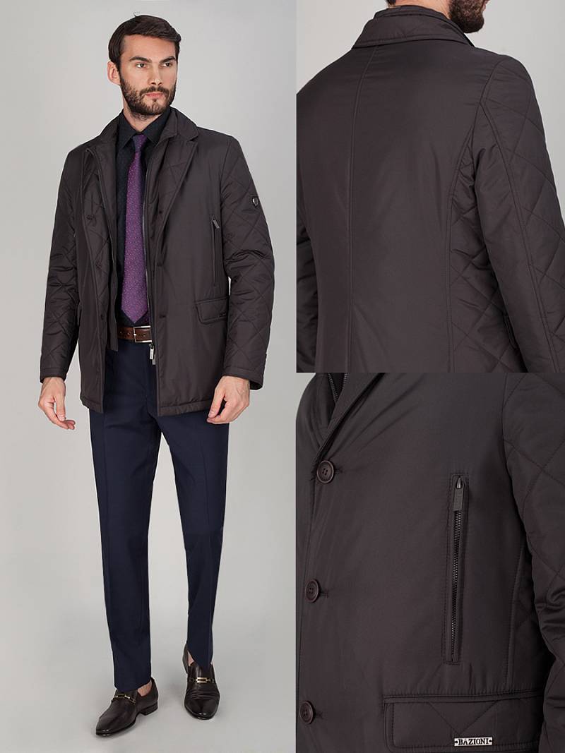 Мужская куртка-пиджак из плащевой ткани с лацканами и манишкой на молнии. застёжка на пуговицы, Рукава, воротник, лацканы, боковые части, клапаны из-стеганной ткани. Воротник - на манишке-стойка, Карманы нагрудные-"в рамку" с молнией, боковые карманы-"в рамку" с клапаном+боковые карманы "в шве". Нижний воротник из отделочной ткани. В среднем шве спинки -шлица на потайных кнопках. Длина изделия по спинке для роста 176 - 78см. Ткань верха: 100%полиэстер. Подкладка: 100%полиэстер. Утеплитель: термоплюс 120гр