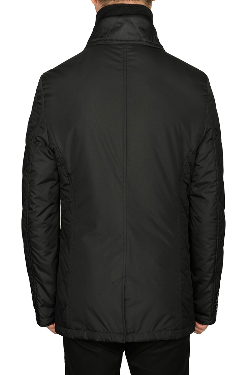 Мужская куртка-пиджак из плащевой ткани с лацканами и манишкой на молнии. застёжка на пуговицы, Рукава, воротник, лацканы, боковые части, клапаны из-стеганной ткани. Воротник - на манишке-стойка, Карманы нагрудные-"в рамку" с молнией, боковые карманы-"в рамку" с клапаном+боковые карманы "в шве". Нижний воротник из отделочной ткани. В среднем шве спинки -шлица на потайных кнопках. Длина изделия по спинке для роста 176 - 78см. Ткань верха: 100%полиэстер. Подкладка: 100%полиэстер. Утеплитель: термоплюс 120гр