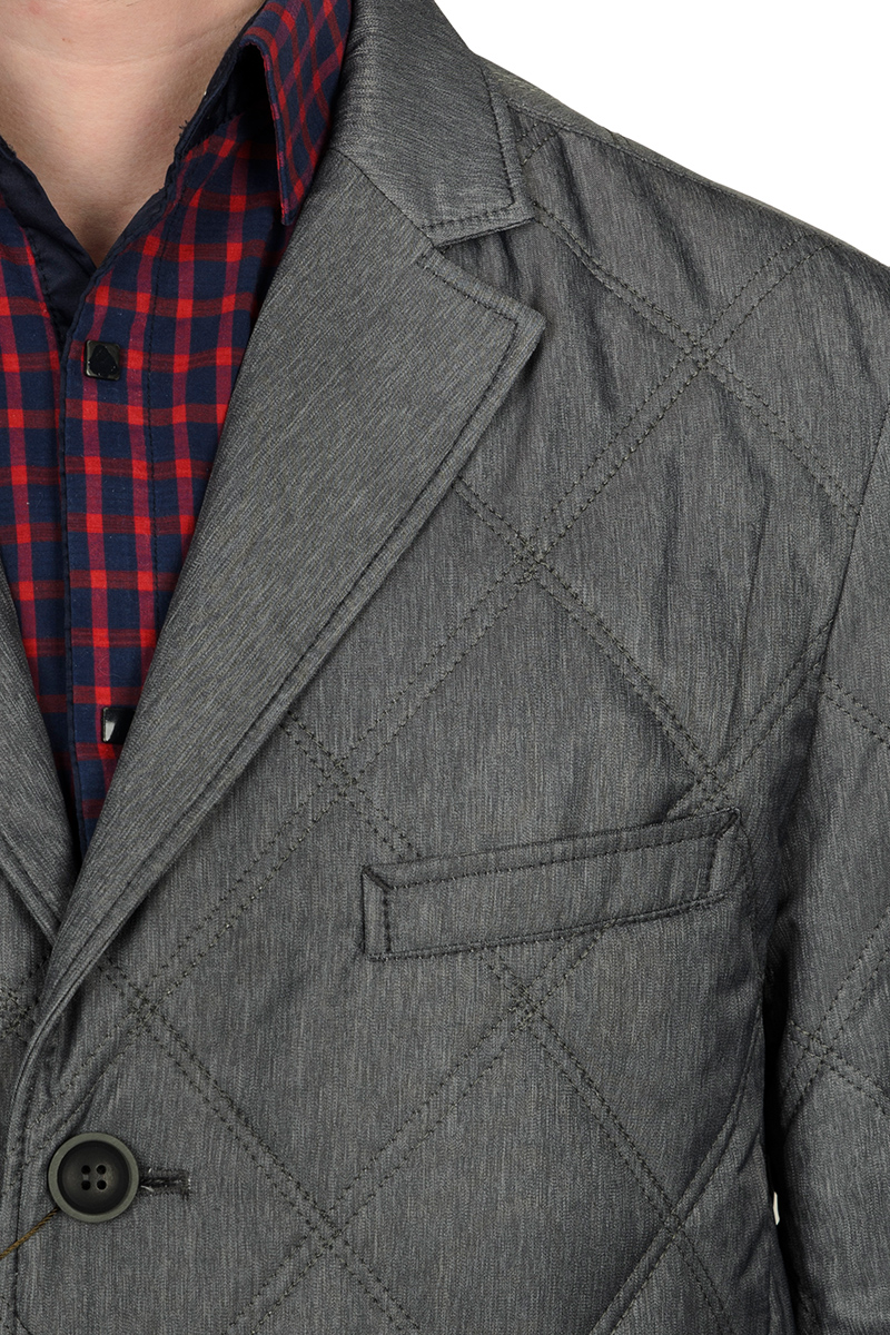 Куртка - пиджак мужской стёганый с утеплителем, Застёжка на три пуговицы, Карманы - с листочкой, на рукавах налокотники, Воротник - с лацканами. Длина изделия по спинке для роста 176 - 75см. Ткань верха: 100%полиэстер. Подкладка: 100%полиэстер. Утеплитель: термоплюс 80гр