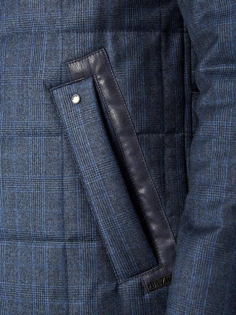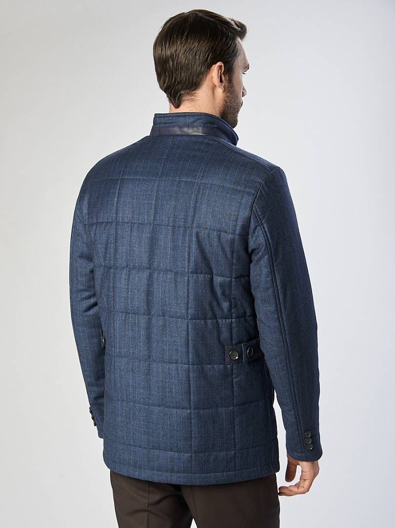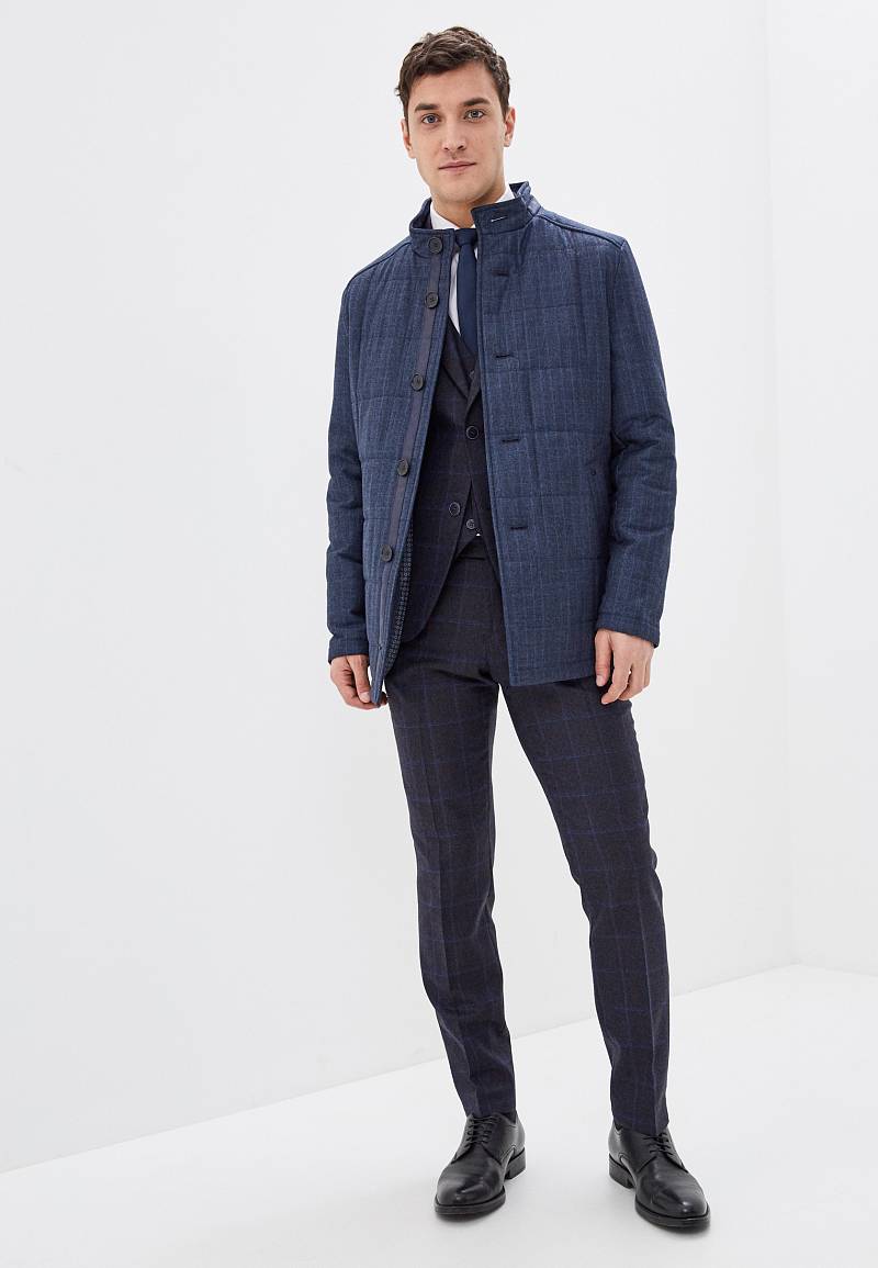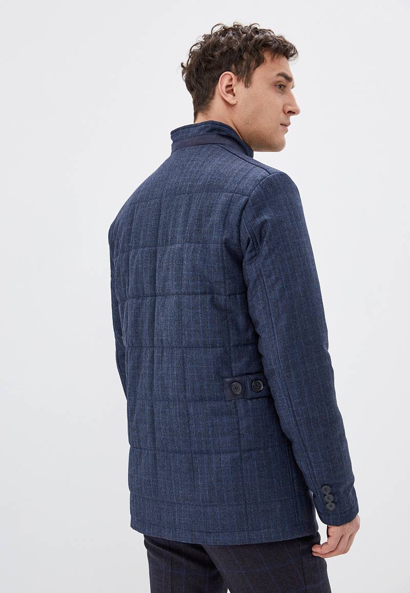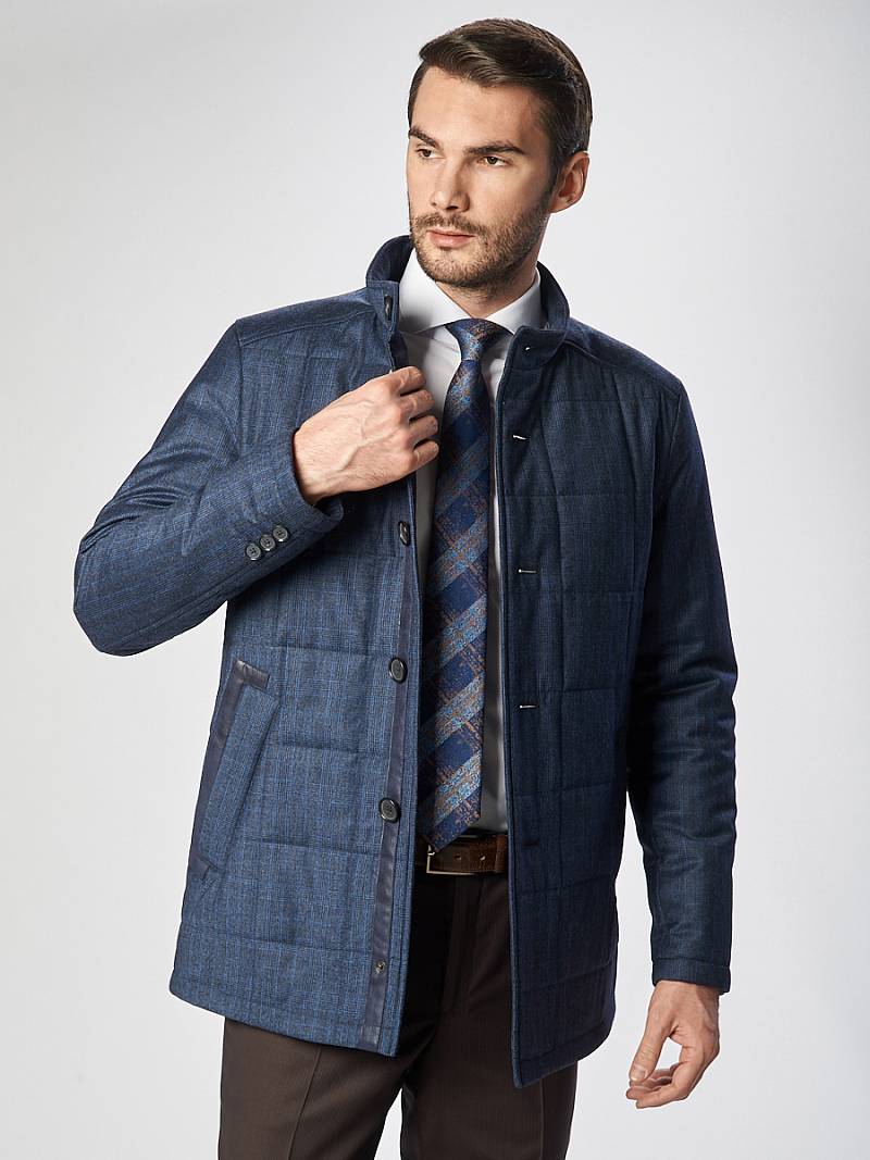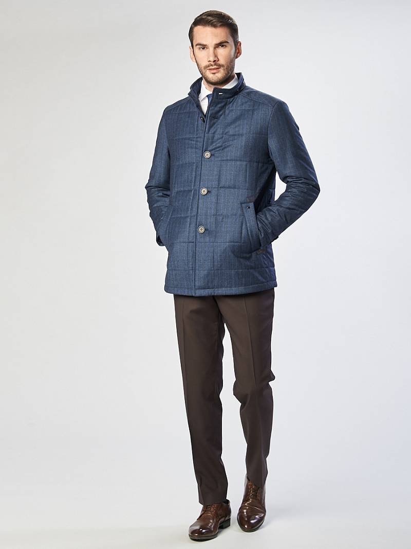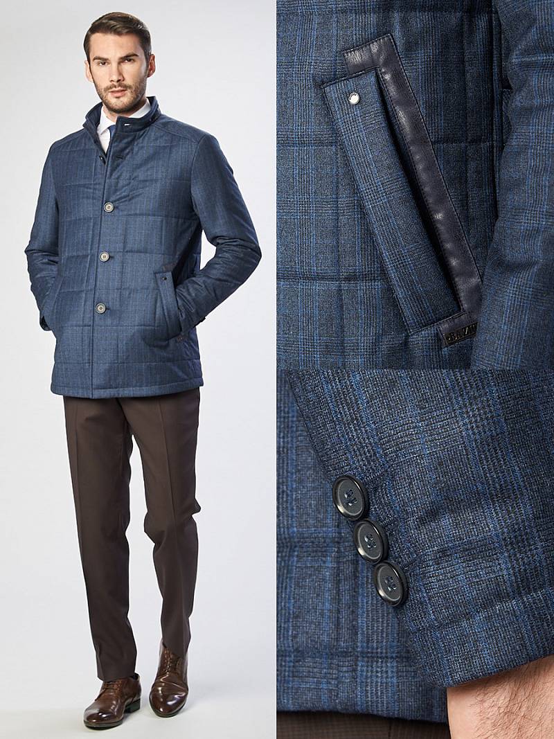 Куртка мужская из стеганой ткани, застёжка на пуговицы, Воротник стойка. Карманы листочки на магнитах. Вертикальная стежка на кокетках полочек и на рукавах в области налокотника. Нижняя деталь воротника, верхняя листочка и паты на спинке выполнены из отделочной ткани. Длина изделия по спинке для роста 50/176 - 78см. Ткань верха: 100%шерсть. Подкладка: 100%полиэстер. Утеплитель: 100гр