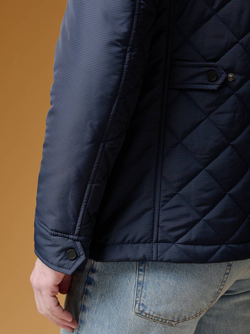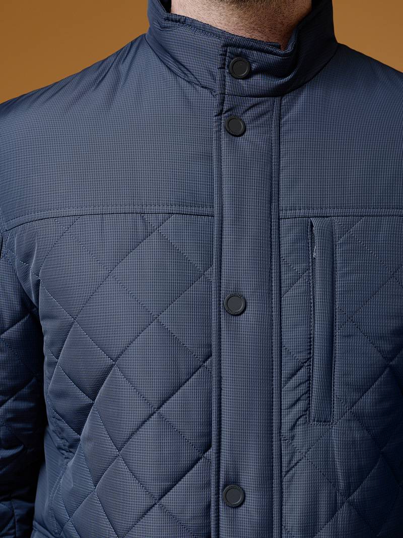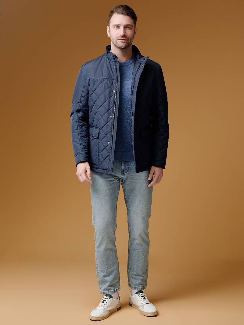 Куртка мужская стеганная утепленная. Центральная застежка на молнию закрытую ветрозащитной планкой на кнопках. Воротник-стойка. Полочка и спинка с отрезными кокетками. На полочках накладные боковые карманы с клапаном и 1 нагрудный карман с молнией. Рукав втачной двухшовный, в нижней части манжеты рукава на кнопках. В области талии на спинке расположены паты регулирующие обхват талии. Длина изделия по спинке для роста 176 - 75см. Ткань верха: 100%полиэстер. Подкладка: 100%полиэстер. Утеплитель: термоплюс 100гр