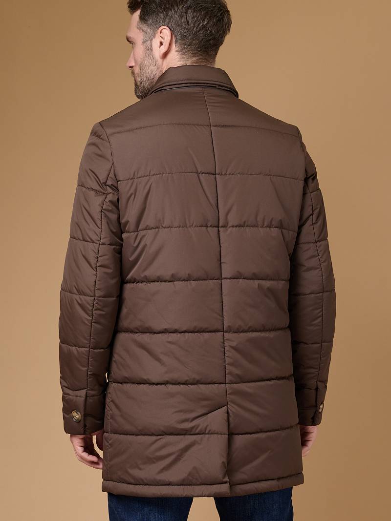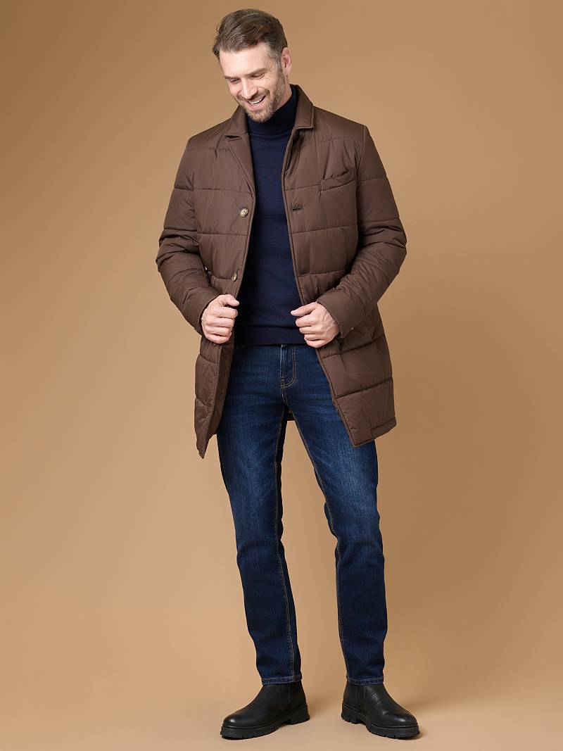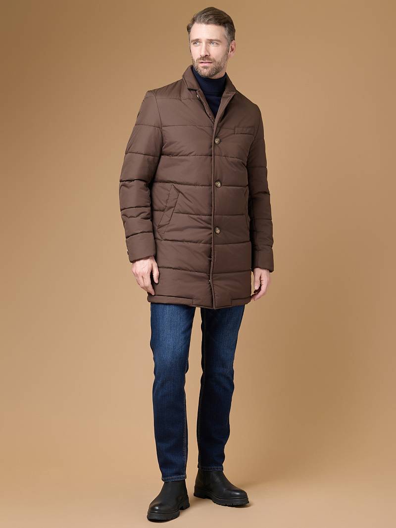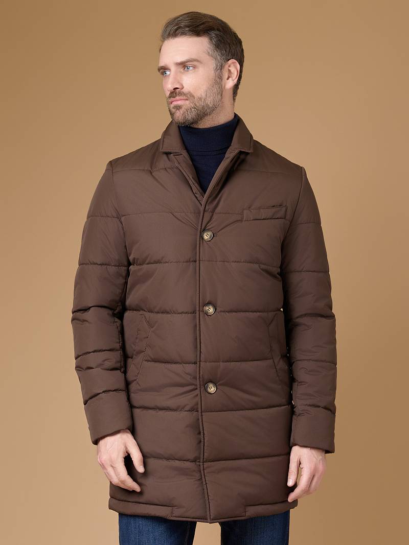 Мужская куртка - пальто утепленная с английским воротником - лацканами, из плащевой пуходержащей ткани c водоотталкивающей пропиткой, которая защищает от ветра, холода и дождя. Ткань верха плотная, практичная, не мнется. Застежка изделия на пуговицы. Полочки и спинка простеганы, на полочках - два кармана с листочками на скрытых магнитах. Спинка со шлицей. Рукава втачные с локтевыми швами. На подкладке - два внутренних кармана на молнии для удобного хранения документов. Утеплитель в изделии характеризуется легким весом, гигиеничностью и гипоаллергенностью, высокими теплоизоляционными качествами, экологичностью и безопасностью. Эластичный материал позволяет комфортно двигаться. Он отталкивает воду и не промокает, сохраняет тепло. Изделие подходит для ежедневного пользования. Длина по спинке - 90см. Ткань верха: 100%полиэстер. Подкладка: 100%полиэстер. Утеплитель: термоплюс 150гр/150гр.
